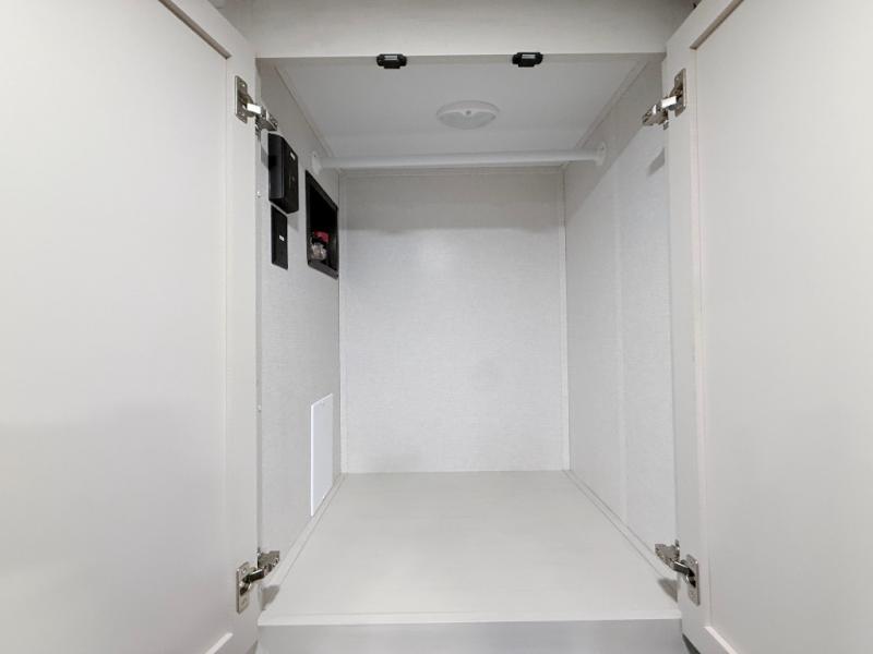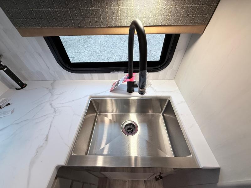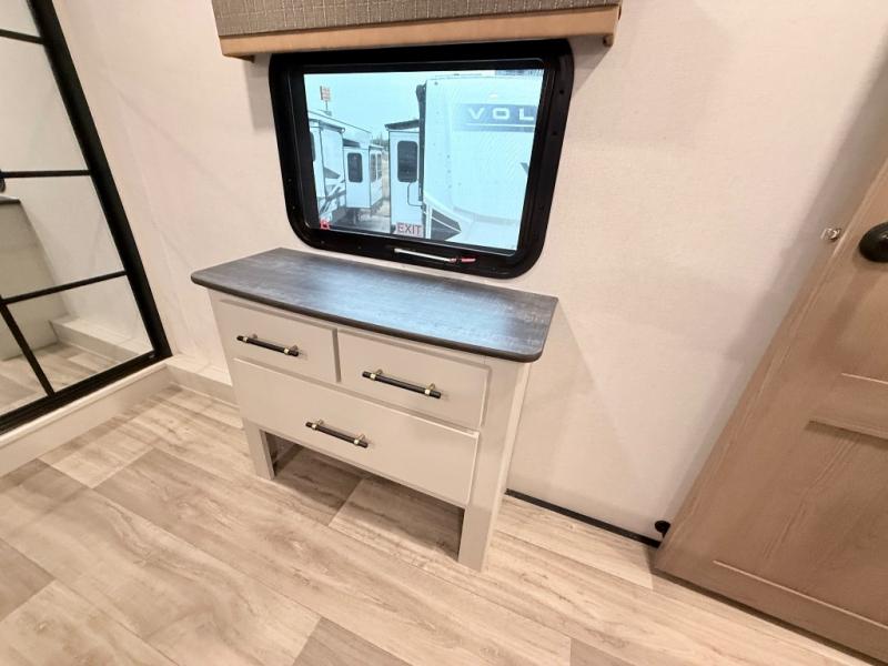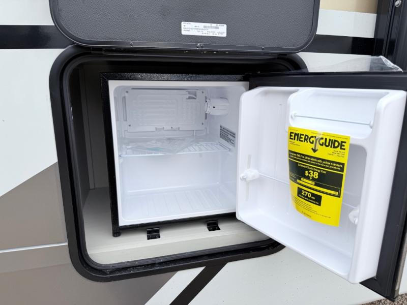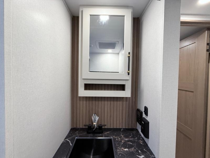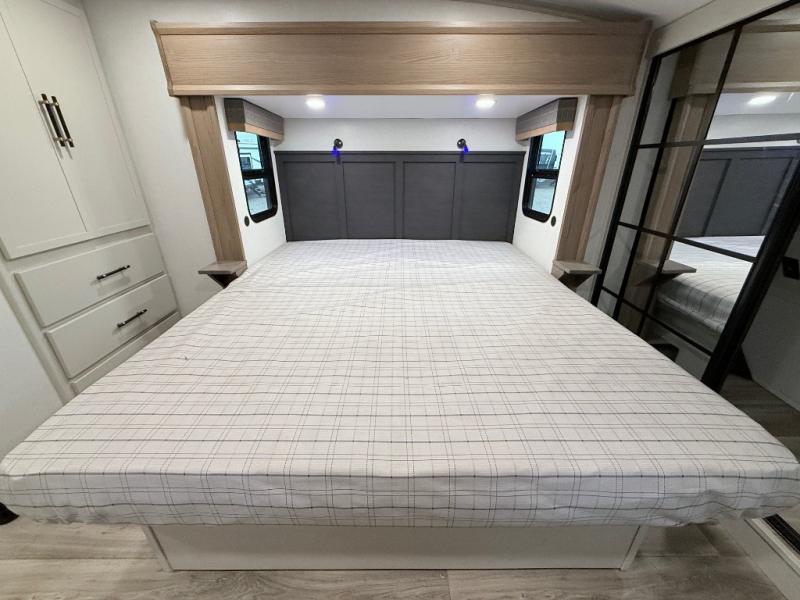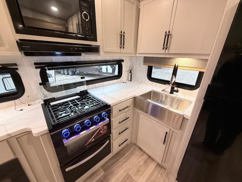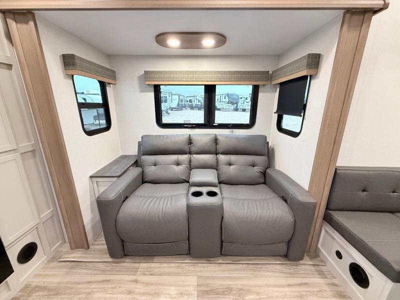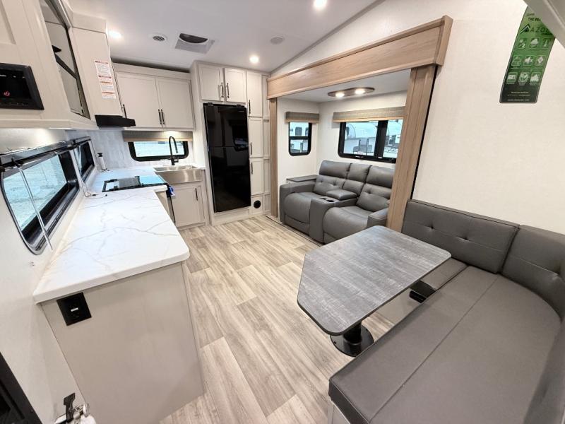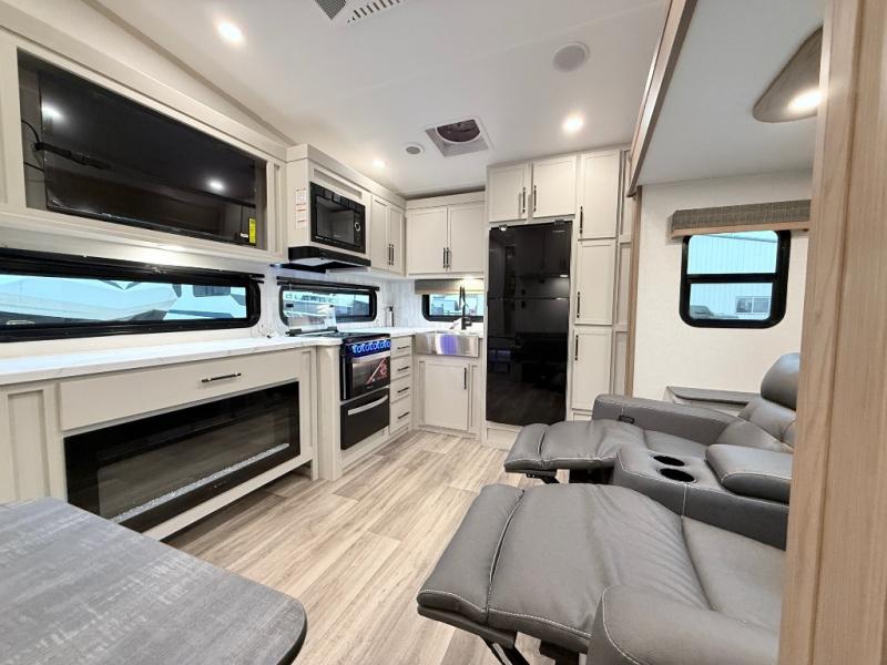Plan to say awhile in this rear kitchen fifth wheel! You will fall in love with the front bedroom with a king bed slide out, large front closet, a dresser, plus a mounted TV for movies in bed. The rear kitchen includes plenty of space to prep meals, a farm style sink, plus a 10 cu. ft. 12V refrigerator and a pantry for food storage! You can get cozy on the theater seating slide out or at the cafe dinette, and the LED TV will ensure you'll never go bored on rainy days!