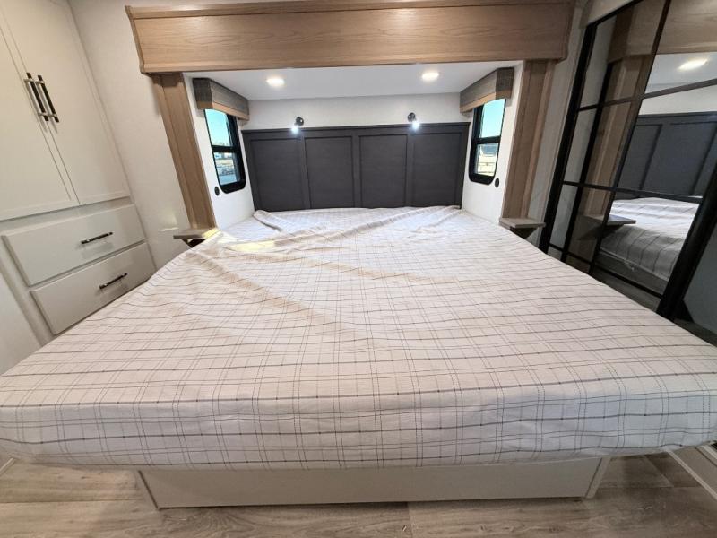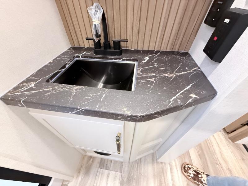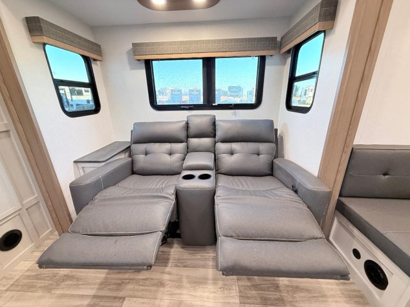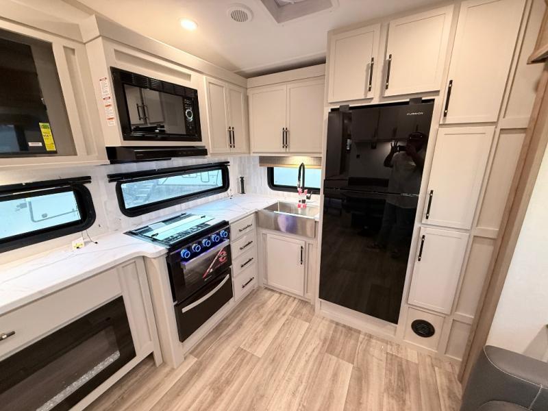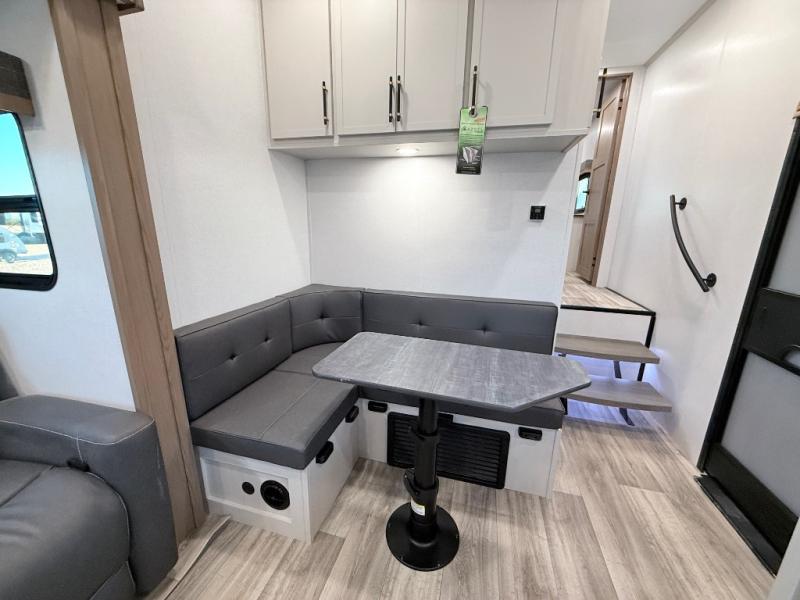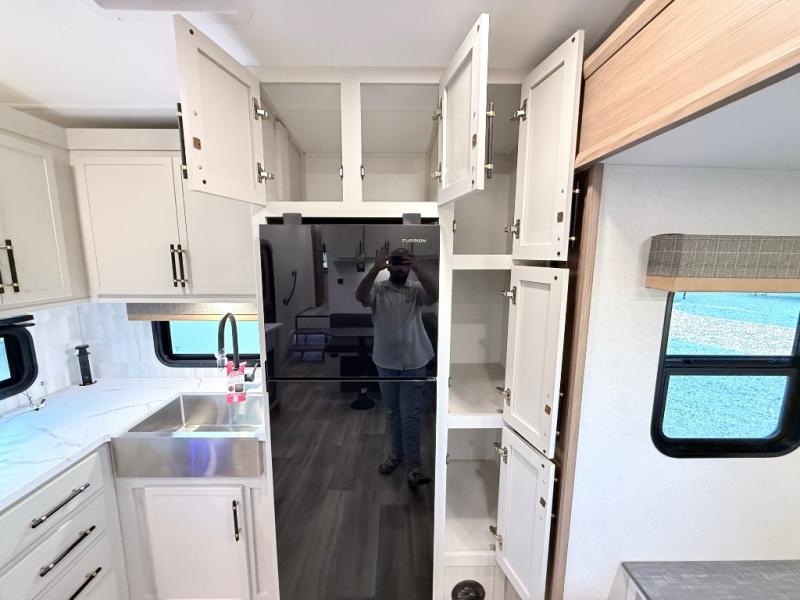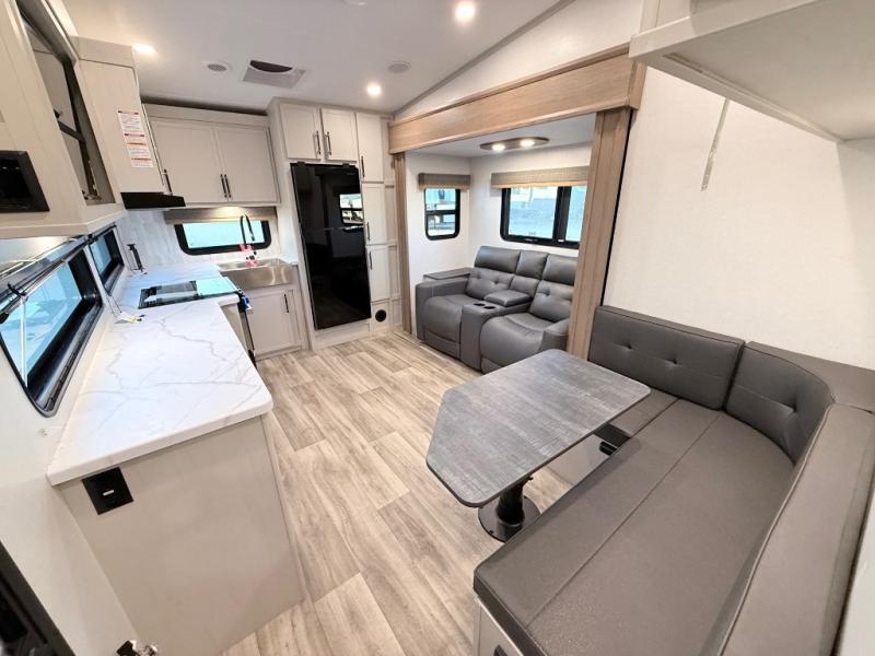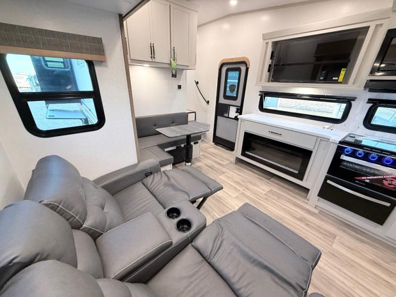 Plan to say awhile in this rear kitchen fifth wheel! You will fall in love with the front bedroom with a king bed slide out, large front closet, a dresser, plus a mounted TV for movies in bed. The rear kitchen includes plenty of space to prep meals, a farm style sink, plus a 10 cu. ft. 12V refrigerator and a pantry for food storage! You can get cozy on the theater seating slide out or at the cafe dinette, and the LED TV will ensure you'll never go bored on rainy days!