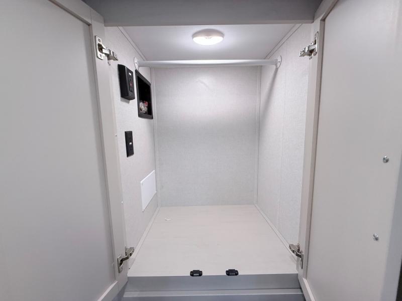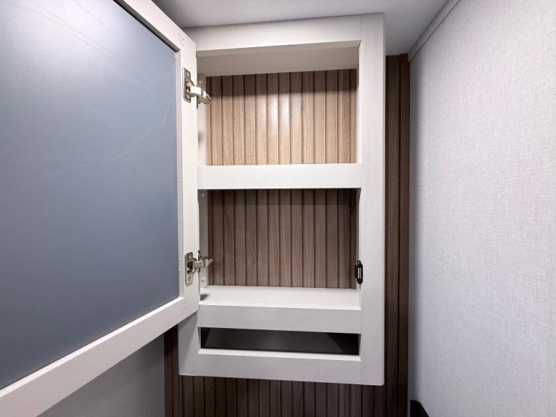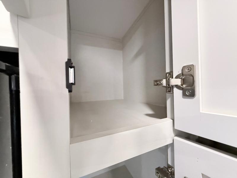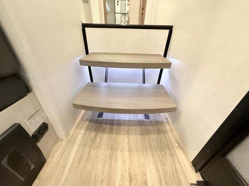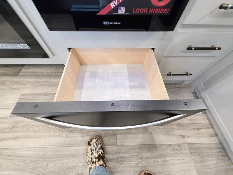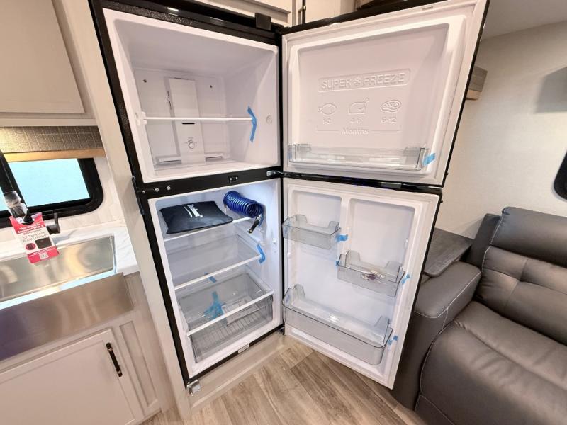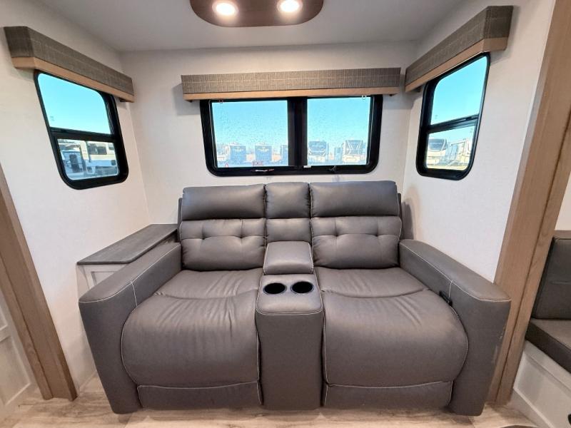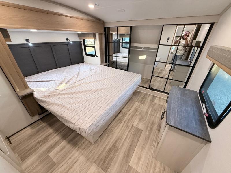 Plan to say awhile in this rear kitchen fifth wheel! You will fall in love with the front bedroom with a king bed slide out, large front closet, a dresser, plus a mounted TV for movies in bed. The rear kitchen includes plenty of space to prep meals, a farm style sink, plus a 10 cu. ft. 12V refrigerator and a pantry for food storage! You can get cozy on the theater seating slide out or at the cafe dinette, and the LED TV will ensure you'll never go bored on rainy days!
