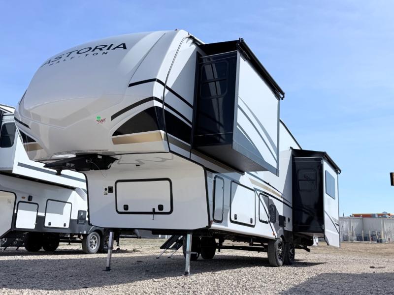 Each one of these Dutchmen RV Astoria Half-Ton fifth wheels feature a fiberglass exterior for added durability and an All Weather Thermal Package so you can camp all year long! There are also MorRyde Solid entry steps, slam latch baggage doors, and many more exterior conveniences. You'll enjoy a 200W solar panel for off-grid capabilities, slam latch baggage doors, and a power awning with LED lights for an inviting outdoor space. The interior is designed with bathroom backsplash, night shades throughout the living area, and Thomas Payne furniture collection. The on-demand tankless water heater will provide endless hot showers, and the dual ducted A/C will keep you cool all summer long.