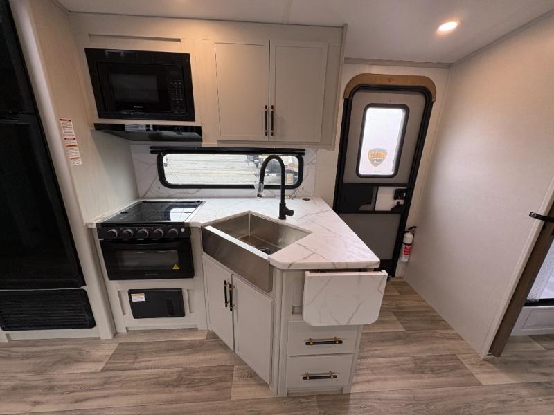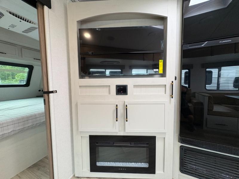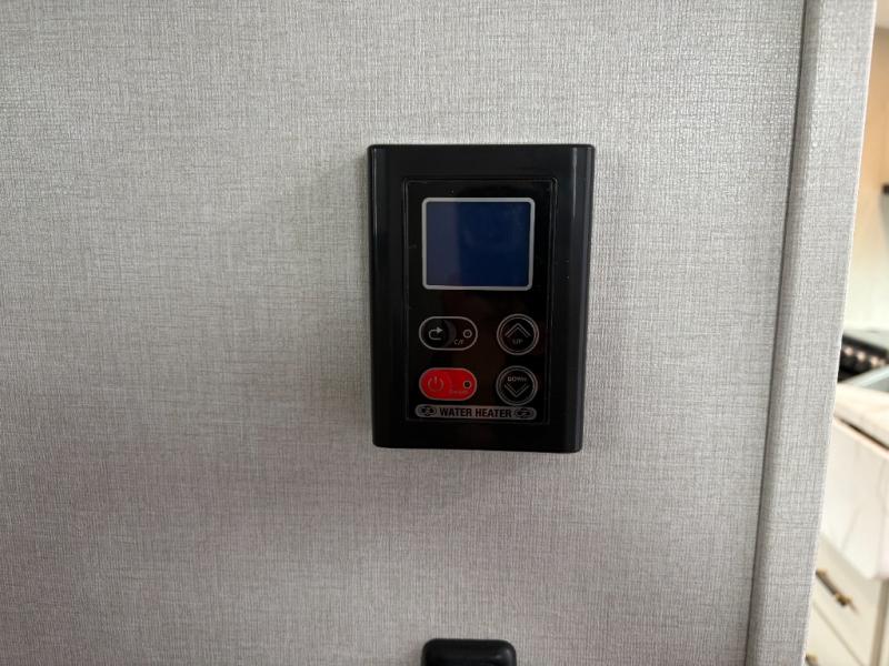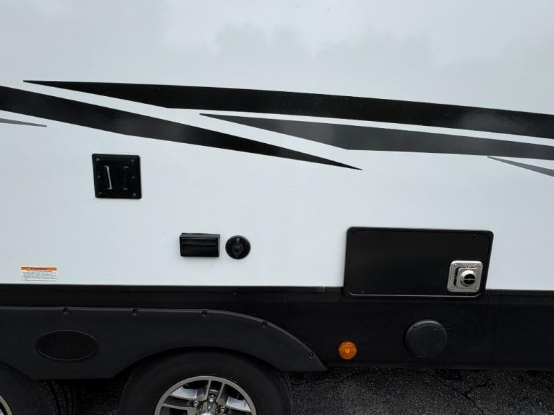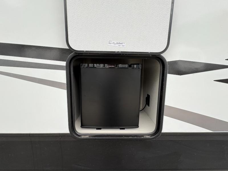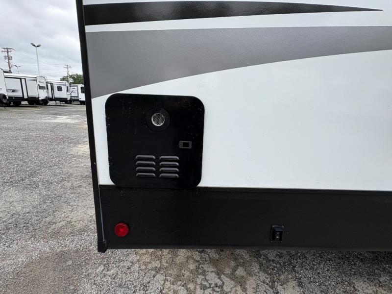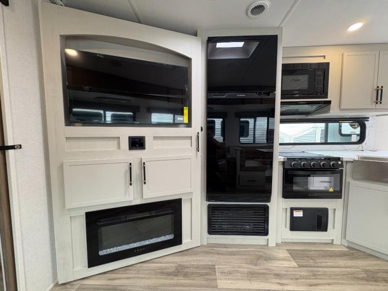 Enjoy relaxing weekends at the campground in this cozy travel trailer for five to six. The large slide will provide a spacious living area, and there is a U-shaped dinette and tri-fold sofa within the slide for seating and sleeping space. The hinged entertainment center hides the pantry, and the fireplace will make it feel more like home. Prepare home cooked meals on the three burner range, or use the microwave oven. You'll find the countertop extension will provide more space to prep meals, and the 10 cu. ft. double door refrigerator can store your perishables for the whole weekend. This model also includes a spacious full rear bath with dual bath sinks so two can get ready at the same time, and you'll love the front private bedroom with a king bed for all-around comfort!