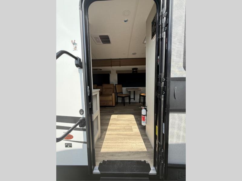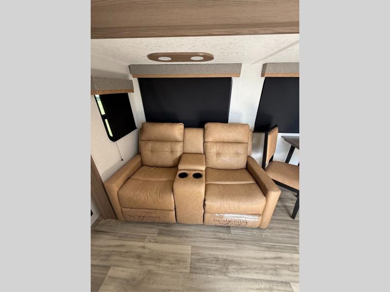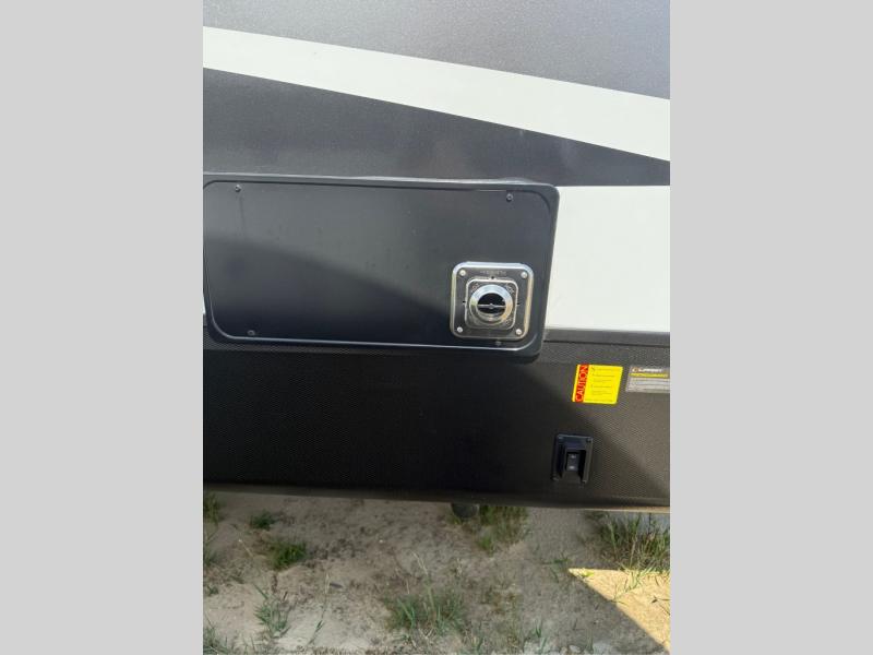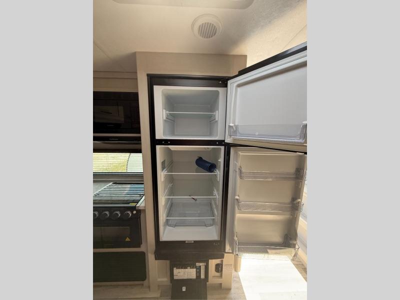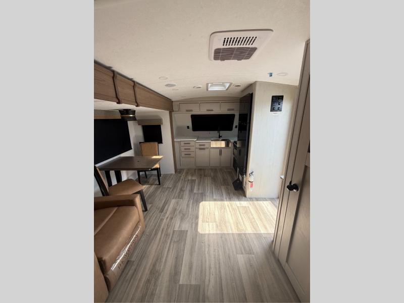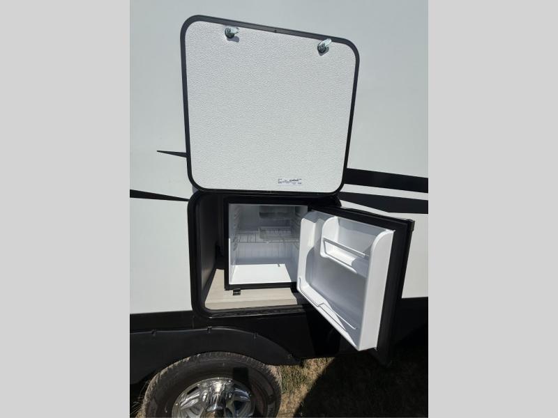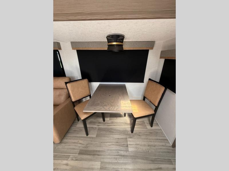 You will have everything you need for a comfortable camping trip with this travel trailer! It features a rear private bedroom with a king bed slide for more interior space and an entrance into the walk-through bathroom which will come in handy at night. The bathroom also has a dual sink vanity for two to get ready at once in the mornings. The front kitchen has plenty of countertop space to prepare your best meals and even a pull out trash can, and you can comfortably enjoy them at the U-shaped dinette, plus it can transform into an extra sleeping space for a guest or two to tag along. What better way to relax at night than on the tri-fold sofa across from the hinged entertainment center!