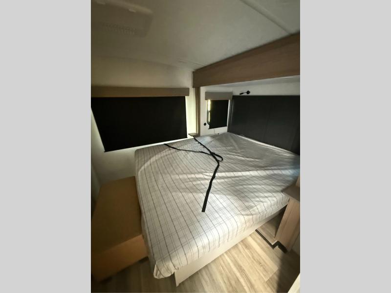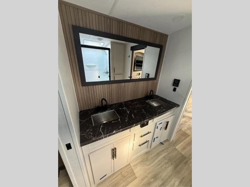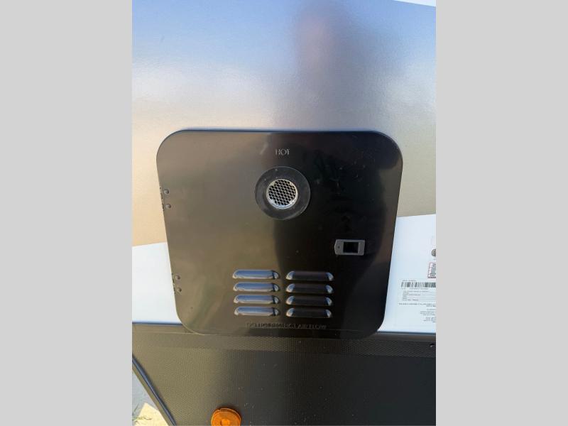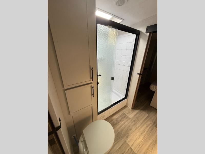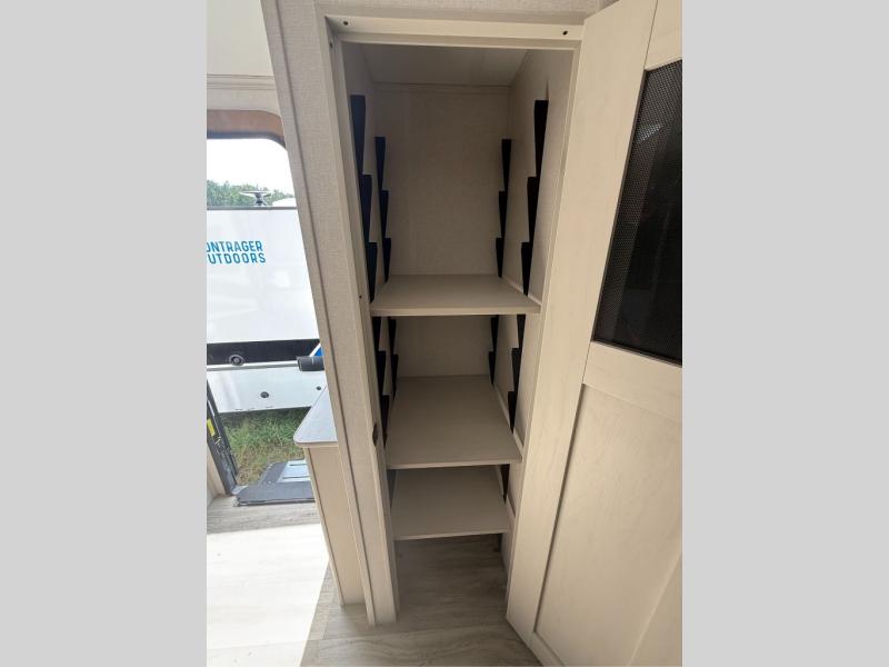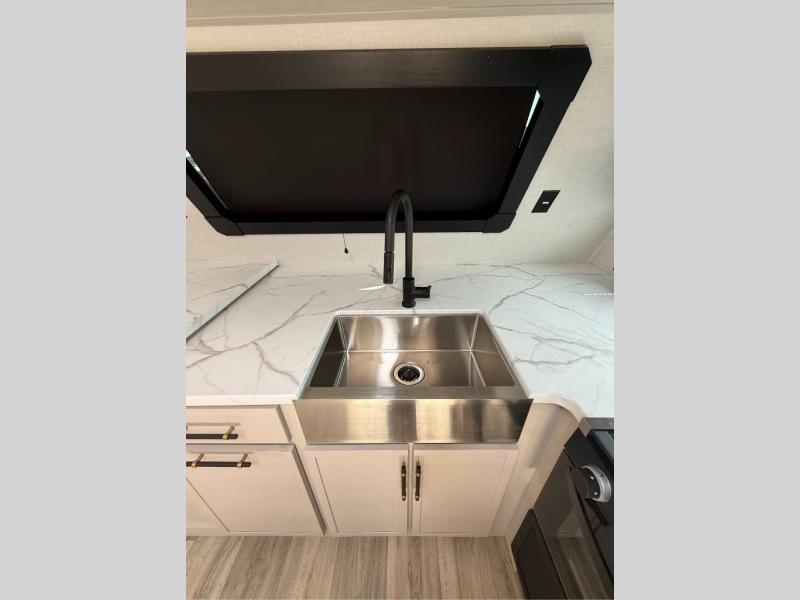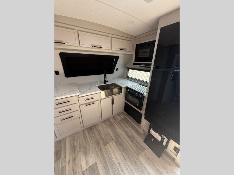 You will have everything you need for a comfortable camping trip with this travel trailer! It features a rear private bedroom with a king bed slide for more interior space and an entrance into the walk-through bathroom which will come in handy at night. The bathroom also has a dual sink vanity for two to get ready at once in the mornings. The front kitchen has plenty of countertop space to prepare your best meals and even a pull out trash can, and you can comfortably enjoy them at the U-shaped dinette, plus it can transform into an extra sleeping space for a guest or two to tag along. What better way to relax at night than on the tri-fold sofa across from the hinged entertainment center!