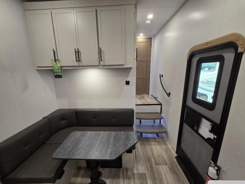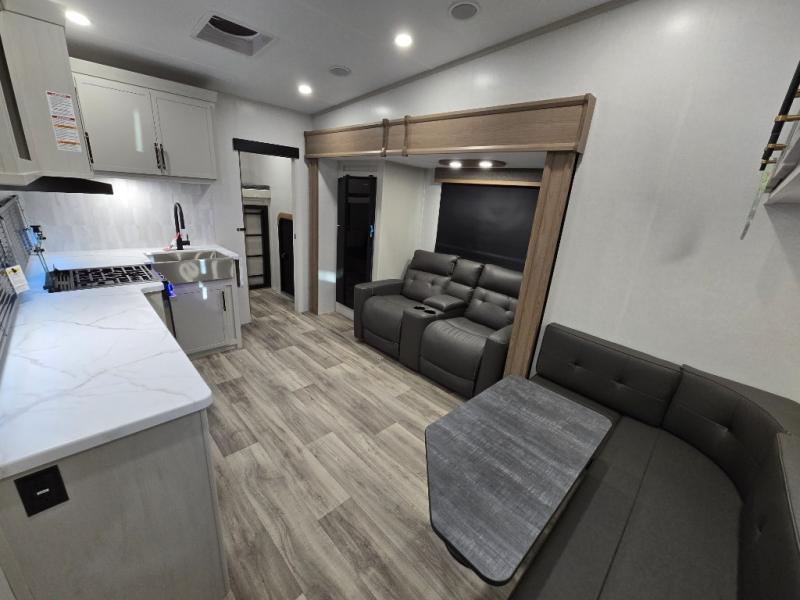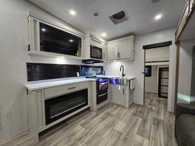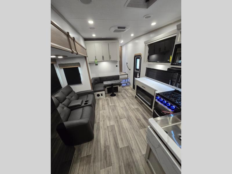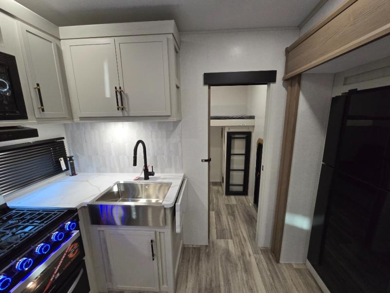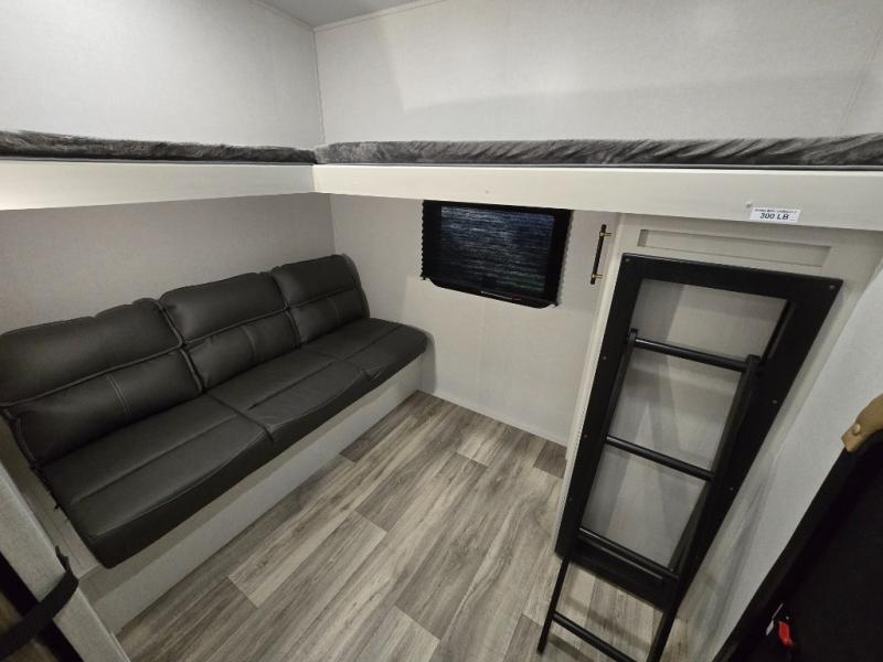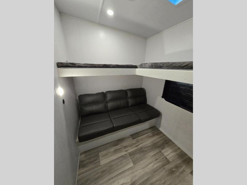 You'll enjoy every minute in this cozy fifth wheel. There is a front private bedroom with a queen bed, dual closets, and a closet with washer and dryer prep that will make your space feel just like home. Your guests will love having the rear private bunkhouse to themselves with three bunks, and there is a full bath on board so everyone can stay clean throughout your trip. The theater seating slide out in the living area/kitchen will provide more space to move about, plus there is a cafe dinette for more seating and dining space. An extra guest or two could even sleep on these areas! The chef of your group will find a full kitchen with a farm style sink, 10 cu. ft. double door refrigerator, and three burner range with an oven.