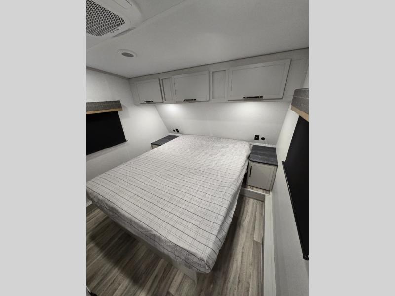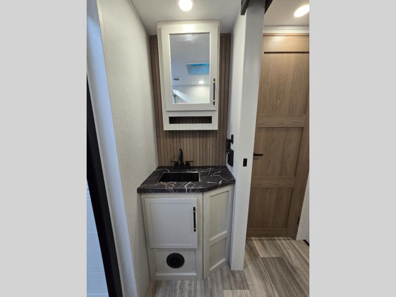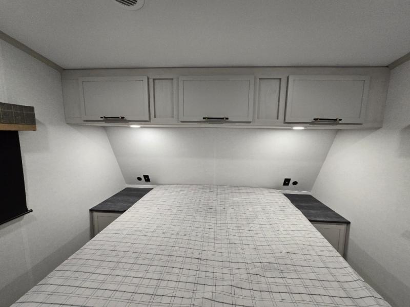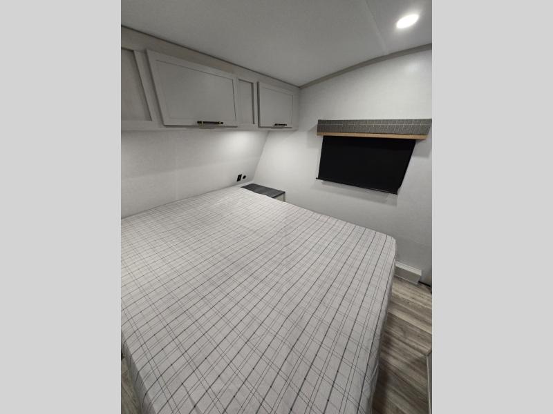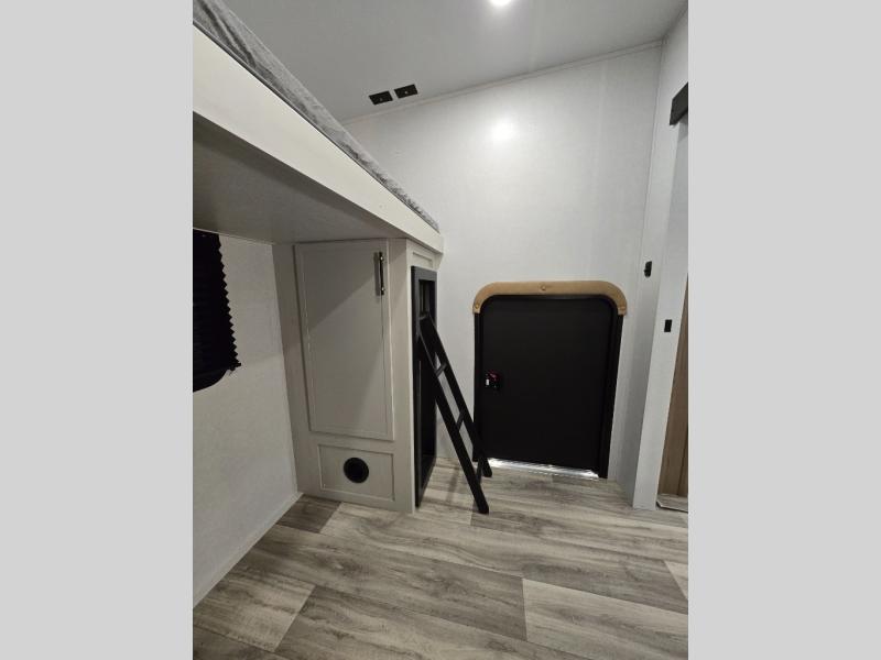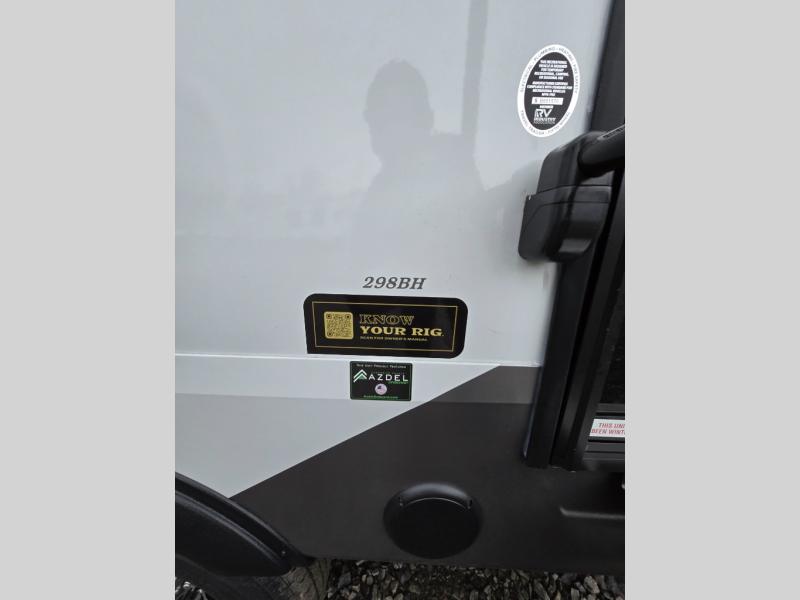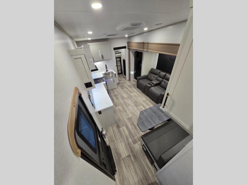 You'll enjoy every minute in this cozy fifth wheel. There is a front private bedroom with a queen bed, dual closets, and a closet with washer and dryer prep that will make your space feel just like home. Your guests will love having the rear private bunkhouse to themselves with three bunks, and there is a full bath on board so everyone can stay clean throughout your trip. The theater seating slide out in the living area/kitchen will provide more space to move about, plus there is a cafe dinette for more seating and dining space. An extra guest or two could even sleep on these areas! The chef of your group will find a full kitchen with a farm style sink, 10 cu. ft. double door refrigerator, and three burner range with an oven.