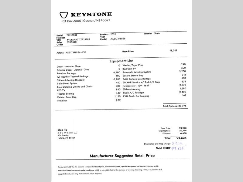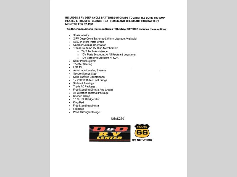 This Dutchmen Astoria Platinum Series fifth wheel 3173RLP includes these options: