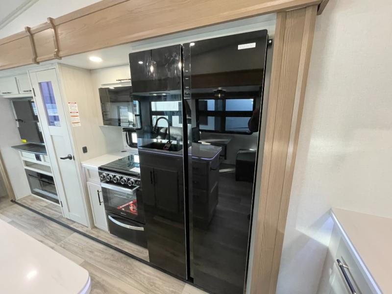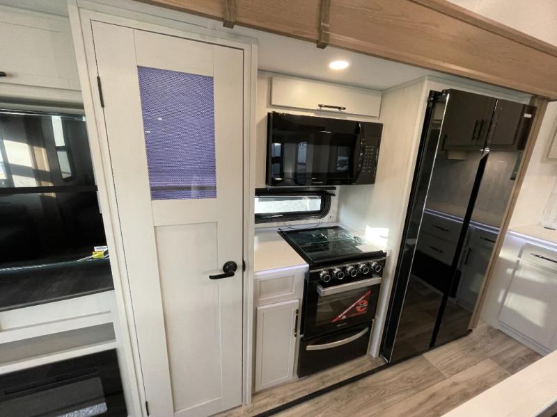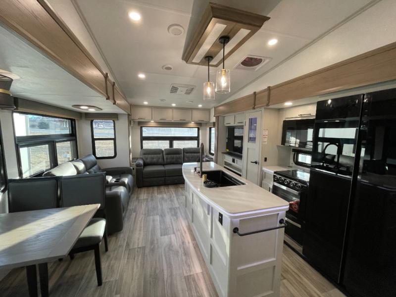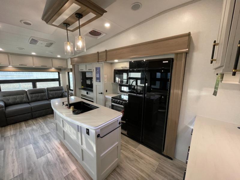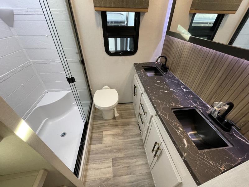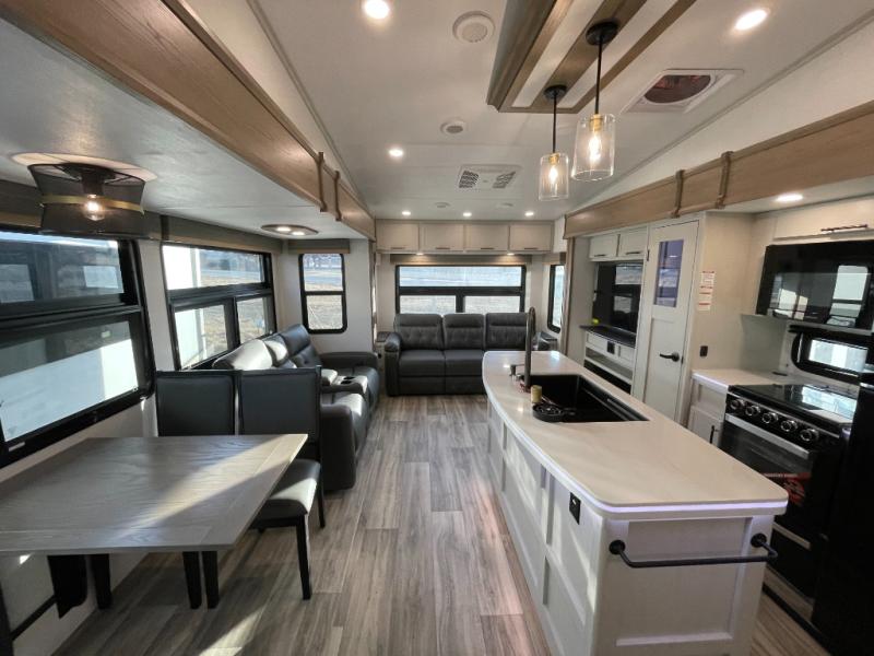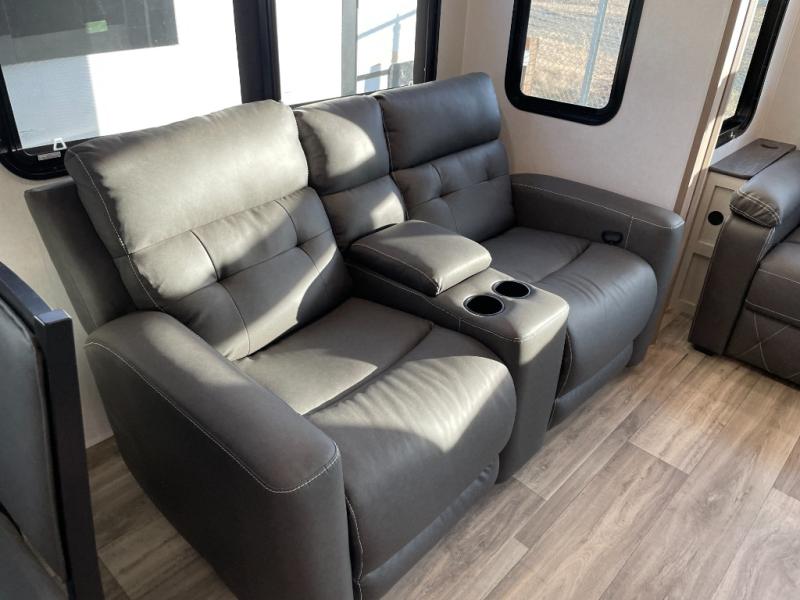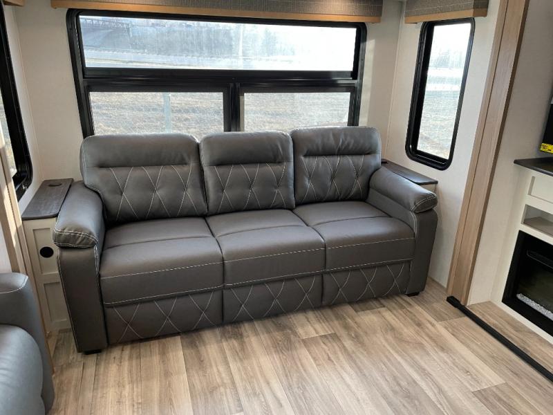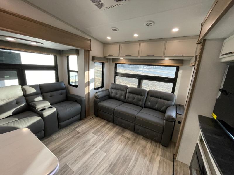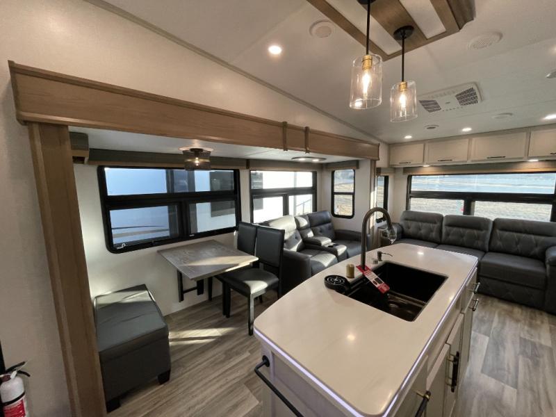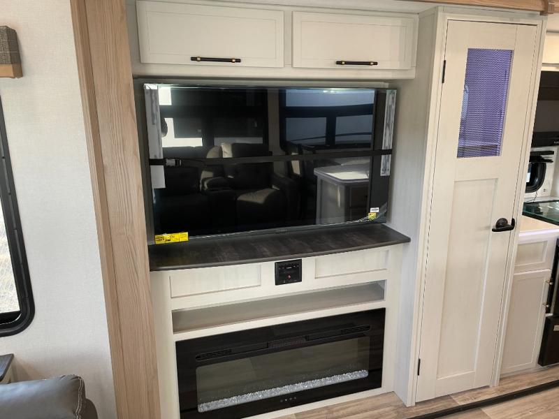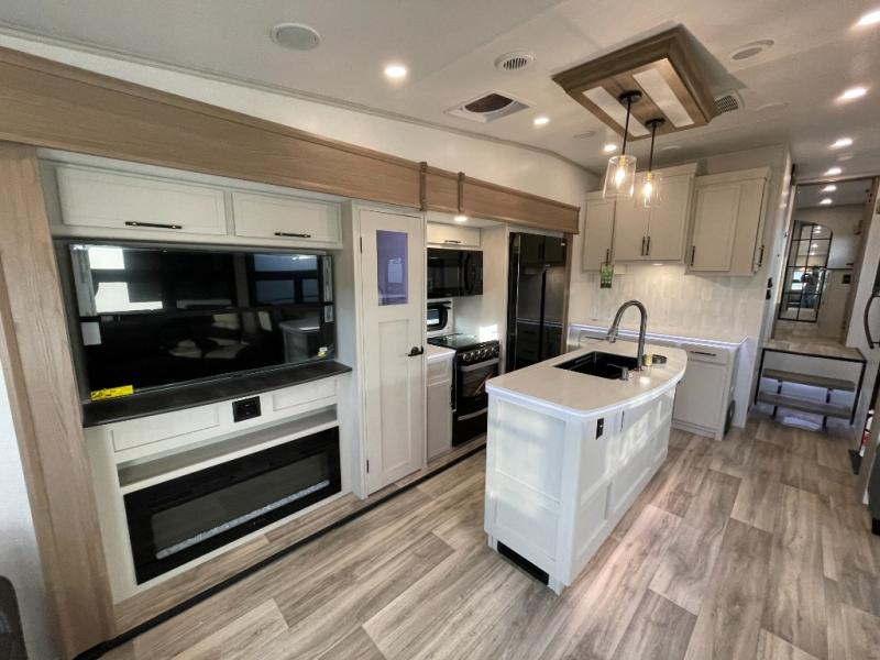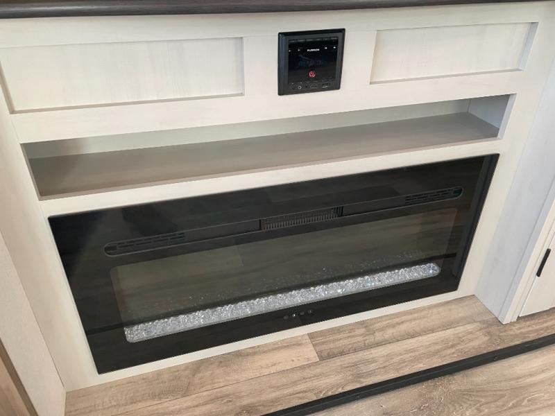 Two can get ready at once with a dual sink vanity in the full bathroom of this fifth wheel! Enjoy a good night's rest and interior space with the king bed slide in the front private bedroom which also has a front wardrobe to keep your clothes looking their best, and a closet with washer/dryer prep. The chef will have an easy time preparing meals in the kitchen with the island, the extra countertop space below the hutch, and the glass top three burner cooktop with the oven. The rear living area has a tri-fold sofa and theater seating across from an entertainment center with a fireplace and an HD LED TV!