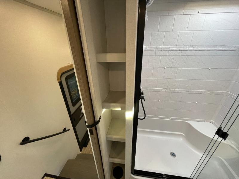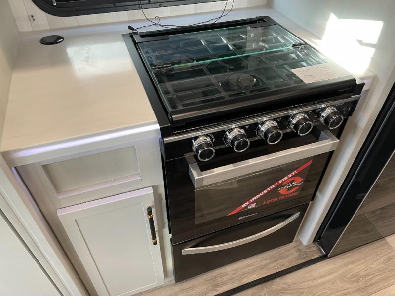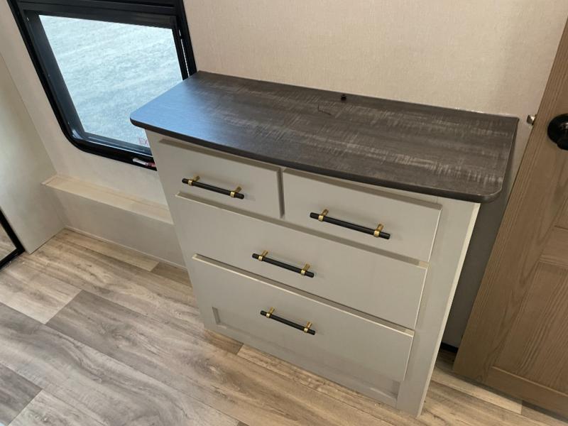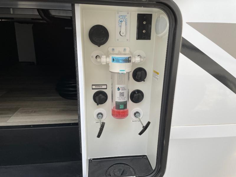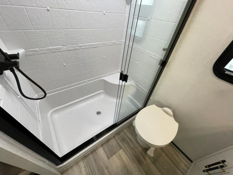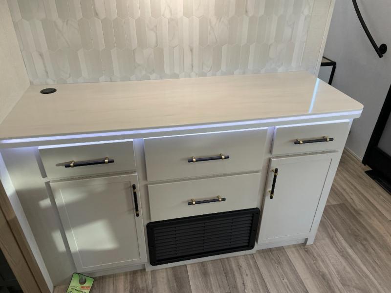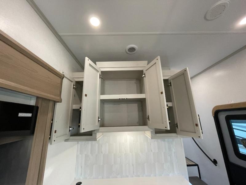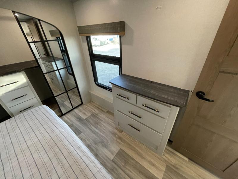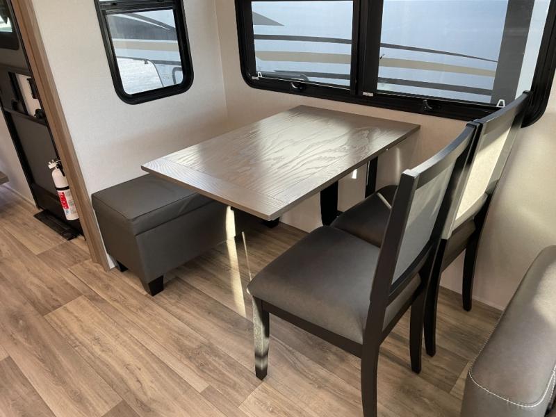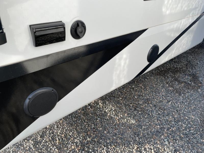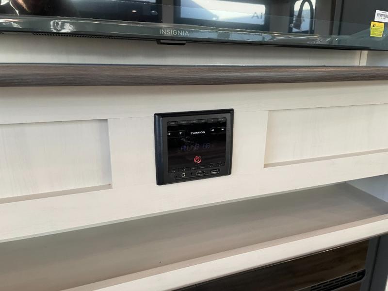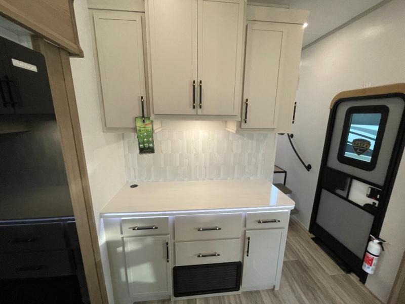 Two can get ready at once with a dual sink vanity in the full bathroom of this fifth wheel! Enjoy a good night's rest and interior space with the king bed slide in the front private bedroom which also has a front wardrobe to keep your clothes looking their best, and a closet with washer/dryer prep. The chef will have an easy time preparing meals in the kitchen with the island, the extra countertop space below the hutch, and the glass top three burner cooktop with the oven. The rear living area has a tri-fold sofa and theater seating across from an entertainment center with a fireplace and an HD LED TV!