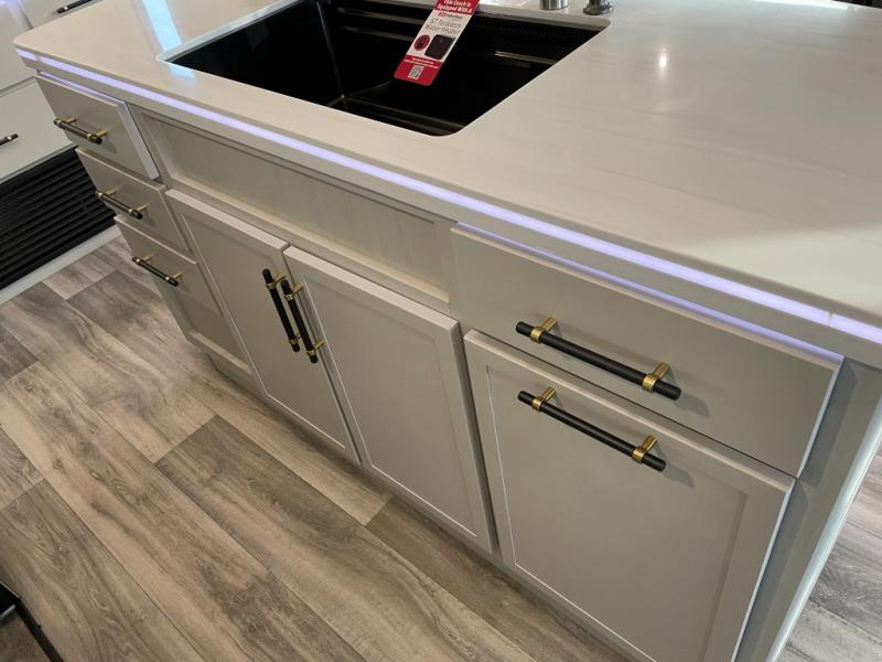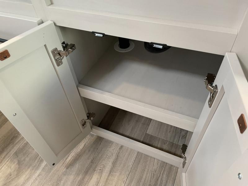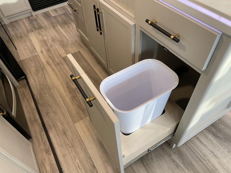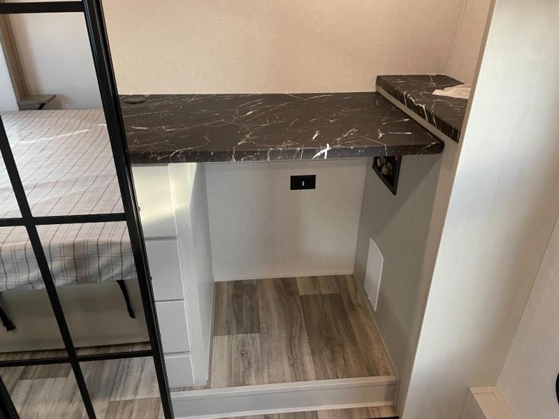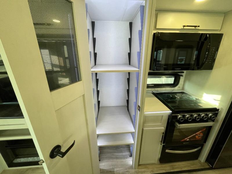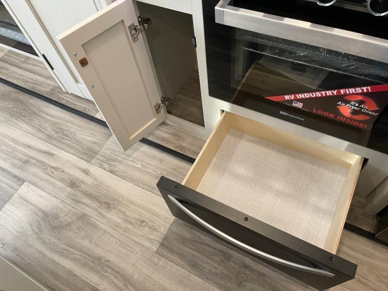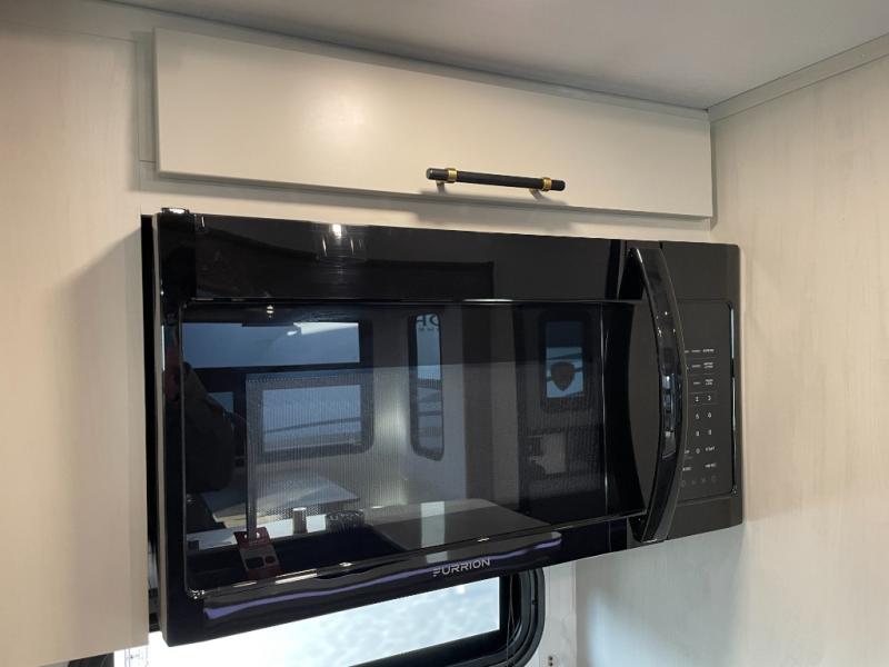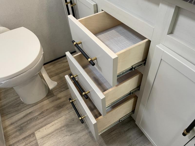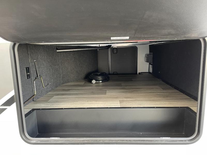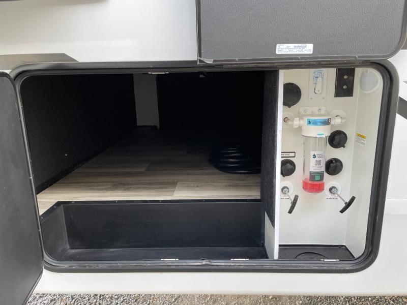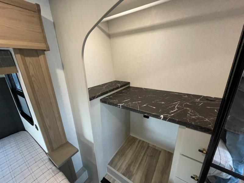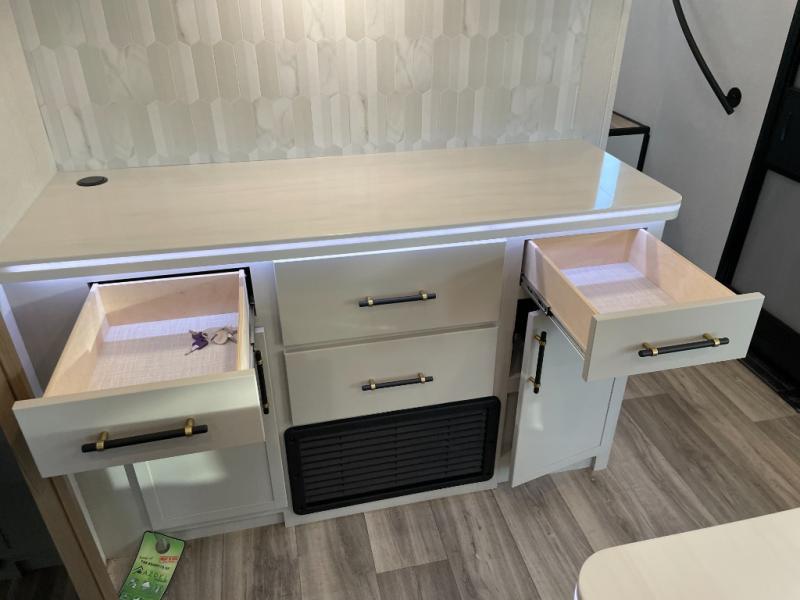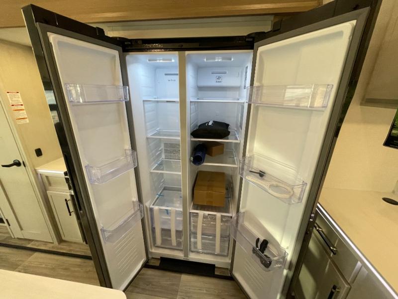 Two can get ready at once with a dual sink vanity in the full bathroom of this fifth wheel! Enjoy a good night's rest and interior space with the king bed slide in the front private bedroom which also has a front wardrobe to keep your clothes looking their best, and a closet with washer/dryer prep. The chef will have an easy time preparing meals in the kitchen with the island, the extra countertop space below the hutch, and the glass top three burner cooktop with the oven. The rear living area has a tri-fold sofa and theater seating across from an entertainment center with a fireplace and an HD LED TV!