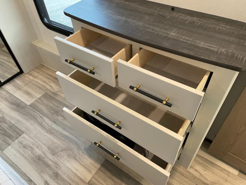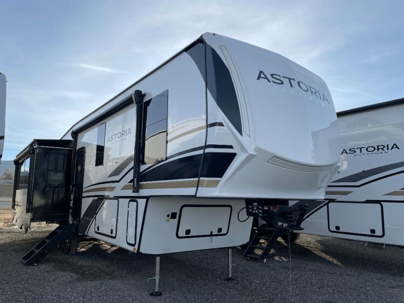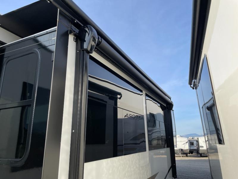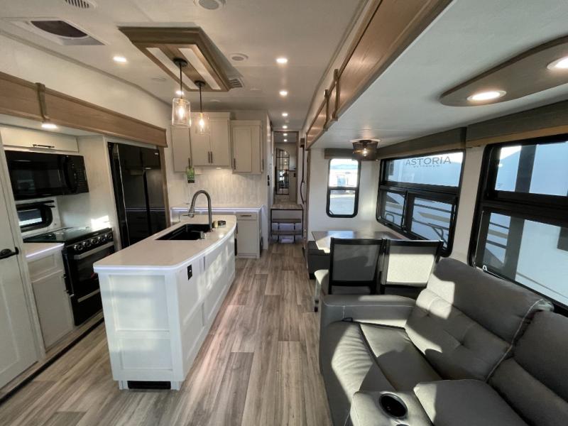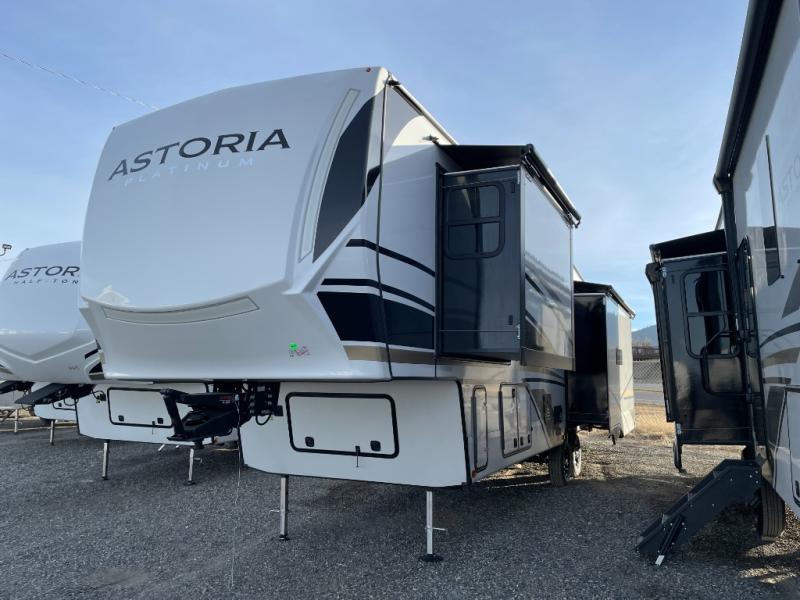 Each one of these Dutchmen RV Astoria Platinum fifth wheels feature a fiberglass exterior for added durability and an All Weather Thermal Package so you can camp all year long! There are also MorRyde Solid entry steps, slam latch baggage doors, and many more exterior conveniences. You'll enjoy a 200W solar panel for off-grid capabilities, slam latch baggage doors, and a power awning with LED lights for an inviting outdoor space. The interior is designed with bathroom backsplash, night shades throughout the living area, and Thomas Payne furniture collection. The on-demand tankless water heater will provide endless hot showers, and the dual ducted A/C will keep you cool all summer long.