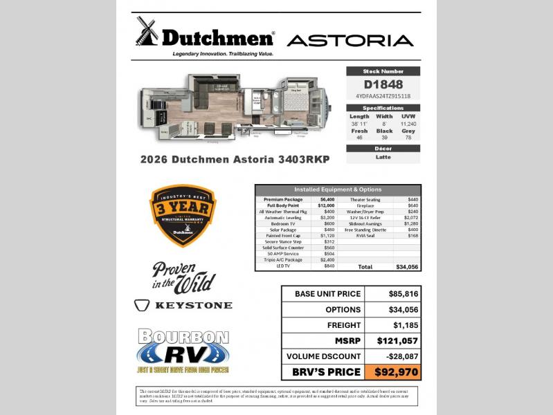 This unit has been upgraded to include both a solar package & slideout awnings! With a heated & enclosed underbelly, the Astoria 3403RKP is an all-season RV. This Astoria is equipped with 12V tank pads. Backed by Keystone / Dutchmen's three year structural warranty.