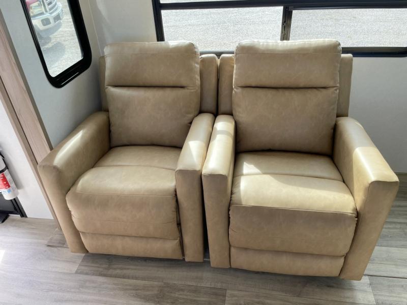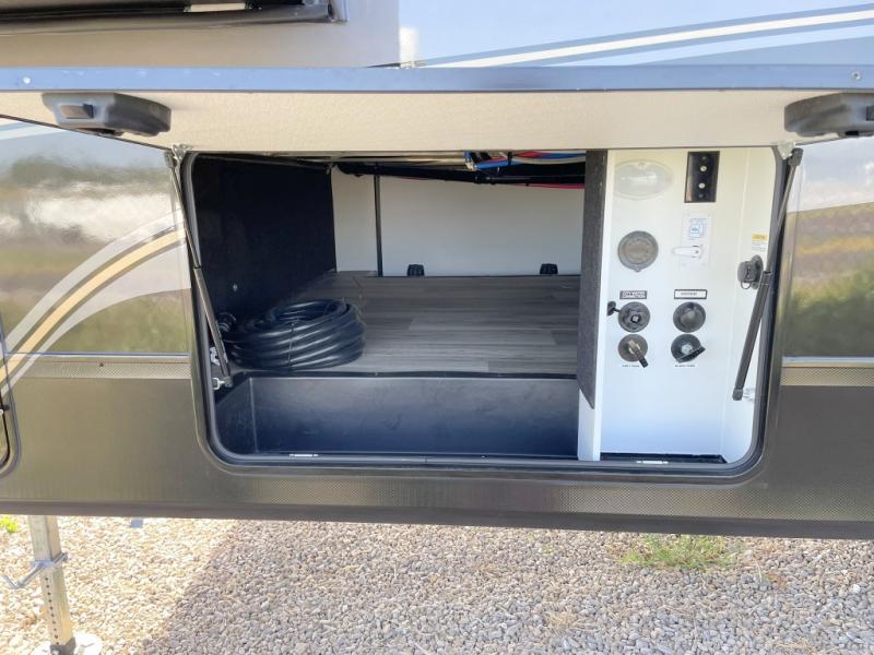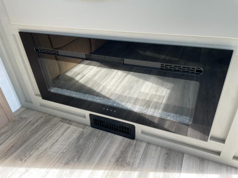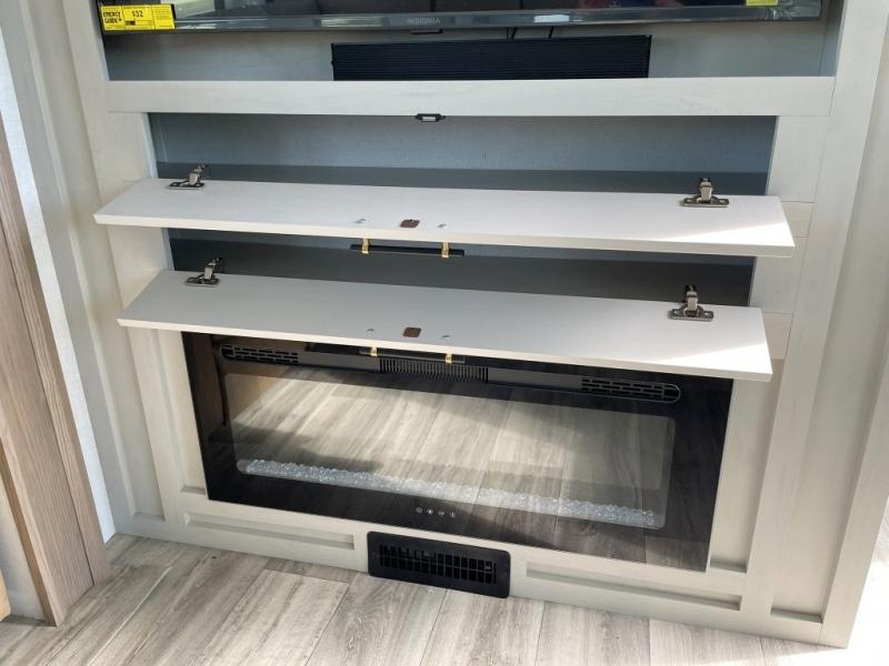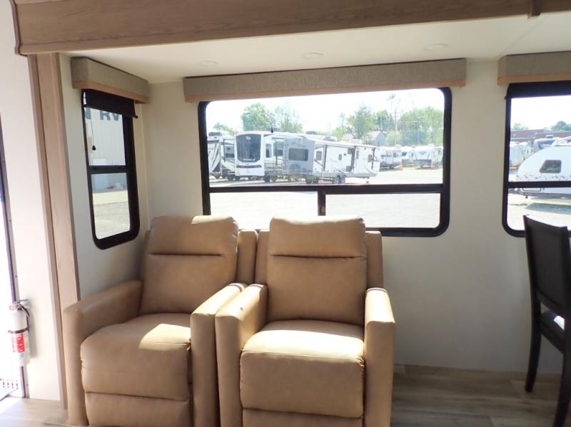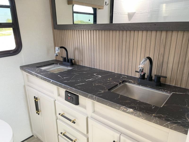 Two can get ready at once with a dual sink vanity in the full bathroom of this fifth wheel! Enjoy a good night's rest and interior space with the king bed slide in the front private bedroom which also has a front wardrobe to keep your clothes looking their best, and a closet with washer/dryer prep. The chef will have an easy time preparing meals in the kitchen with the island, the extra countertop space below the hutch, and the glass top three burner cooktop with the oven. The rear living area has a tri-fold sofa and theater seating across from an entertainment center with a fireplace and an HD LED TV!
