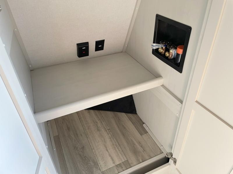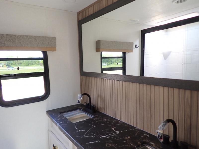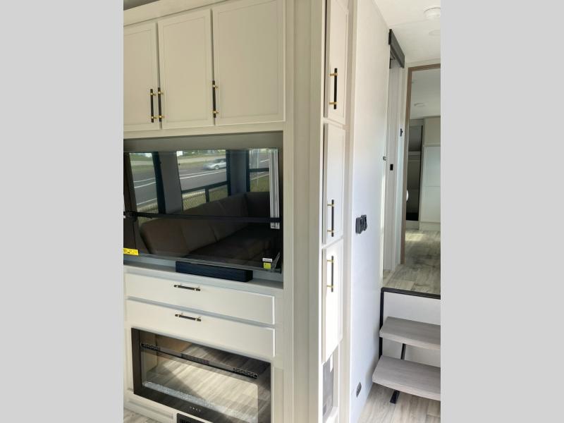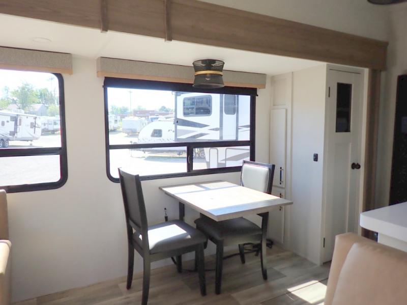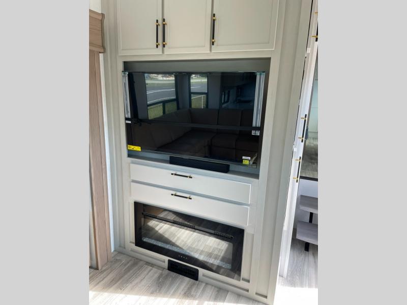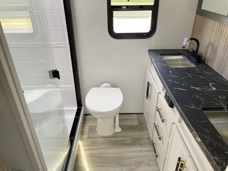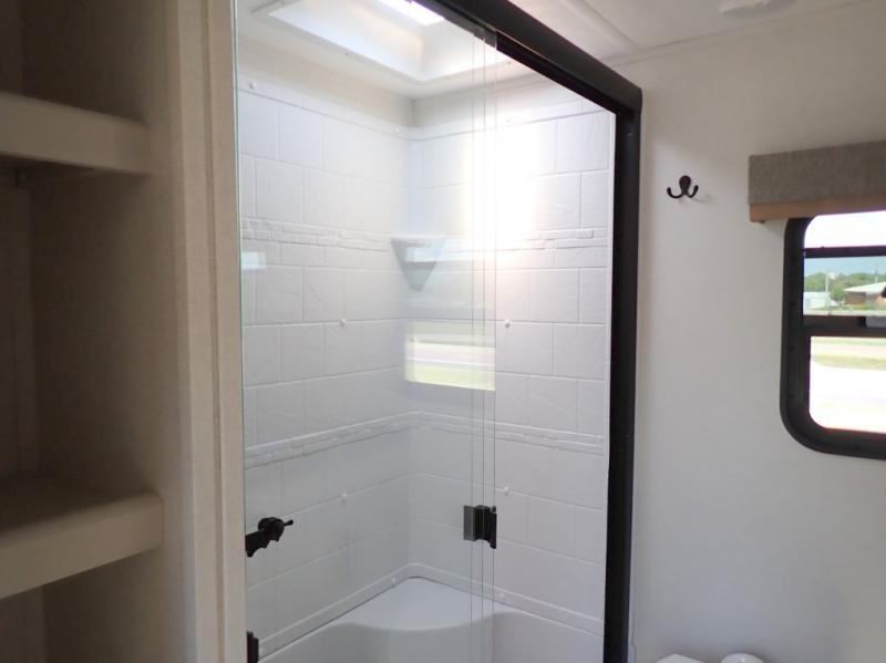 Two can get ready at once with a dual sink vanity in the full bathroom of this fifth wheel! Enjoy a good night's rest and interior space with the king bed slide in the front private bedroom which also has a front wardrobe to keep your clothes looking their best, and a closet with washer/dryer prep. The chef will have an easy time preparing meals in the kitchen with the island, the extra countertop space below the hutch, and the glass top three burner cooktop with the oven. The rear living area has a tri-fold sofa and theater seating across from an entertainment center with a fireplace and an HD LED TV!