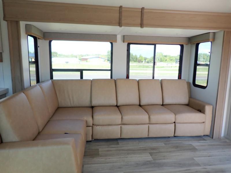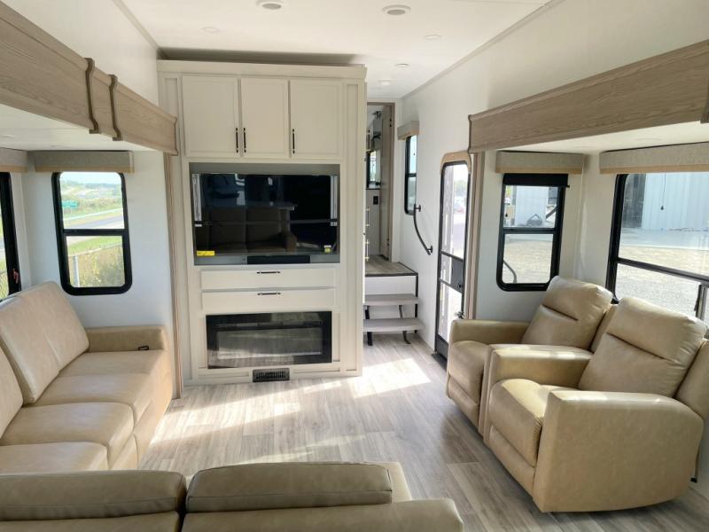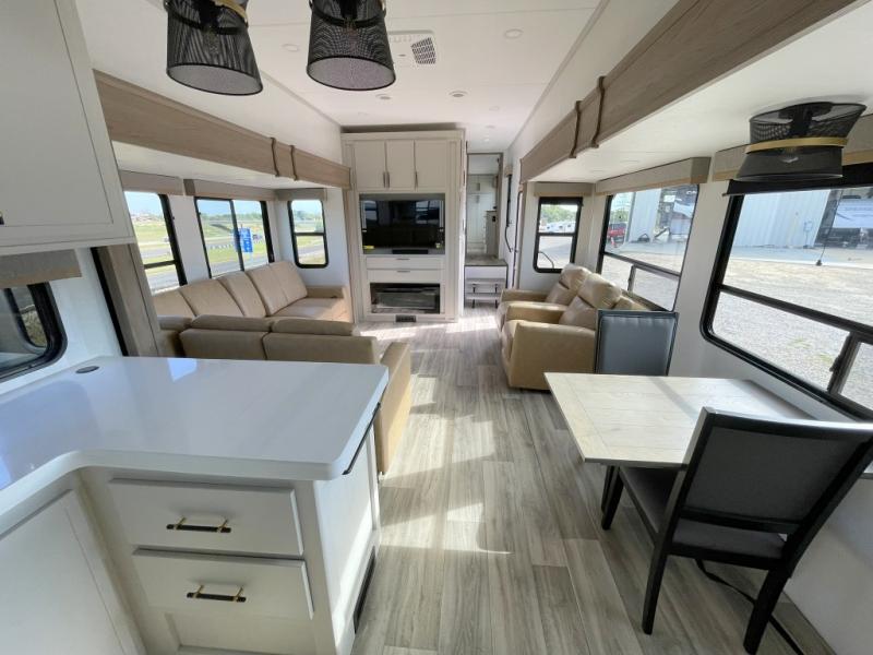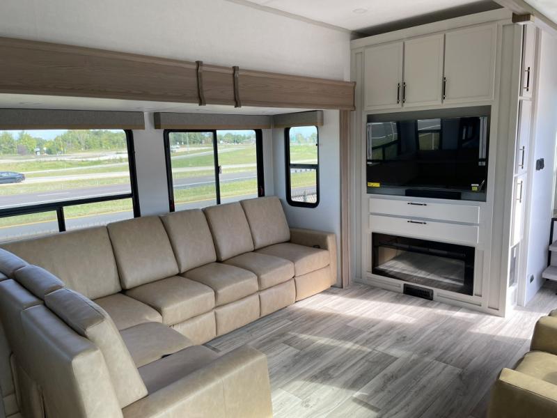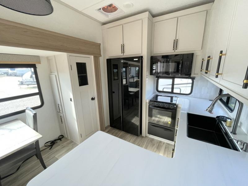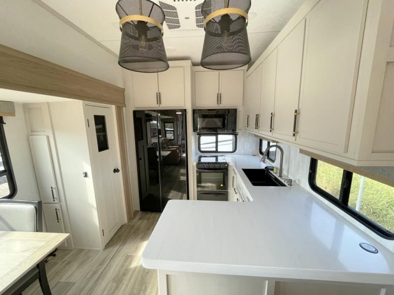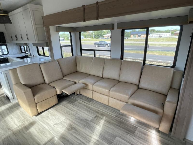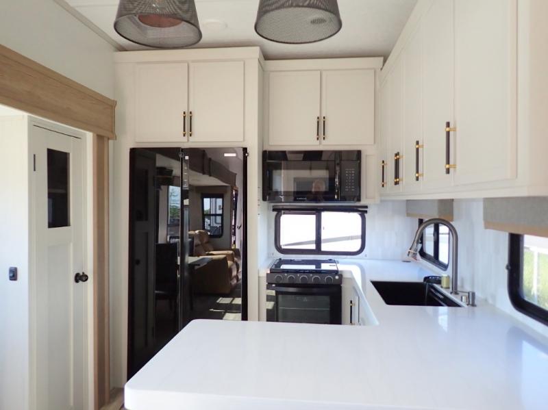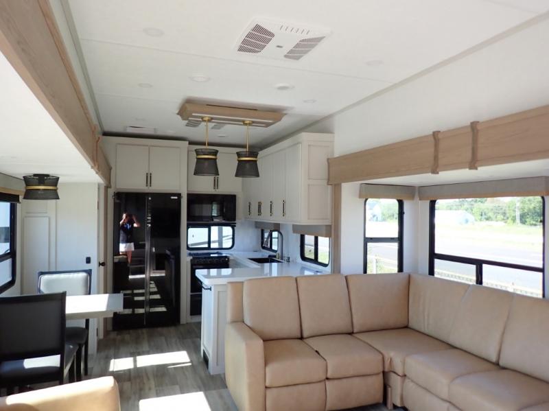 New floorplan for 2026 and this one looks to be amazing! A HUGE rear kitchen with wrap-around counters. You will love the L-shaped sofa in the living room. And this fifth wheel looks amazing! We had it upgraded to the the "Phantom" full body paint.