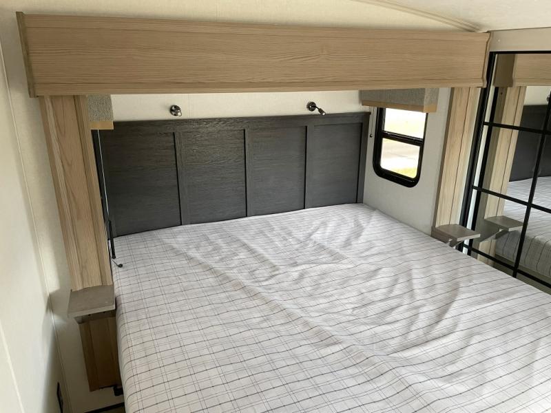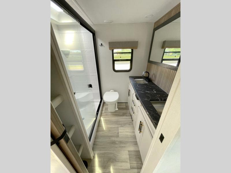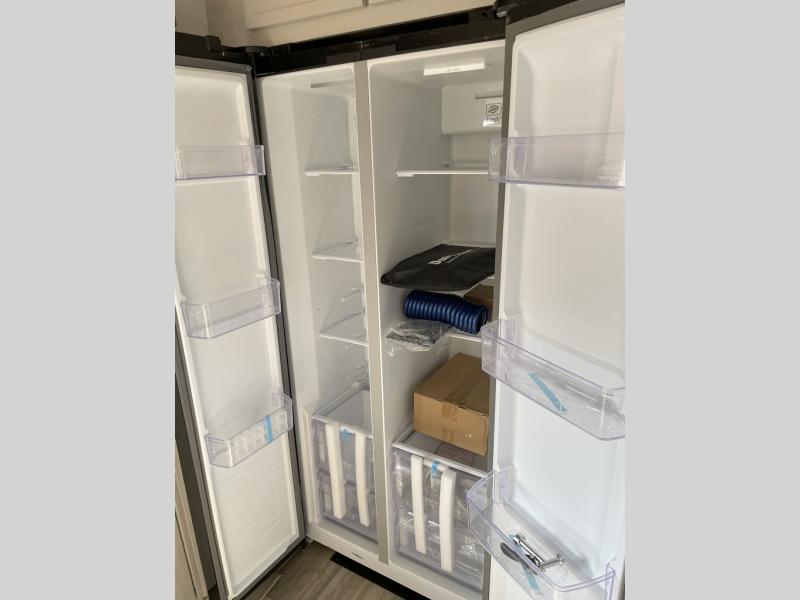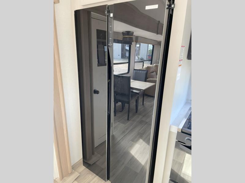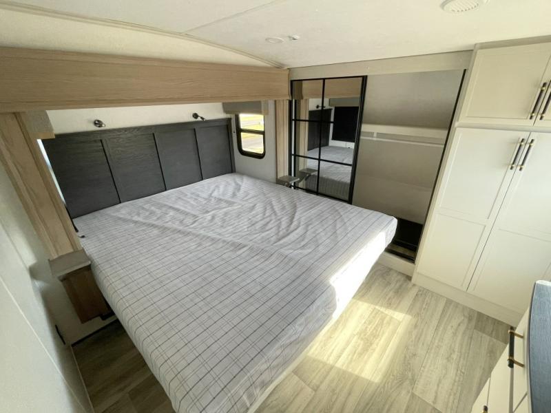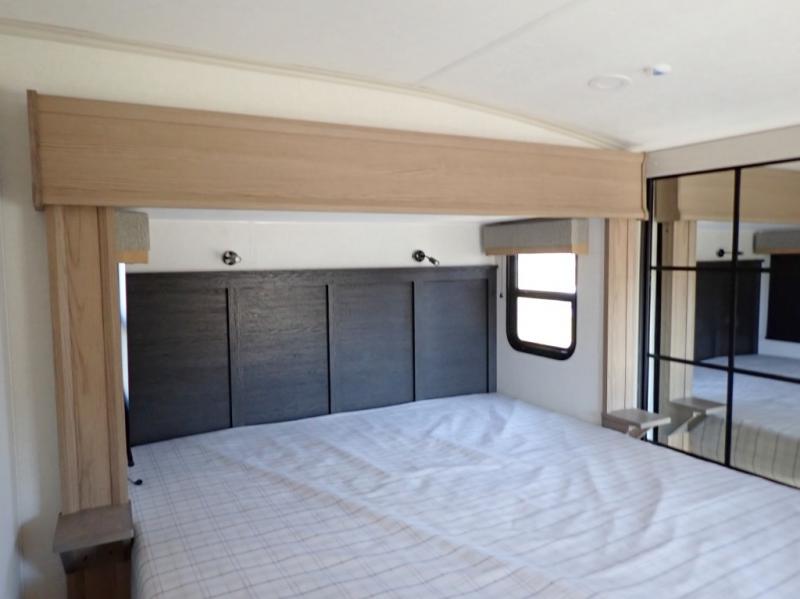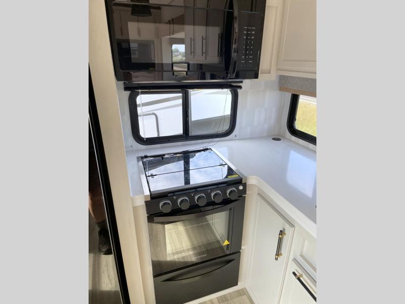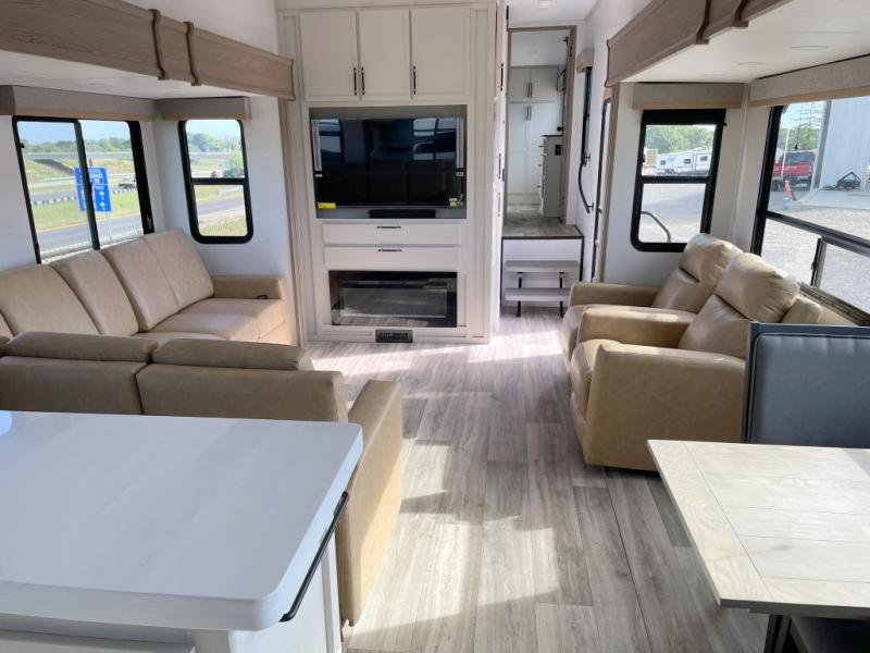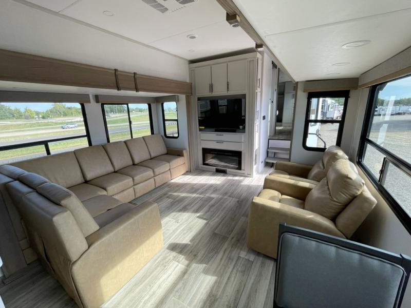 New floorplan for 2026 and this one looks to be amazing! A HUGE rear kitchen with wrap-around counters. You will love the L-shaped sofa in the living room. And this fifth wheel looks amazing! We had it upgraded to the the "Phantom" full body paint.