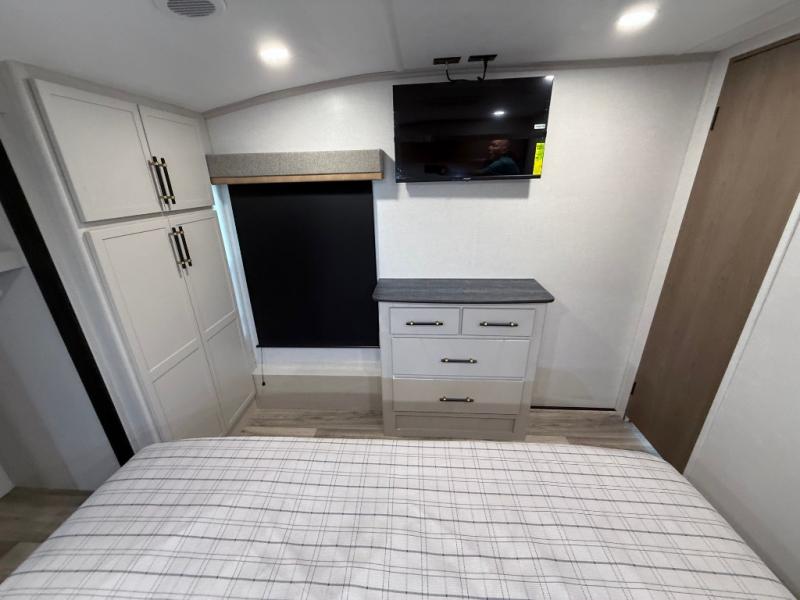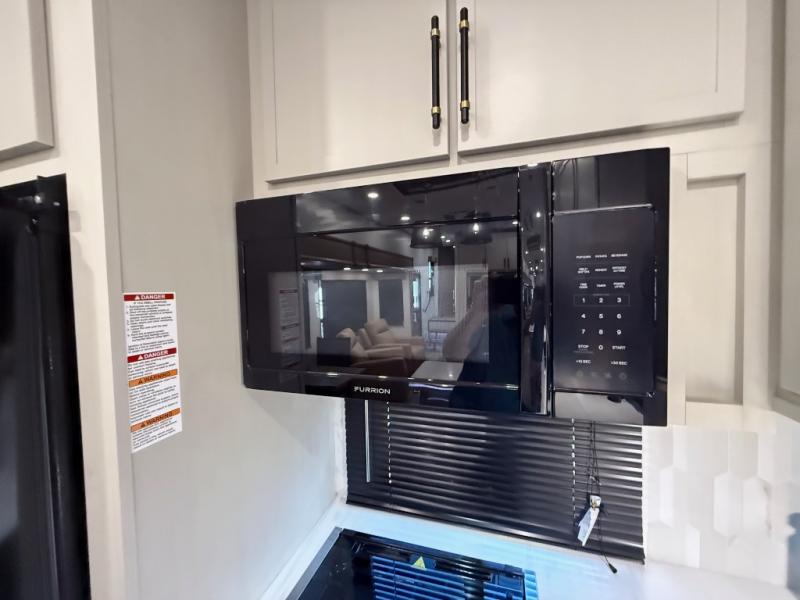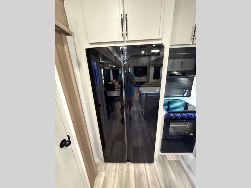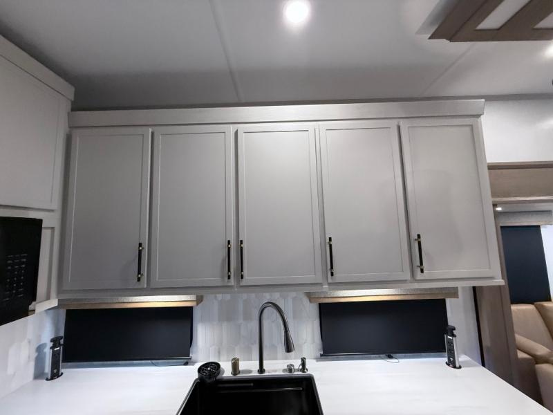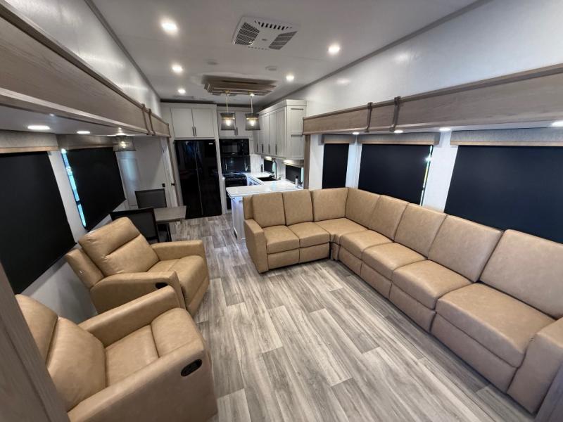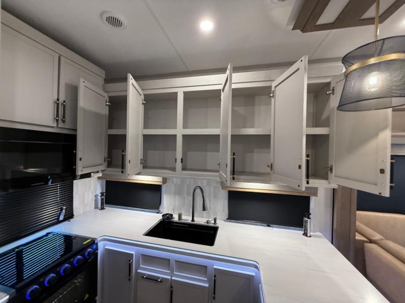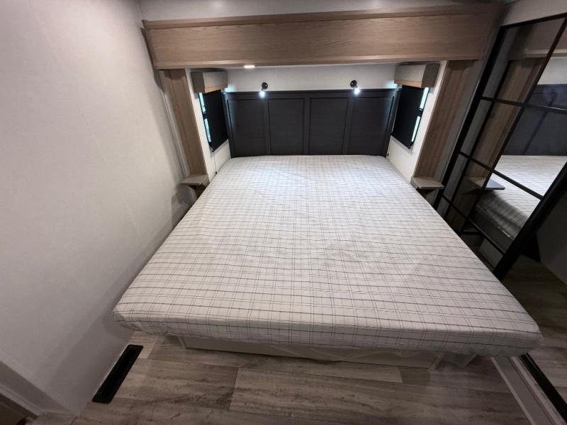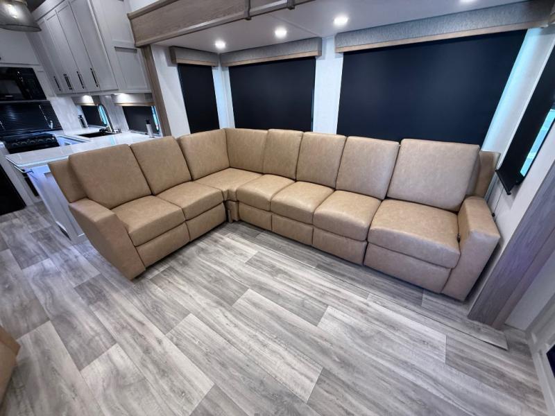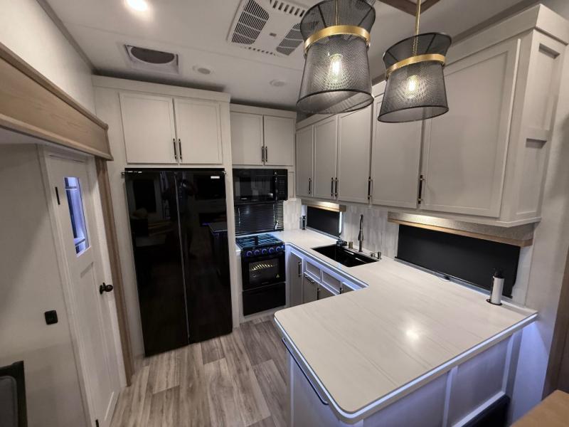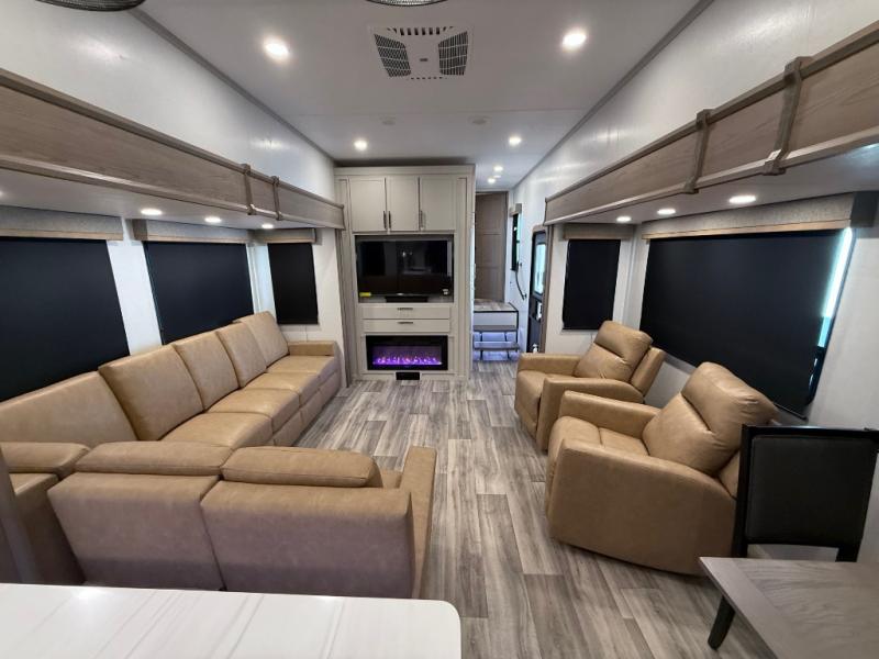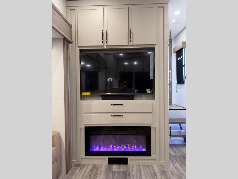 This fifth wheel elevates luxury and comfort for the discerning traveler. The rear kitchen is a culinary haven, featuring a microwave for convenient meal preparation and an oven that provides versatile cooking capabilities for culinary creativity. A spacious 20 cu refrigerator, overhead cabinets deliver generous storage for the kitchen, complemented by a pantry that offers organized storage for snacks and culinary supplies. The living and dining area invites relaxation and socializing with a freestanding dinette that creates a comfortable space for meals and gatherings with loved ones. An L-shaped jackknife sofa offers versatile seating, and the entertainment center, accentuated by a fireplace, provides ambience and media enjoyment. The full bathroom epitomizes comfort and functionality, featuring a walk-in shower and two sinks. After a long day, you can rest in the front bedroom boasting two closets, a king bed, and a dresser.