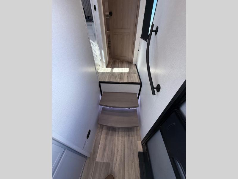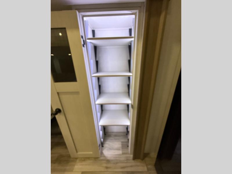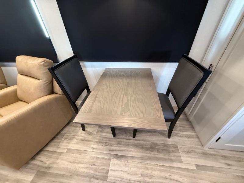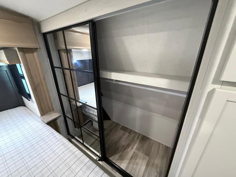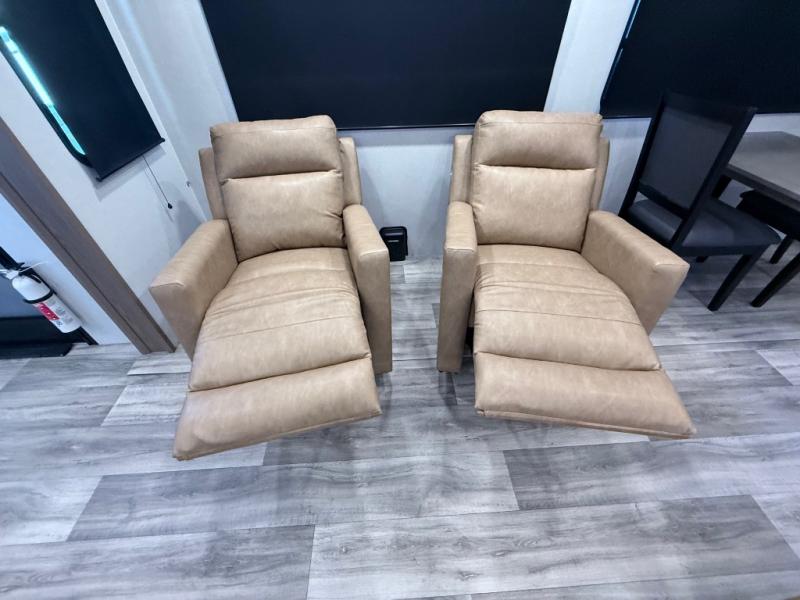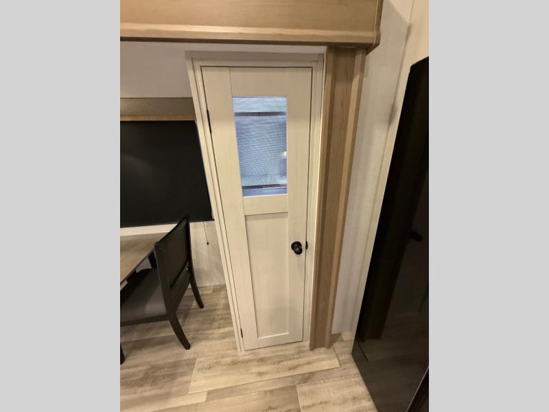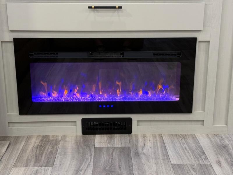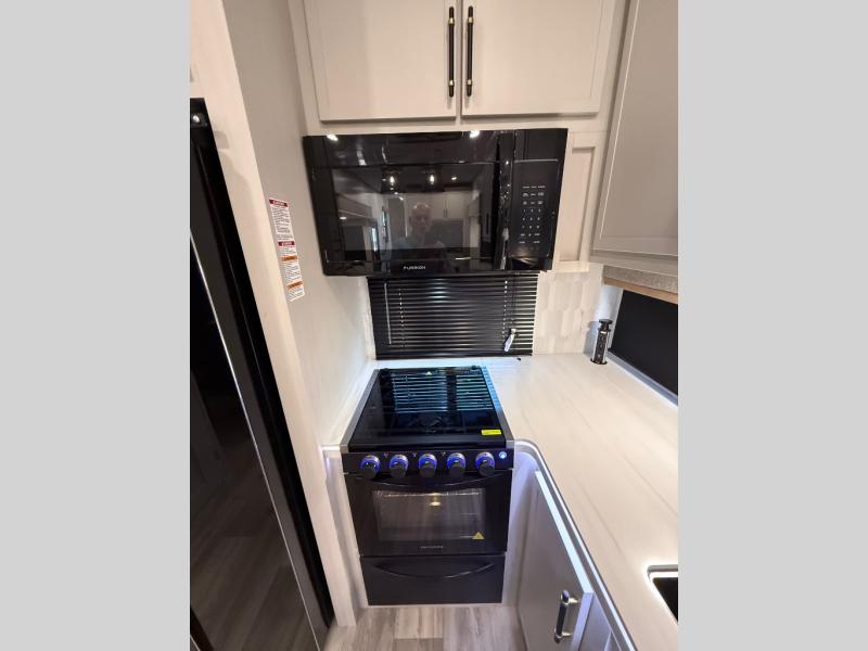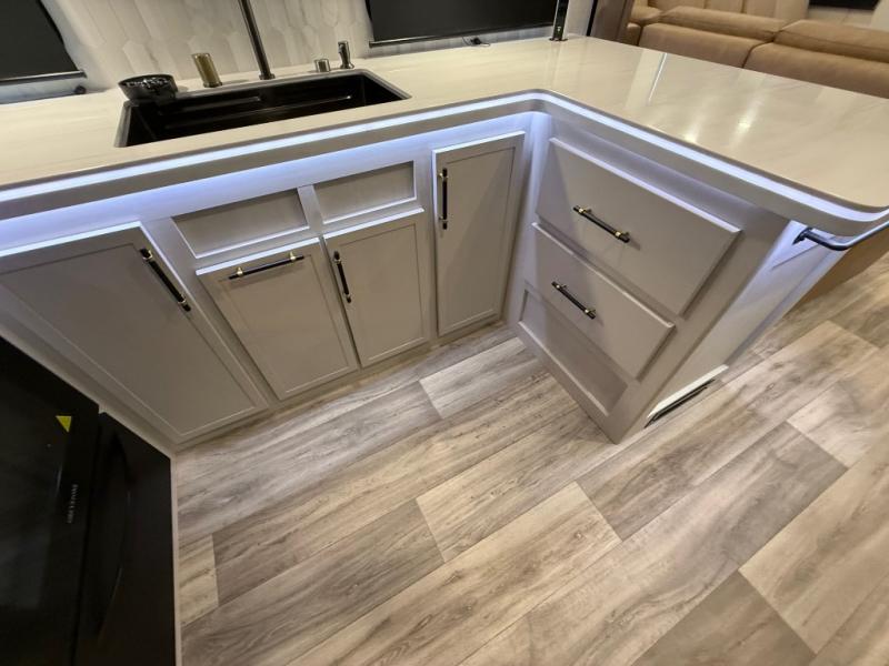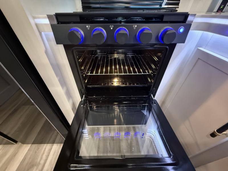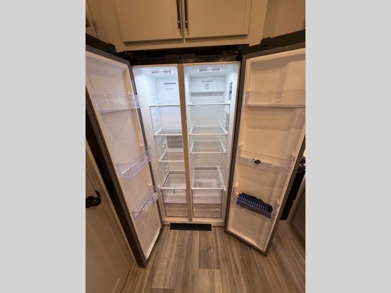 This fifth wheel elevates luxury and comfort for the discerning traveler. The rear kitchen is a culinary haven, featuring a microwave for convenient meal preparation and an oven that provides versatile cooking capabilities for culinary creativity. A spacious 20 cu refrigerator, overhead cabinets deliver generous storage for the kitchen, complemented by a pantry that offers organized storage for snacks and culinary supplies. The living and dining area invites relaxation and socializing with a freestanding dinette that creates a comfortable space for meals and gatherings with loved ones. An L-shaped jackknife sofa offers versatile seating, and the entertainment center, accentuated by a fireplace, provides ambience and media enjoyment. The full bathroom epitomizes comfort and functionality, featuring a walk-in shower and two sinks. After a long day, you can rest in the front bedroom boasting two closets, a king bed, and a dresser.