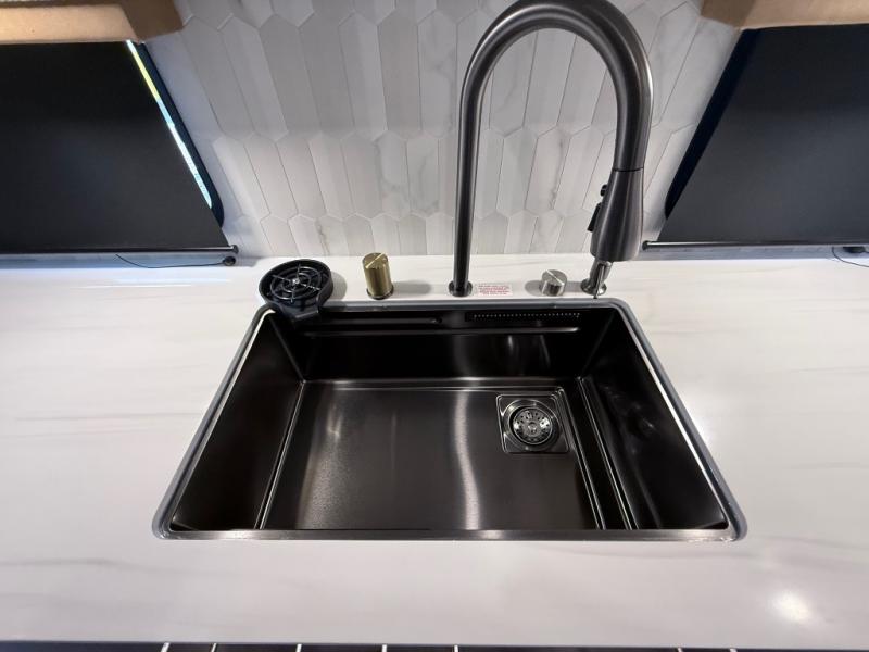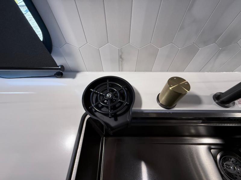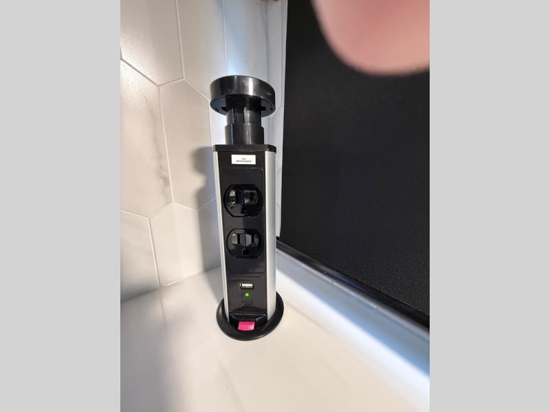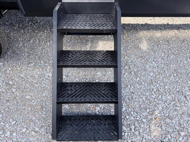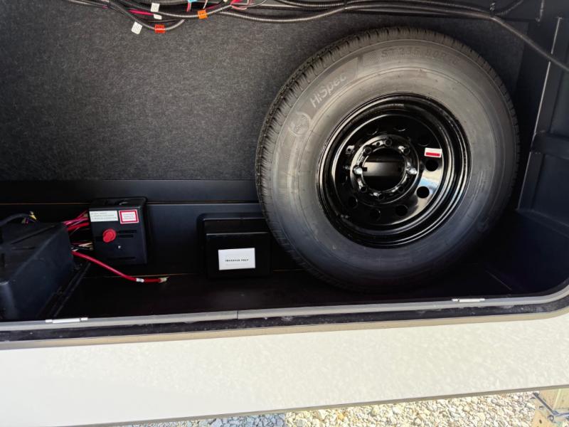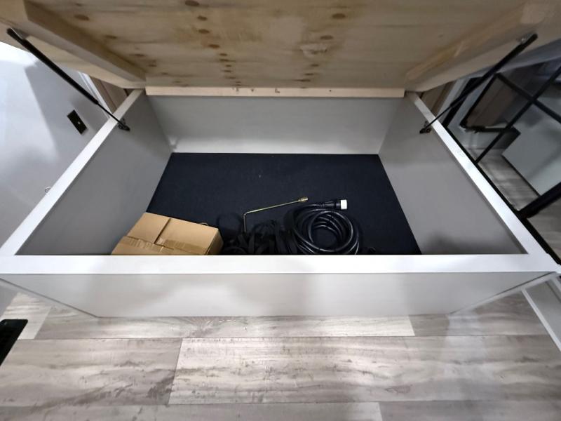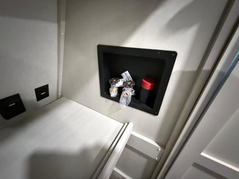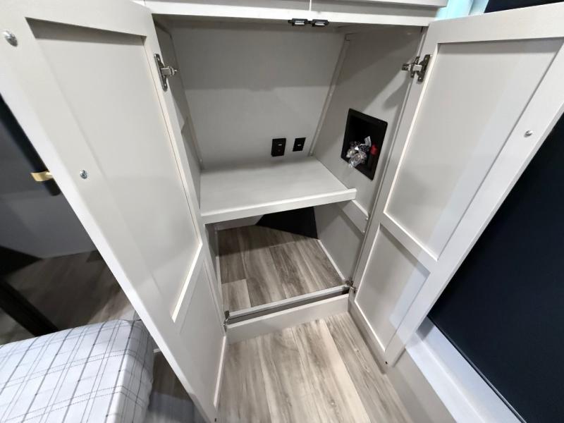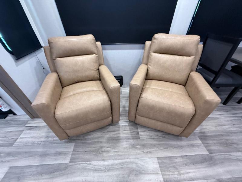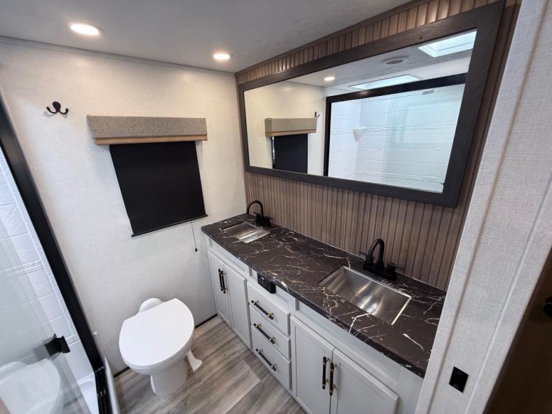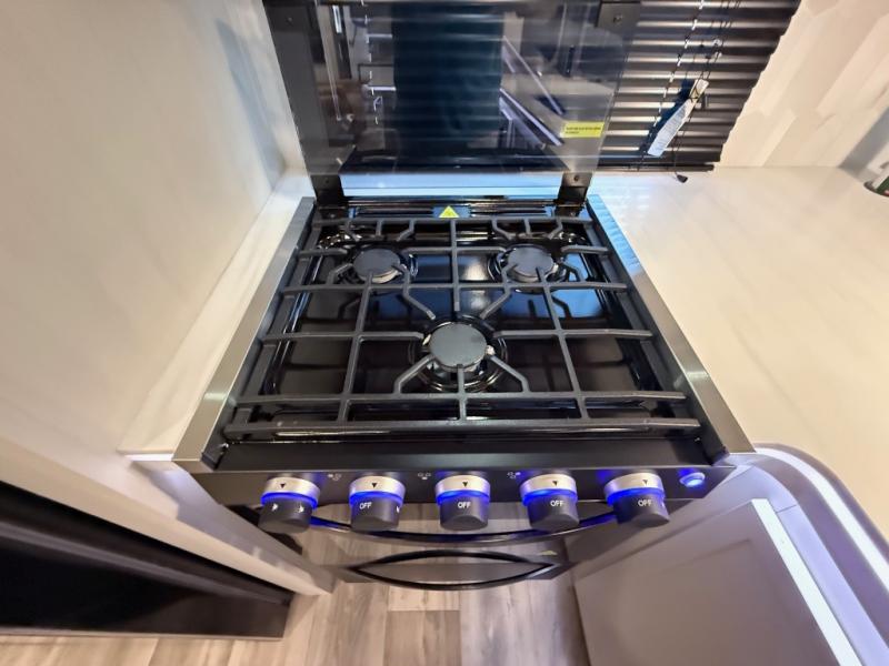 This fifth wheel elevates luxury and comfort for the discerning traveler. The rear kitchen is a culinary haven, featuring a microwave for convenient meal preparation and an oven that provides versatile cooking capabilities for culinary creativity. A spacious 20 cu refrigerator, overhead cabinets deliver generous storage for the kitchen, complemented by a pantry that offers organized storage for snacks and culinary supplies. The living and dining area invites relaxation and socializing with a freestanding dinette that creates a comfortable space for meals and gatherings with loved ones. An L-shaped jackknife sofa offers versatile seating, and the entertainment center, accentuated by a fireplace, provides ambience and media enjoyment. The full bathroom epitomizes comfort and functionality, featuring a walk-in shower and two sinks. After a long day, you can rest in the front bedroom boasting two closets, a king bed, and a dresser.