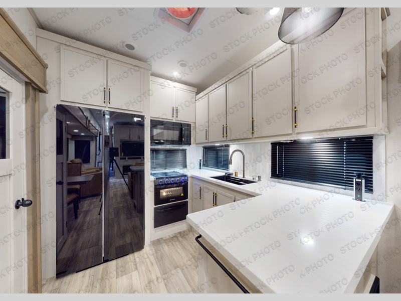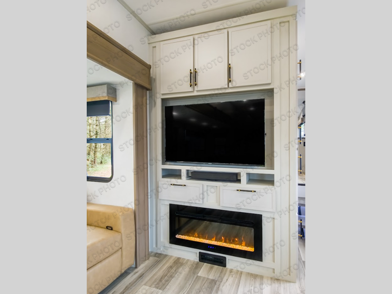 This fifth wheel elevates luxury and comfort for the discerning traveler. The rear kitchen is a culinary haven, featuring a microwave for convenient meal preparation and an oven that provides versatile cooking capabilities for culinary creativity. A spacious 20 cu refrigerator, overhead cabinets deliver generous storage for the kitchen, complemented by a pantry that offers organized storage for snacks and culinary supplies. The living and dining area invites relaxation and socializing with a freestanding dinette that creates a comfortable space for meals and gatherings with loved ones. An L-shaped jackknife sofa offers versatile seating, and the entertainment center, accentuated by a fireplace, provides ambience and media enjoyment. The full bathroom epitomizes comfort and functionality, featuring a walk-in shower and two sinks. After a long day, you can rest in the front bedroom boasting two closets, a king bed, and a dresser.