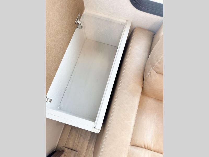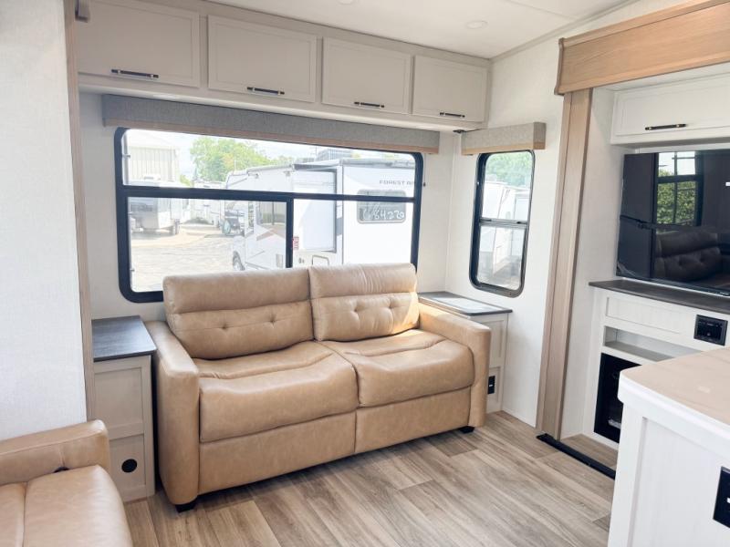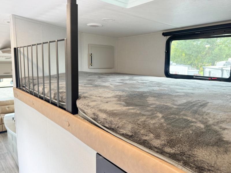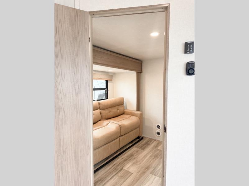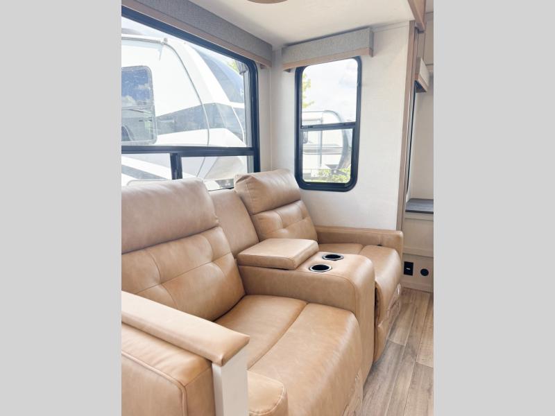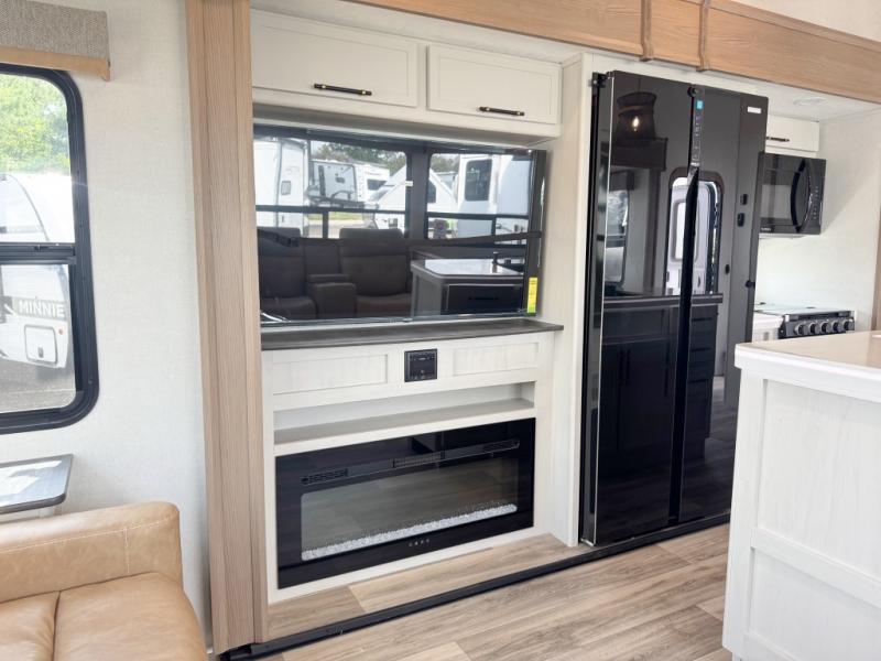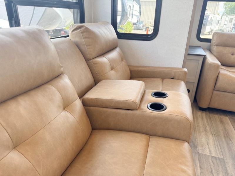 With a front bedroom and a middle multi-purpose room in this fifth wheel, everyone will have a comfortable night's sleep when you include the living room furniture and the loft bed as sleeping space! The front private bedroom has a king bed slide and a front wardrobe to keep your clothes looking their best. The multipurpose room features a sofa slide and storage below a loft bed which can be used for sleeping or storage. A couple other guests can join in too and sleep on the rear tri-fold sofa and the booth dinette once they are converted. The full bathroom has a dual sink vanity to make it easier for everyone getting ready in the mornings. You can prepare your best meals with the glass top three burner cooktop with an oven, the 16 cu. ft. refrigerator, and the kitchen island. The theater seating is conveniently across from the entertainment center with an HD LED TV and fireplace.