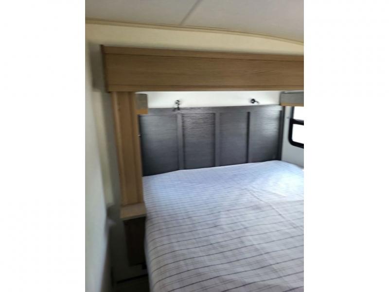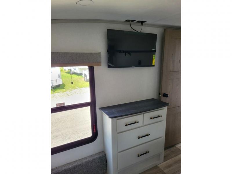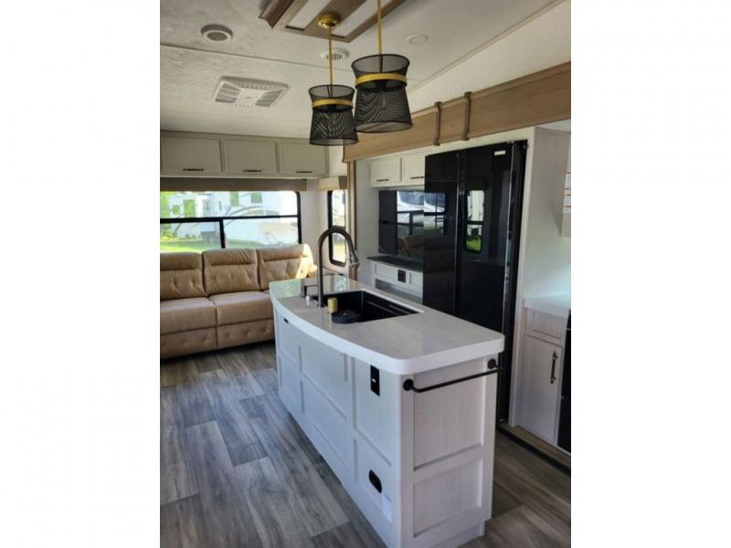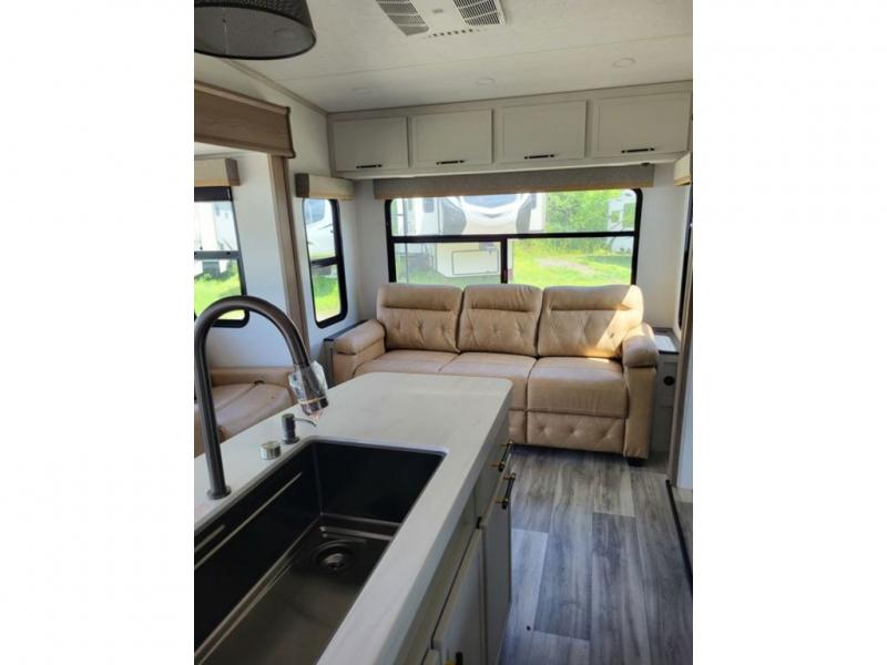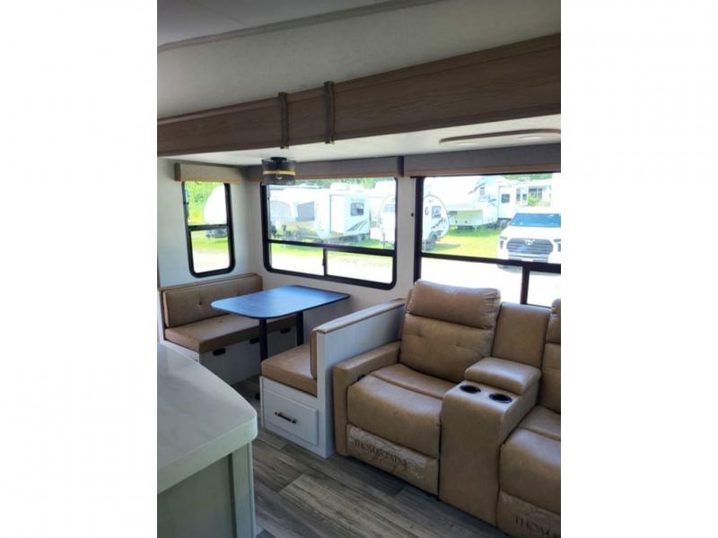 With a front bedroom and a middle multi-purpose room in this fifth wheel, everyone will have a comfortable night's sleep when you include the living room furniture and the loft bed as sleeping space! The front private bedroom has a king bed slide and a front wardrobe to keep your clothes looking their best. The multipurpose room features a sofa slide and storage below a loft bed which can be used for sleeping or storage. A couple other guests can join in too and sleep on the rear tri-fold sofa and the booth dinette once they are converted. The full bathroom has a dual sink vanity to make it easier for everyone getting ready in the mornings. You can prepare your best meals with the glass top three burner cooktop with an oven, the 16 cu. ft. refrigerator, and the kitchen island. The theater seating is conveniently across from the entertainment center with an HD LED TV and fireplace.