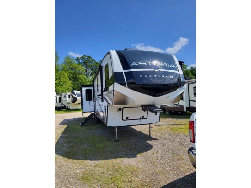 Each one of these Dutchmen RV Astoria Platinum fifth wheels feature a fiberglass exterior for added durability and an All Weather Thermal Package so you can camp all year long! There are also MorRyde Solid entry steps, slam latch baggage doors, and many more exterior conveniences. You'll enjoy a 200W solar panel for off-grid capabilities, slam latch baggage doors, and a power awning with LED lights for an inviting outdoor space. The interior is designed with bathroom backsplash, night shades throughout the living area, and Thomas Payne furniture collection. The on-demand tankless water heater will provide endless hot showers, and the dual ducted A/C will keep you cool all summer long.