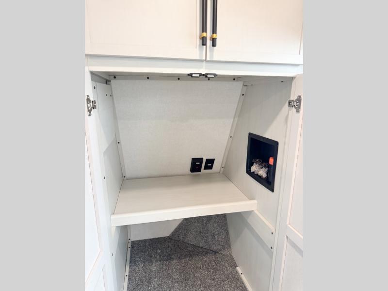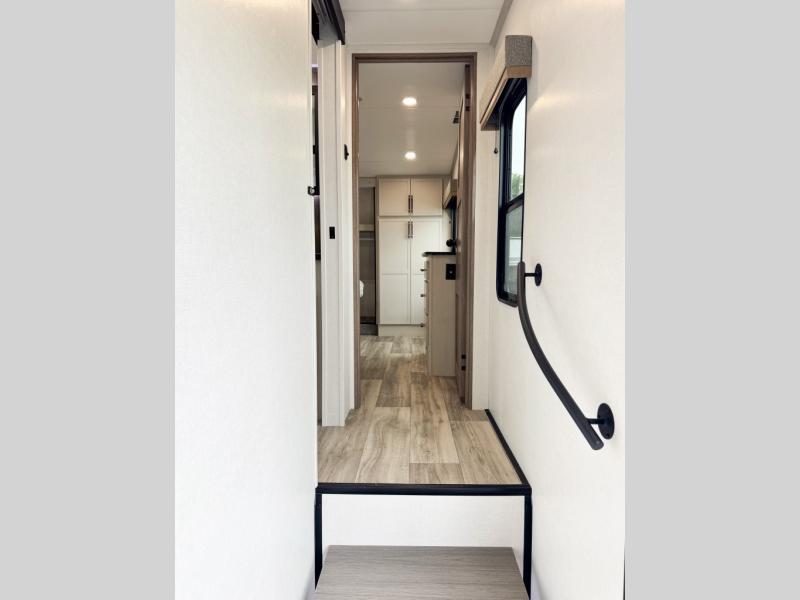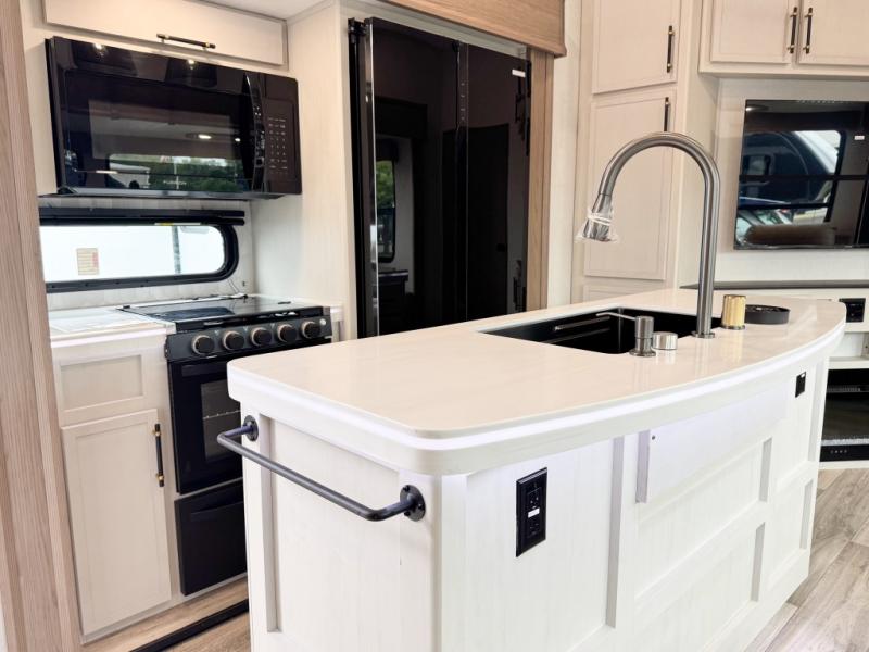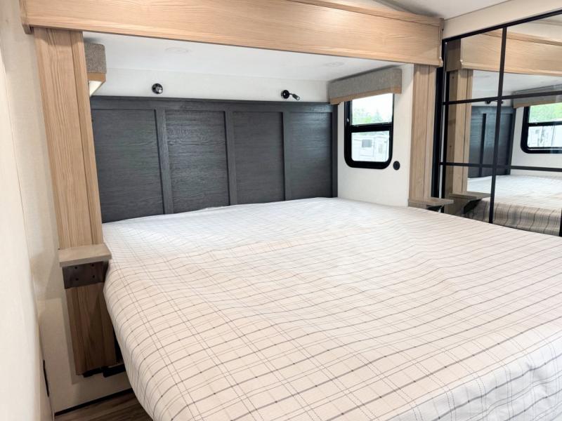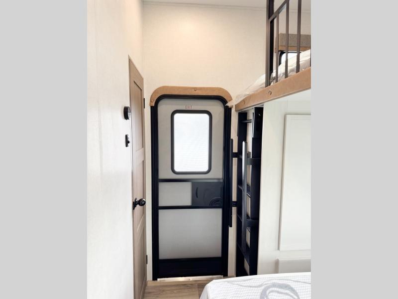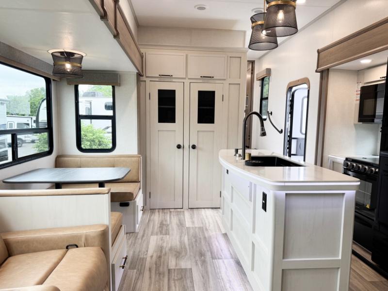 You will experience a smooth flow of traffic in and out of this fifth wheel with dual entry doors! One of the entrances even leads into the rear private bedroom which also has a 54" x 74" loft bed for storage or sleeping space, plus its very own half bathroom which will come in handy at night. The chef will enjoy preparing and serving meals using the kitchen island and all the amenities inside, plus they will enjoy cooking at the outdoor kitchen when wanting to be outside with everyone. Inside, there is a large pantry that is big enough to store everyone's favorite snacks, and the booth dinette offers a comfortable place to eat your meals or play card games. And the full bathroom has a dual sink vanity for two to get ready at once. When you're ready to wind down your nights, head to the front private bedroom and relax on the king bed slide!