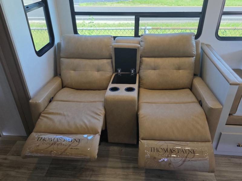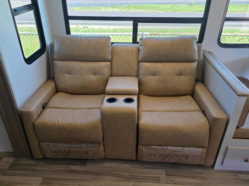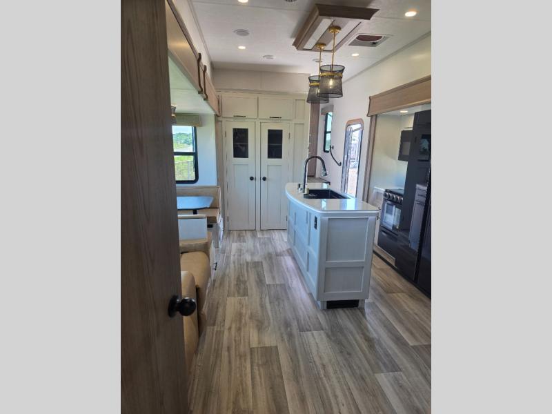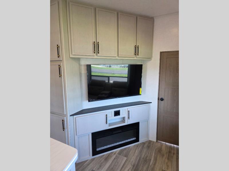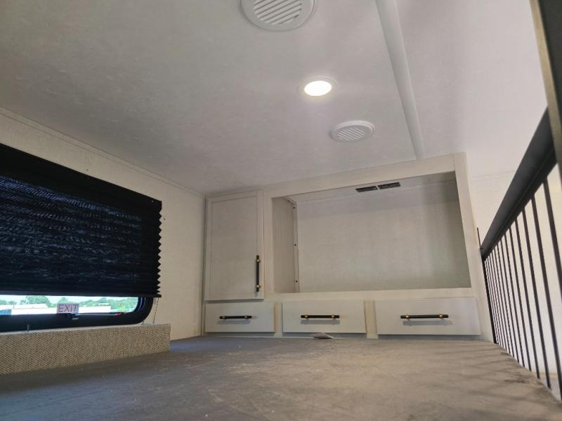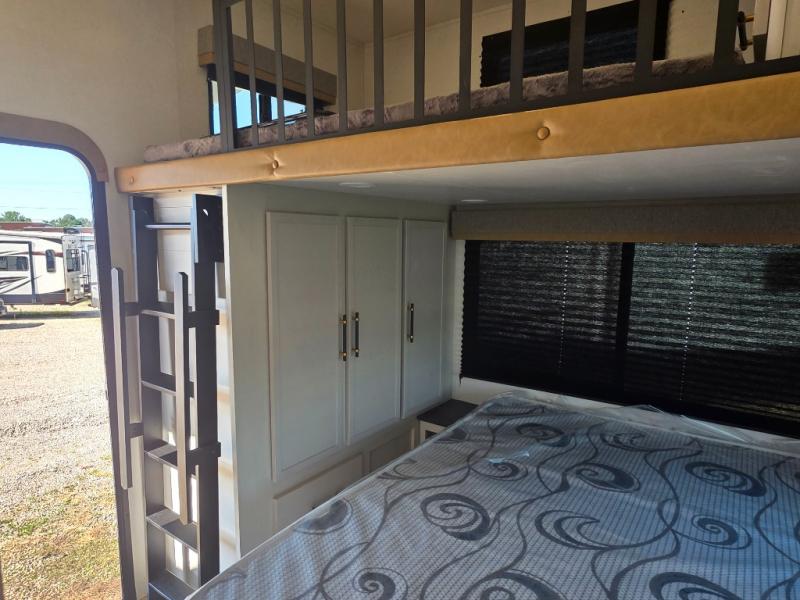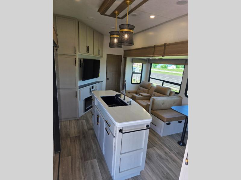 The Astoria 3603LFP features a rear bedroom with loft. The loft is above a full size bed. What a great idea! Besides the loft, another standout feature is that this model has a bath & a half. There is a "half bath" right next to the bunk house. The full bath is in the front of the 3603LFP next to the master bedroom. The living room features theater seating, entertainment center, and a fireplace. An island kitchen adds to efficiency and convenience. You will enjoy the option of taking the fun outside as you enjoy the integrated outside kitchen.