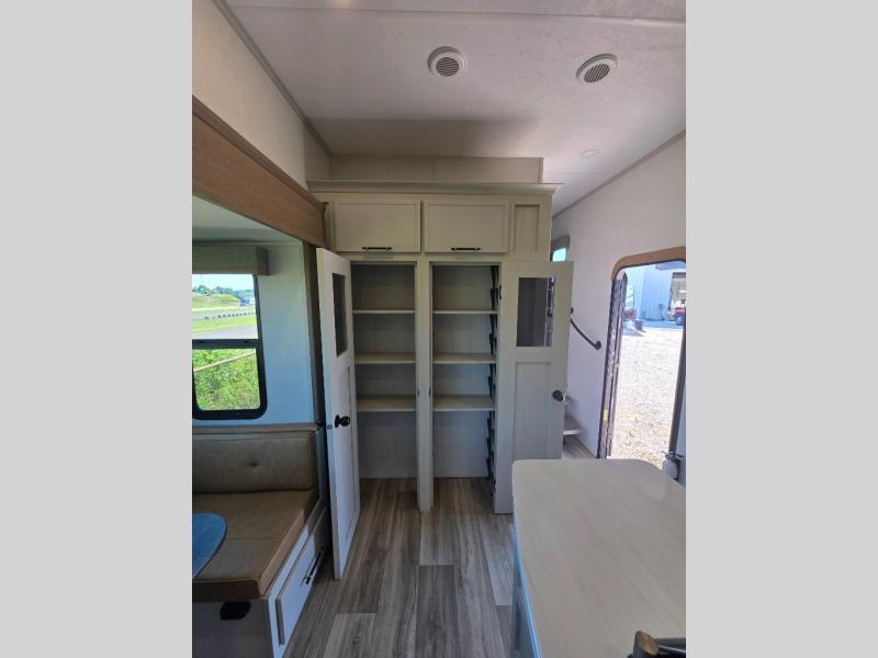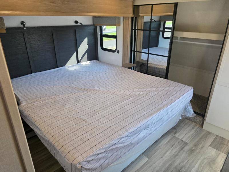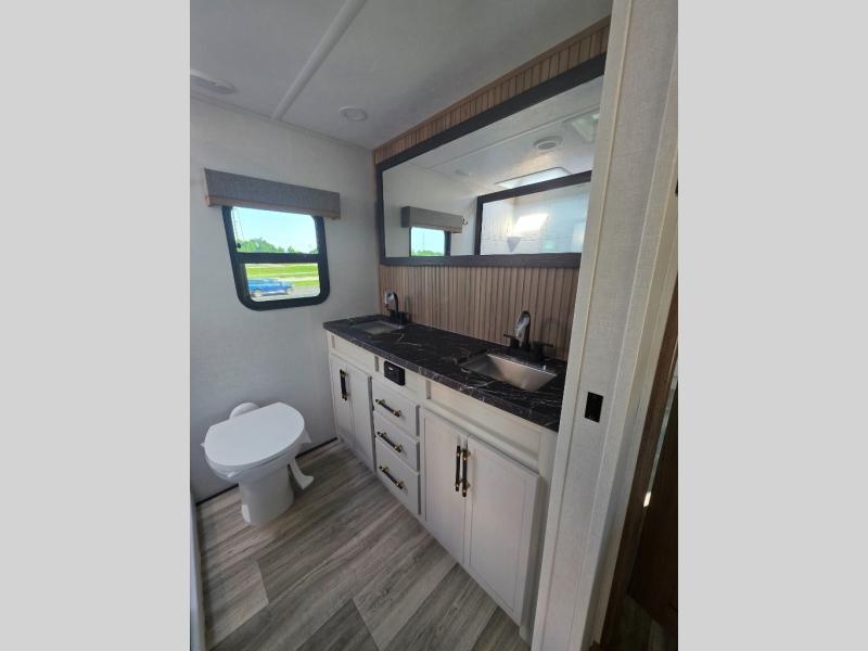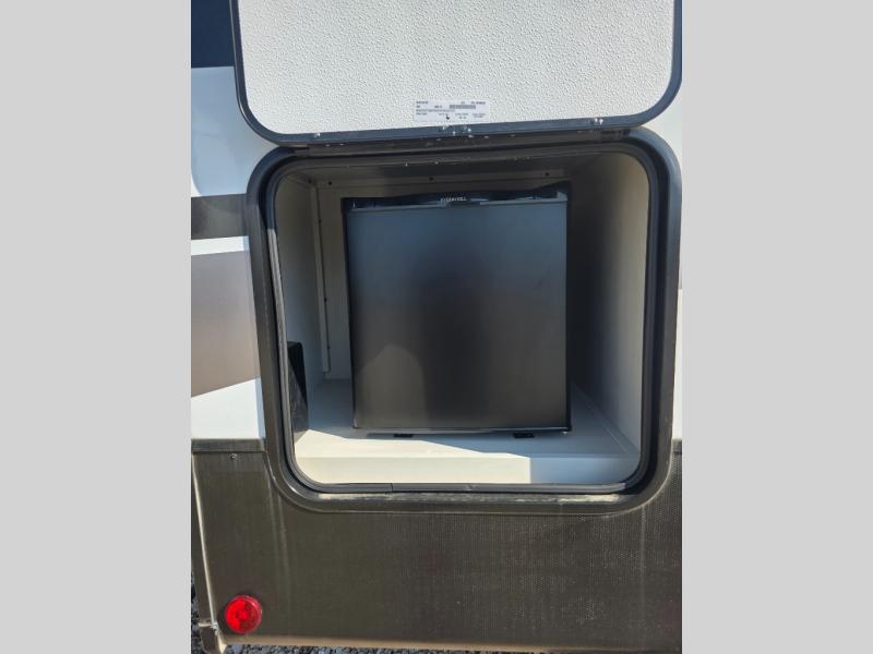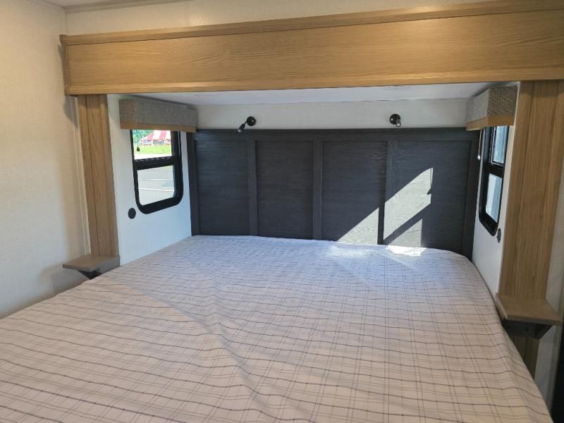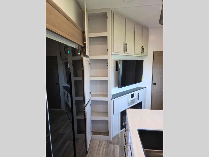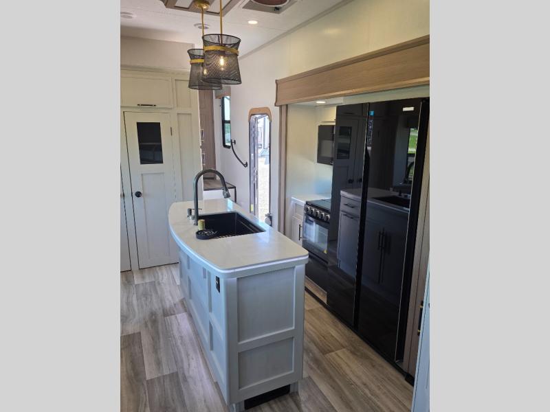 You will experience a smooth flow of traffic in and out of this fifth wheel with dual entry doors! One of the entrances even leads into the rear private bedroom which also has a 54" x 74" loft bed for storage or sleeping space, plus its very own half bathroom which will come in handy at night. The chef will enjoy preparing and serving meals using the kitchen island and all the amenities inside, plus they will enjoy cooking at the outdoor kitchen when wanting to be outside with everyone. Inside, there is a large pantry that is big enough to store everyone's favorite snacks, and the booth dinette offers a comfortable place to eat your meals or play card games. And the full bathroom has a dual sink vanity for two to get ready at once. When you're ready to wind down your nights, head to the front private bedroom and relax on the king bed slide!