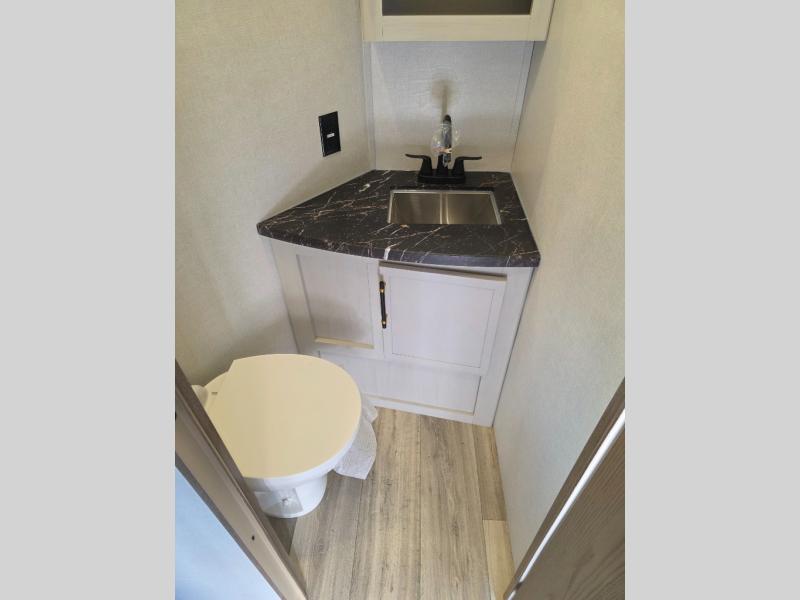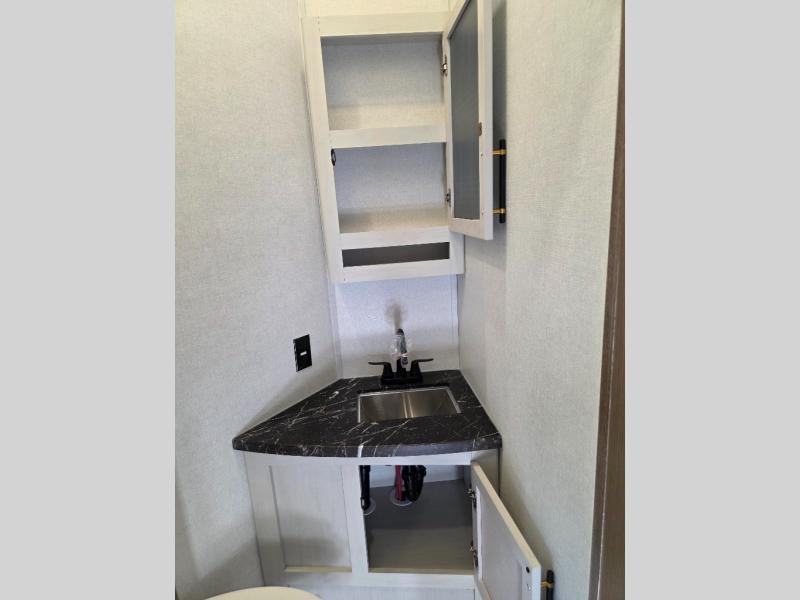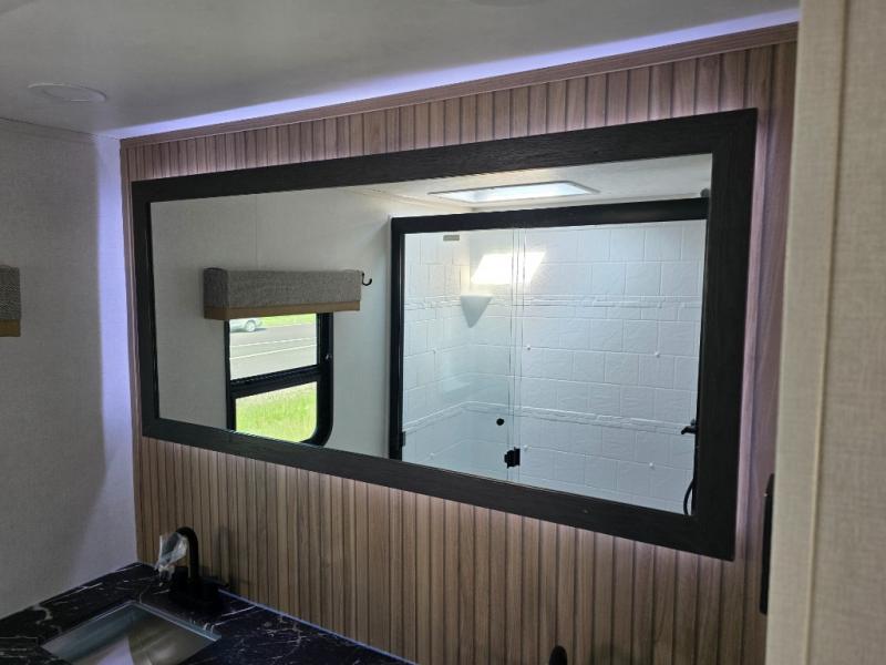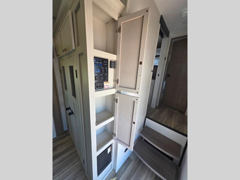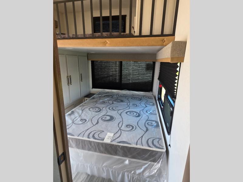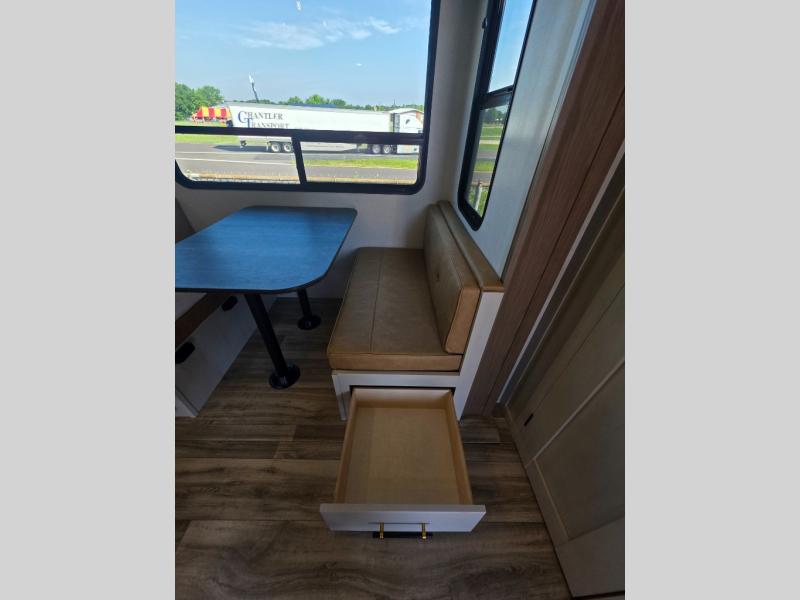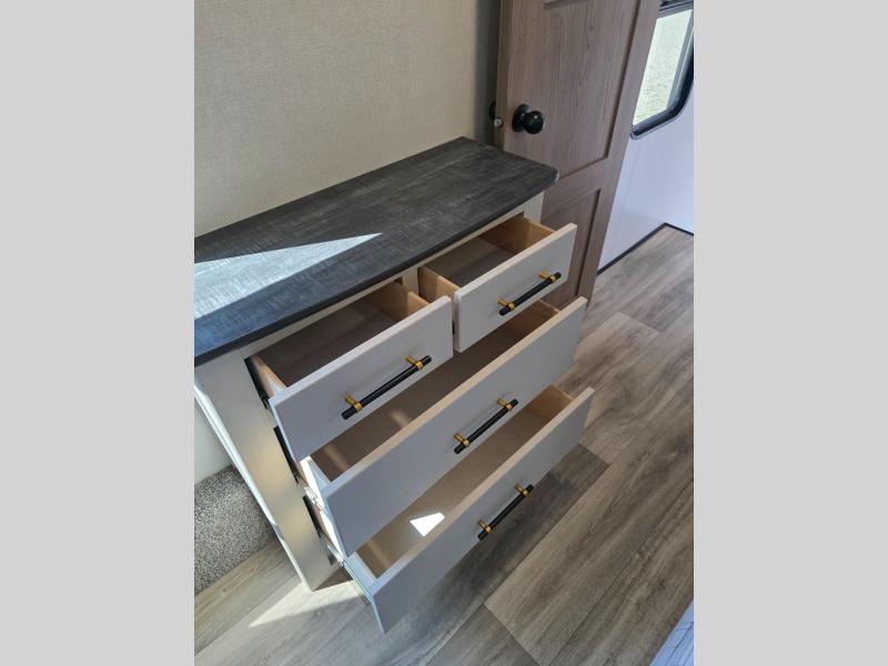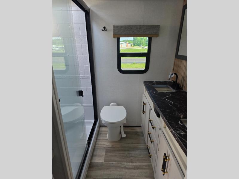 You will experience a smooth flow of traffic in and out of this fifth wheel with dual entry doors! One of the entrances even leads into the rear private bedroom which also has a 54" x 74" loft bed for storage or sleeping space, plus its very own half bathroom which will come in handy at night. The chef will enjoy preparing and serving meals using the kitchen island and all the amenities inside, plus they will enjoy cooking at the outdoor kitchen when wanting to be outside with everyone. Inside, there is a large pantry that is big enough to store everyone's favorite snacks, and the booth dinette offers a comfortable place to eat your meals or play card games. And the full bathroom has a dual sink vanity for two to get ready at once. When you're ready to wind down your nights, head to the front private bedroom and relax on the king bed slide!