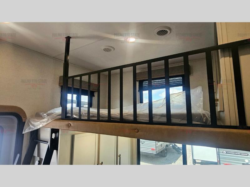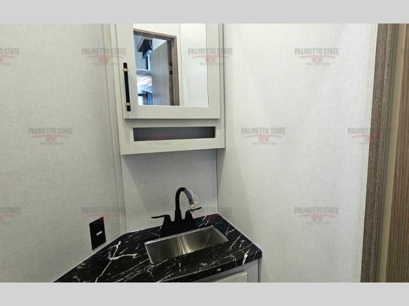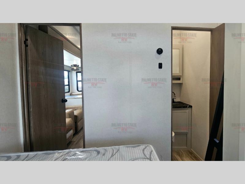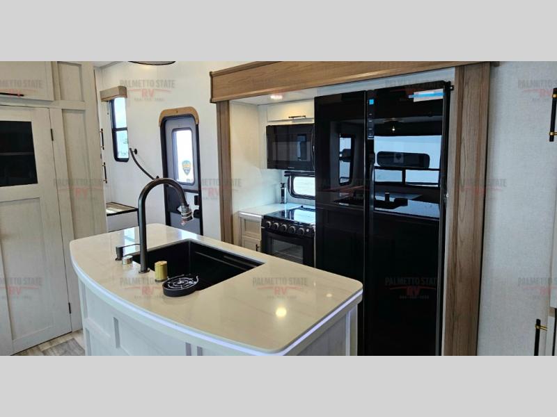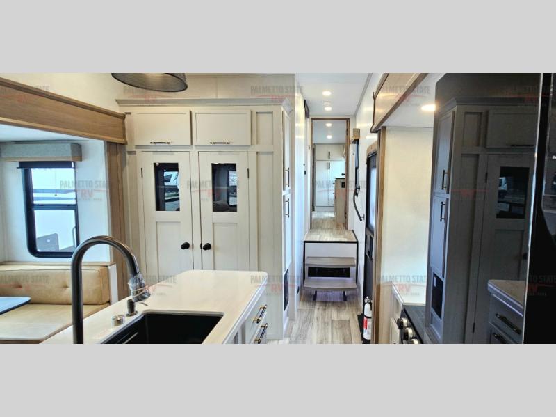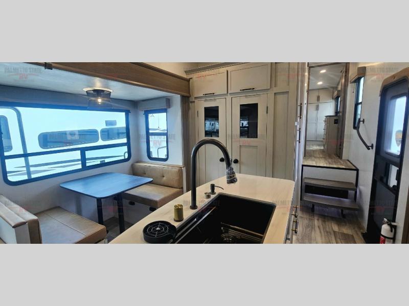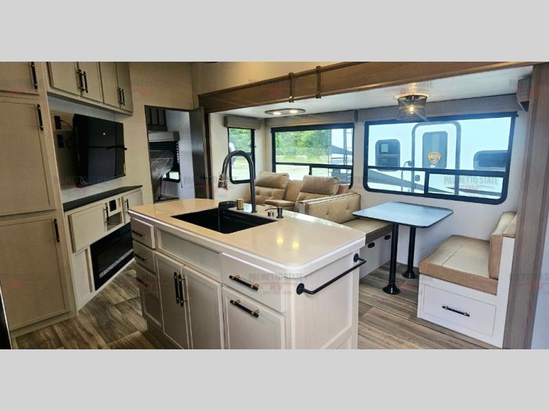 You will experience a smooth flow of traffic in and out of this fifth wheel with dual entry doors! One of the entrances even leads into the rear private bedroom which also has a 54" x 74" loft bed for storage or sleeping space, plus its very own half bathroom which will come in handy at night. The chef will enjoy preparing and serving meals using the kitchen island and all the amenities inside, plus they will enjoy cooking at the outdoor kitchen when wanting to be outside with everyone. Inside, there is a large pantry that is big enough to store everyone's favorite snacks, and the booth dinette offers a comfortable place to eat your meals or play card games. And the full bathroom has a dual sink vanity for two to get ready at once. When you're ready to wind down your nights, head to the front private bedroom and relax on the king bed slide!