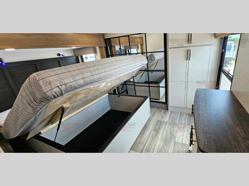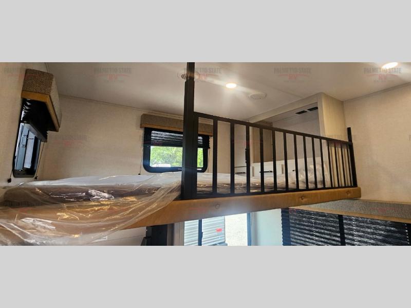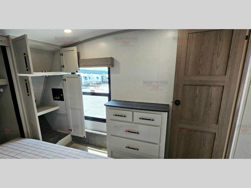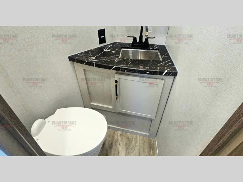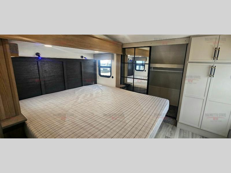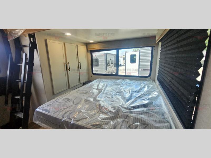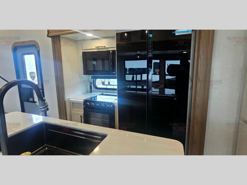 You will experience a smooth flow of traffic in and out of this fifth wheel with dual entry doors! One of the entrances even leads into the rear private bedroom which also has a 54" x 74" loft bed for storage or sleeping space, plus its very own half bathroom which will come in handy at night. The chef will enjoy preparing and serving meals using the kitchen island and all the amenities inside, plus they will enjoy cooking at the outdoor kitchen when wanting to be outside with everyone. Inside, there is a large pantry that is big enough to store everyone's favorite snacks, and the booth dinette offers a comfortable place to eat your meals or play card games. And the full bathroom has a dual sink vanity for two to get ready at once. When you're ready to wind down your nights, head to the front private bedroom and relax on the king bed slide!