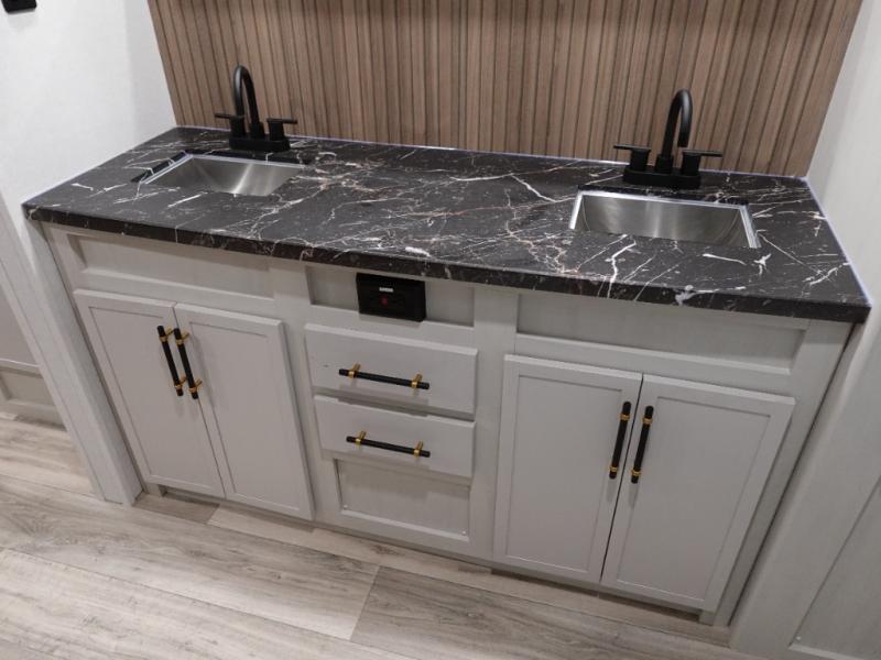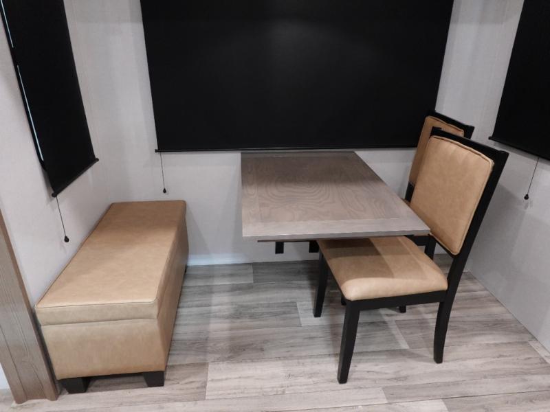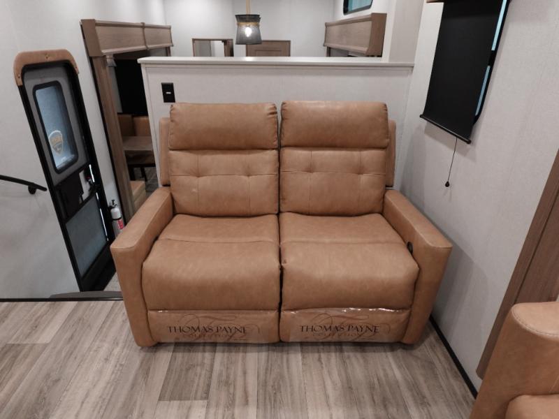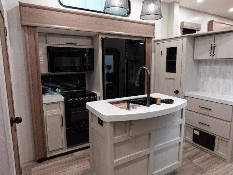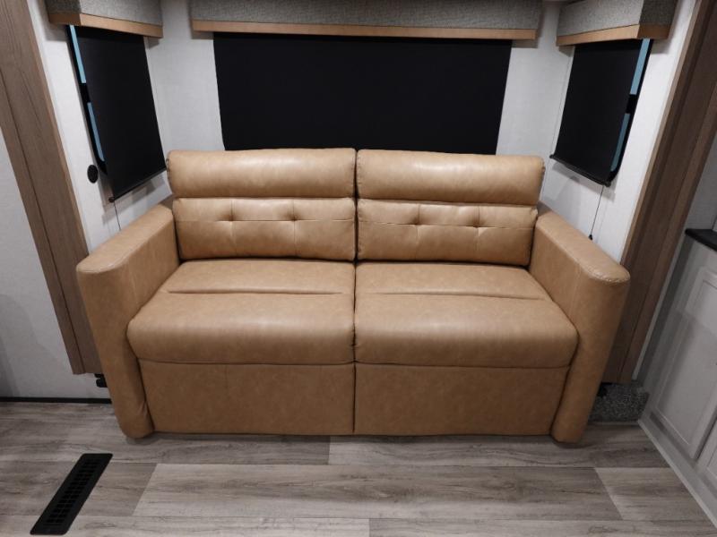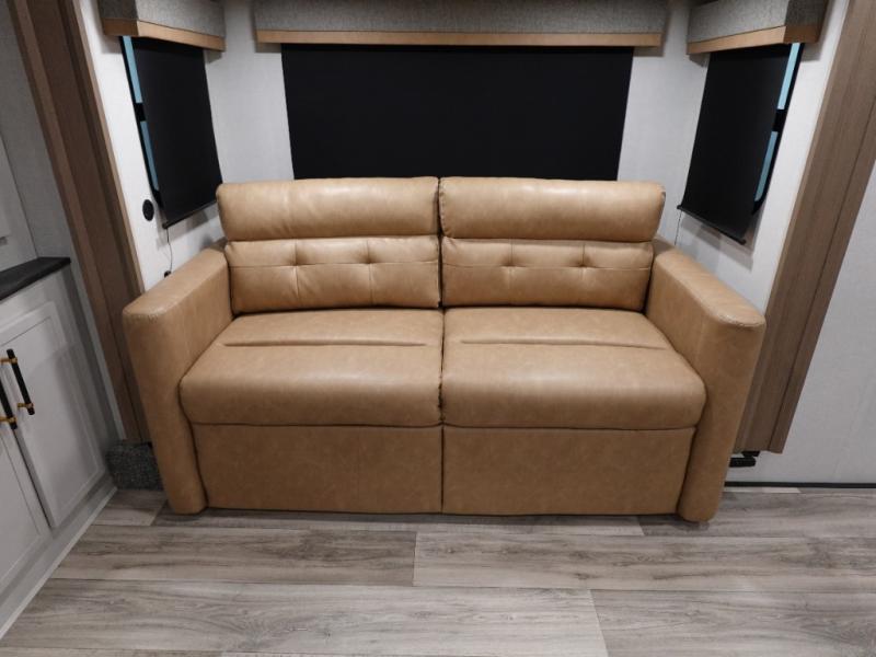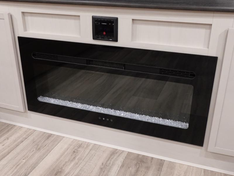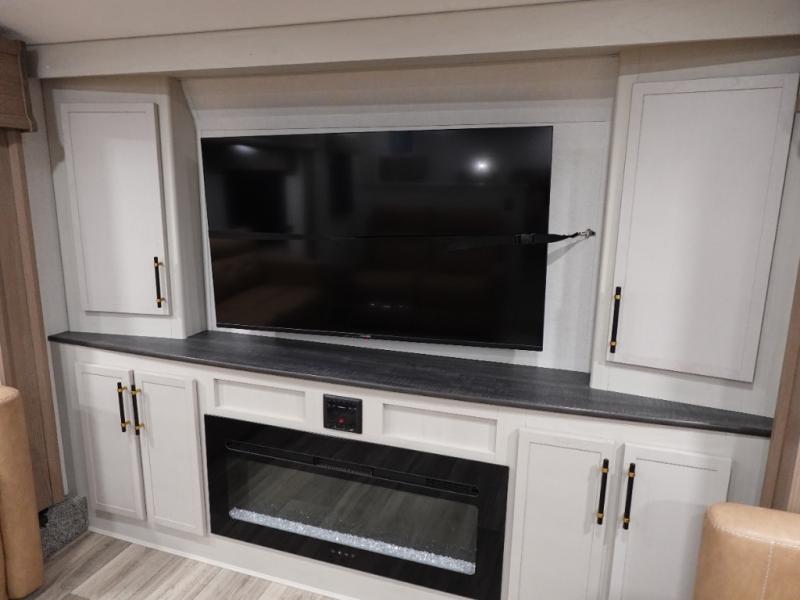 Experience a comfortable camping trip with this fifth wheel! The front living area not only has opposing sofa slides, but also theater seating across from an entertainment center with a 40" fireplace and a HD LED TV. The separate kitchen has everything you will need to prepare delicious home cooked meals including a glass top three burner cooktop with an oven and a kitchen island with a large sink that has a high rise faucet with a sprayer for an easy clean up. There is even a half bathroom by the kitchen so you can use it and quickly get back to cooking. The master suite has a king bed slide for more interior space, an entertainment center for a comfortable movie night, and access to the spacious full rear bathroom with a dual sink vanity, storage and washer/dryer prep!