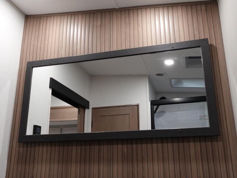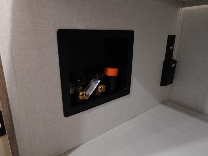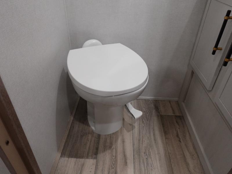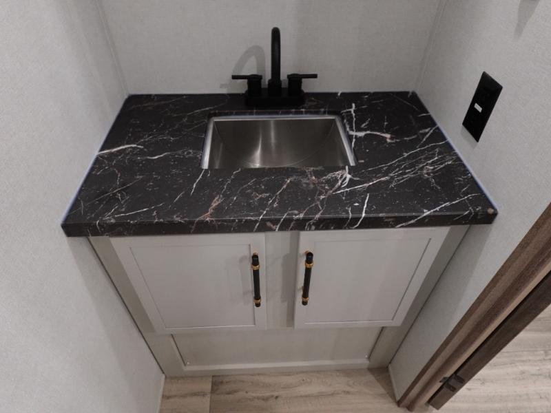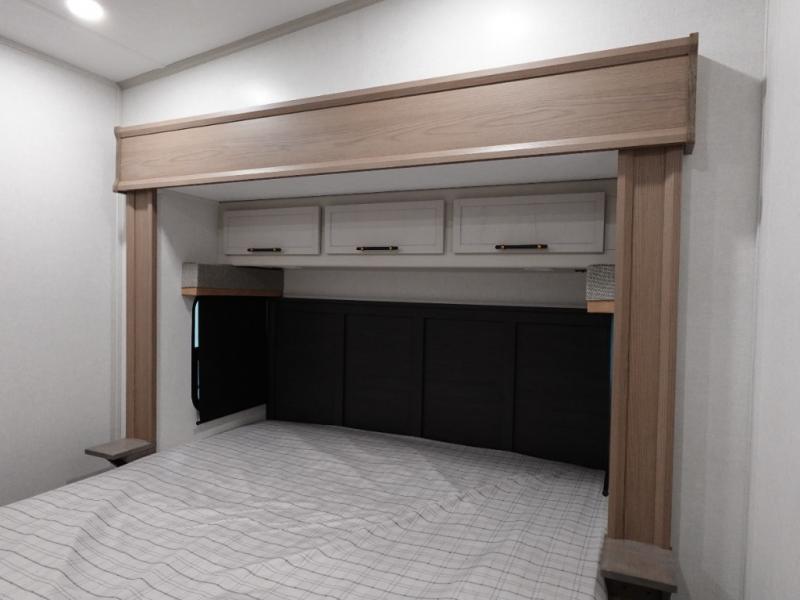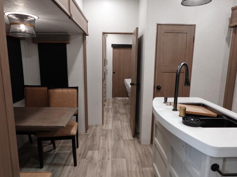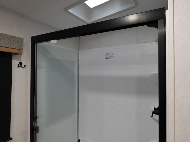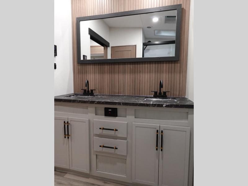 Experience a comfortable camping trip with this fifth wheel! The front living area not only has opposing sofa slides, but also theater seating across from an entertainment center with a 40" fireplace and a HD LED TV. The separate kitchen has everything you will need to prepare delicious home cooked meals including a glass top three burner cooktop with an oven and a kitchen island with a large sink that has a high rise faucet with a sprayer for an easy clean up. There is even a half bathroom by the kitchen so you can use it and quickly get back to cooking. The master suite has a king bed slide for more interior space, an entertainment center for a comfortable movie night, and access to the spacious full rear bathroom with a dual sink vanity, storage and washer/dryer prep!