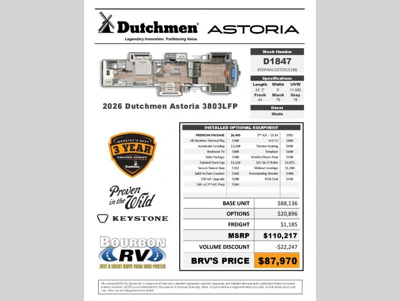 The Astoria fifth wheel by Dutchmen is the next generation of affordable luxury. Whether your perfect getaway is a beach, mountains or big city, feel right at home in your Astoria fifth wheel offering floor plans to fit your unique style. With your Astoria you have the peace of mind of knowing the company that backs it - Dutchmen. Dutchmen has been a leader in the RV industry for decades. Known for dependable quality and consumer-focused value, Dutchmen is a division of Keystone RV Company.