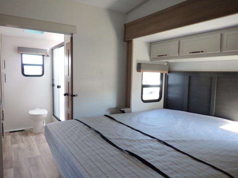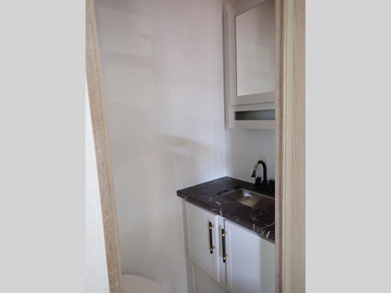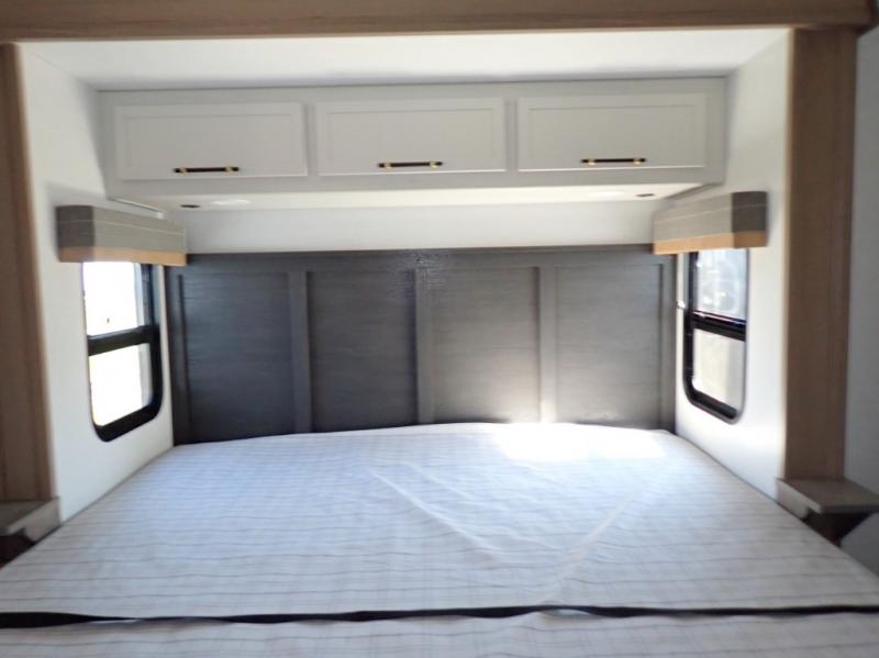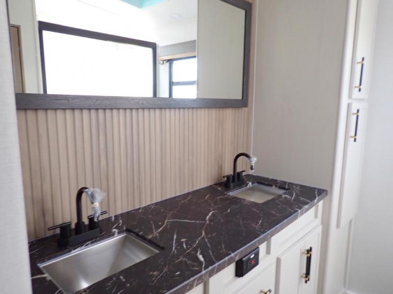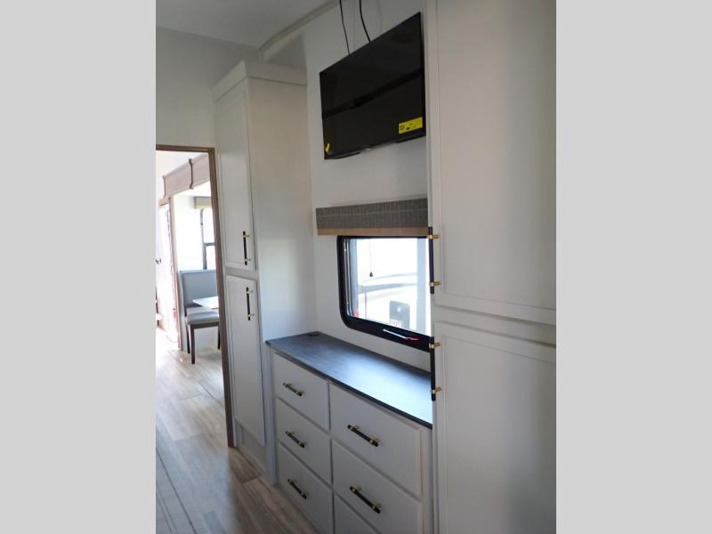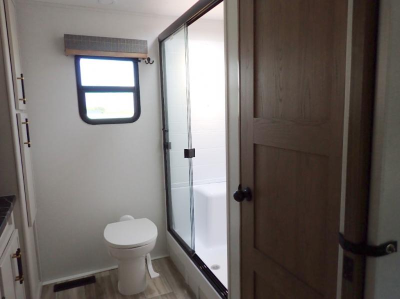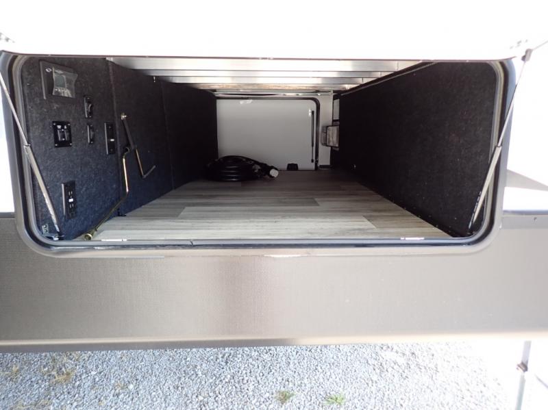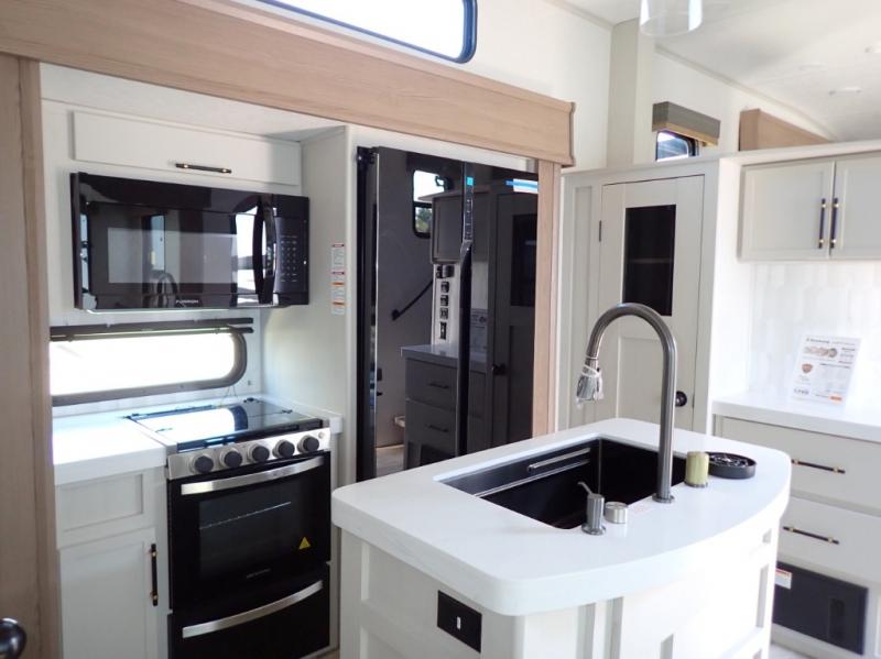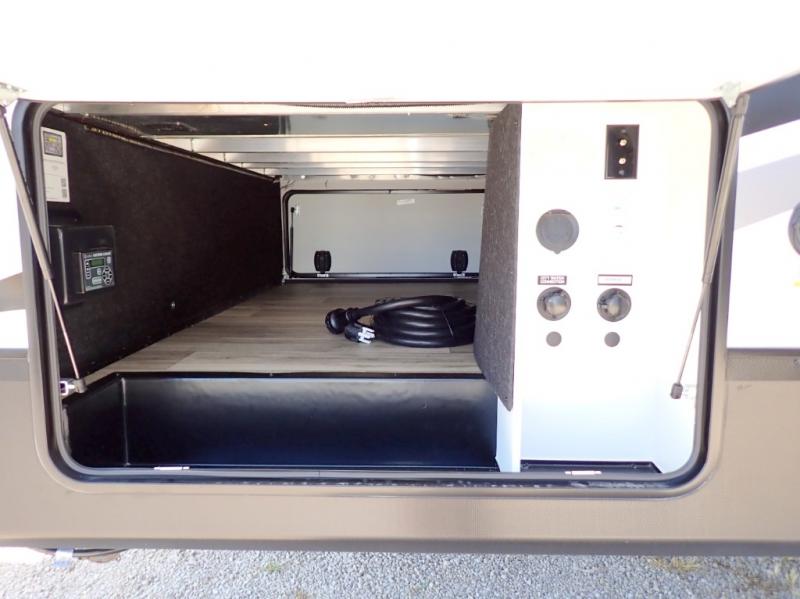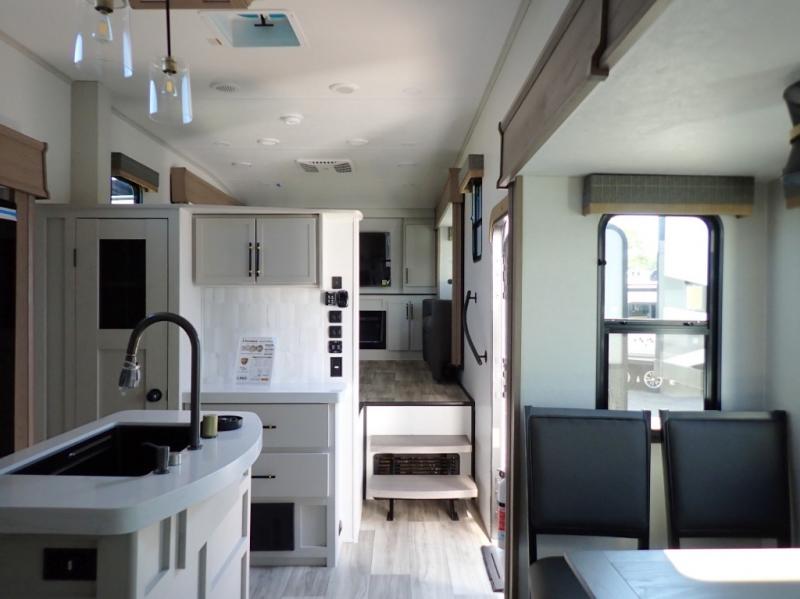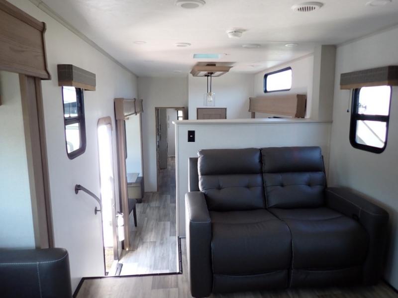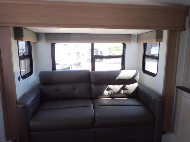 Experience a comfortable camping trip with this fifth wheel! The front living area not only has opposing sofa slides, but also theater seating across from an entertainment center with a 40" fireplace and a HD LED TV. The separate kitchen has everything you will need to prepare delicious home cooked meals including a glass top three burner cooktop with an oven and a kitchen island with a large sink that has a high rise faucet with a sprayer for an easy clean up. There is even a half bathroom by the kitchen so you can use it and quickly get back to cooking. The master suite has a king bed slide for more interior space, an entertainment center for a comfortable movie night, and access to the spacious full rear bathroom with a dual sink vanity, storage and washer/dryer prep!