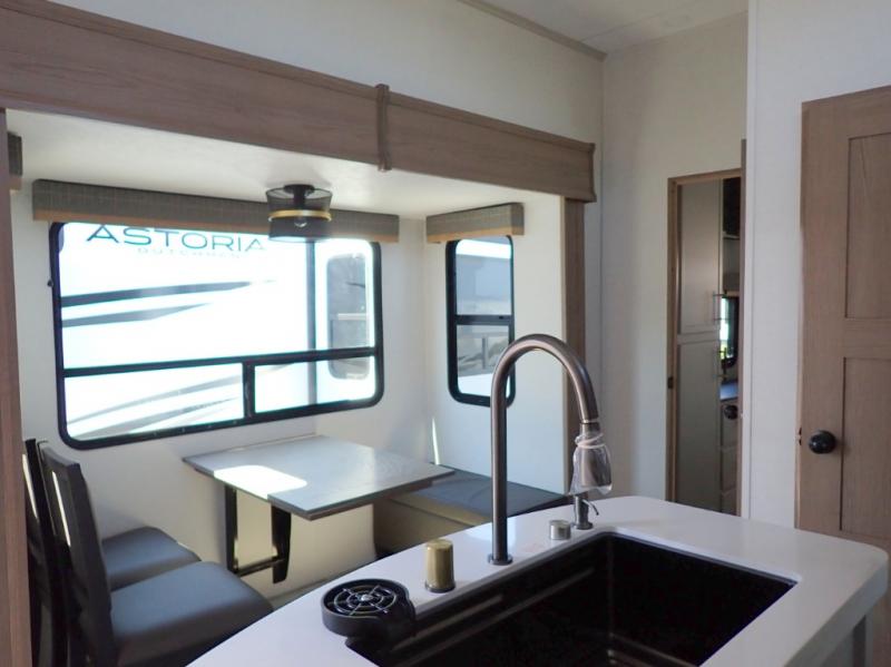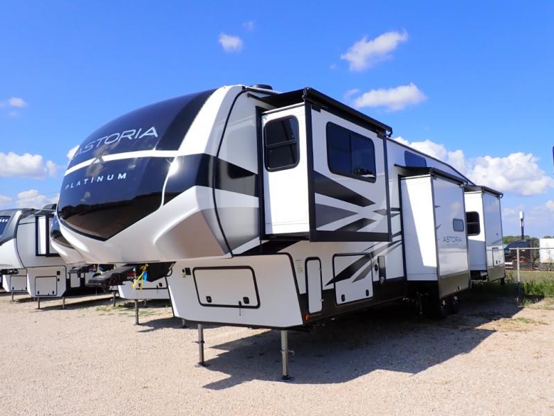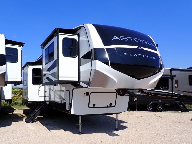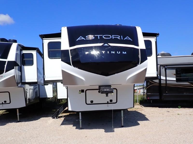 Each one of these Dutchmen RV Astoria Platinum fifth wheels feature a fiberglass exterior for added durability and an All Weather Thermal Package so you can camp all year long! There are also MorRyde Solid entry steps, slam latch baggage doors, and many more exterior conveniences. You'll enjoy a 200W solar panel for off-grid capabilities, slam latch baggage doors, and a power awning with LED lights for an inviting outdoor space. The interior is designed with bathroom backsplash, night shades throughout the living area, and Thomas Payne furniture collection. The on-demand tankless water heater will provide endless hot showers, and the dual ducted A/C will keep you cool all summer long.