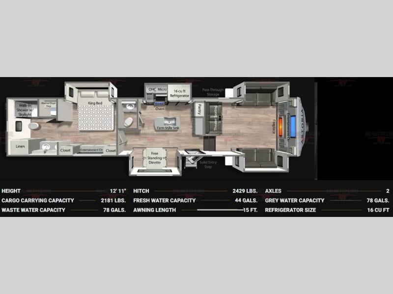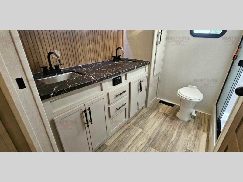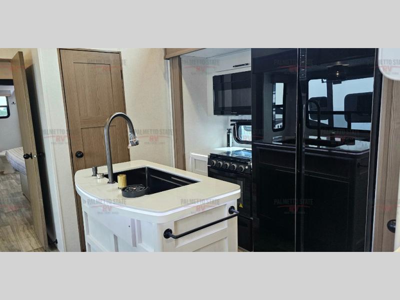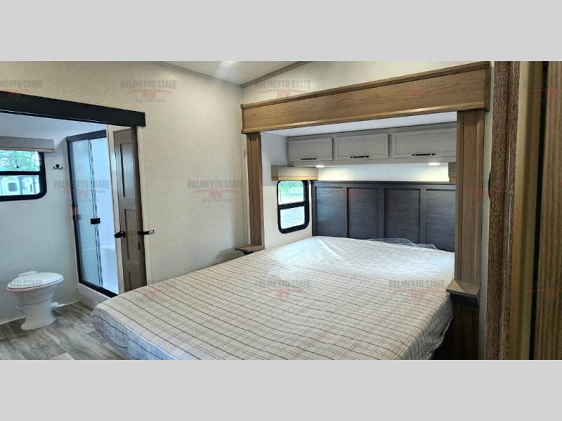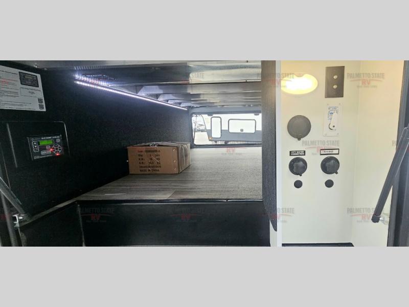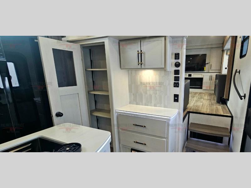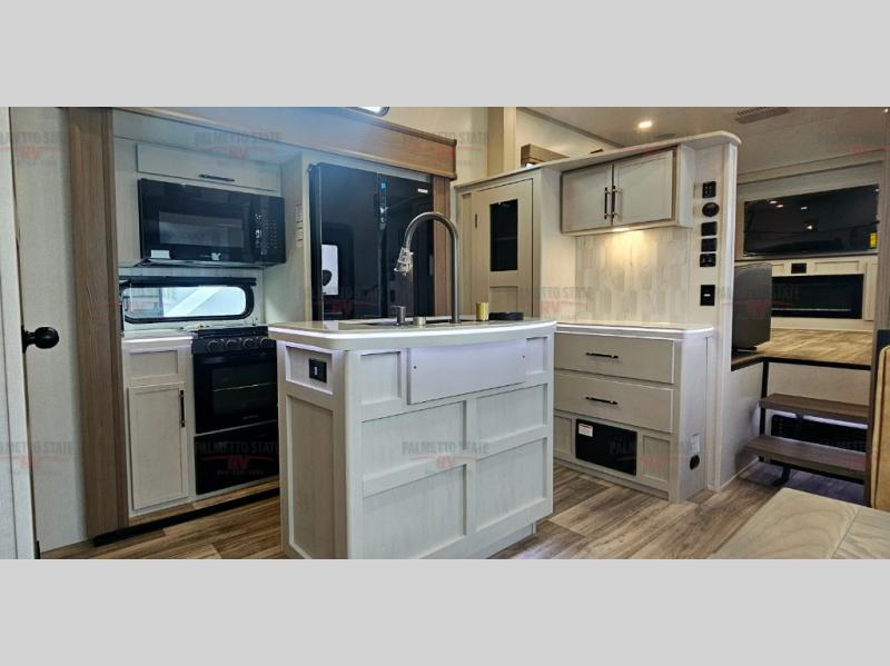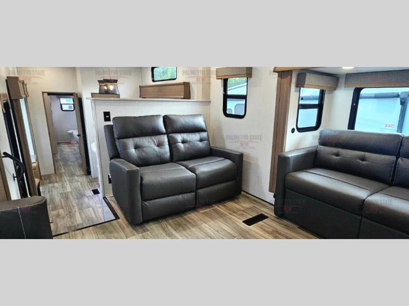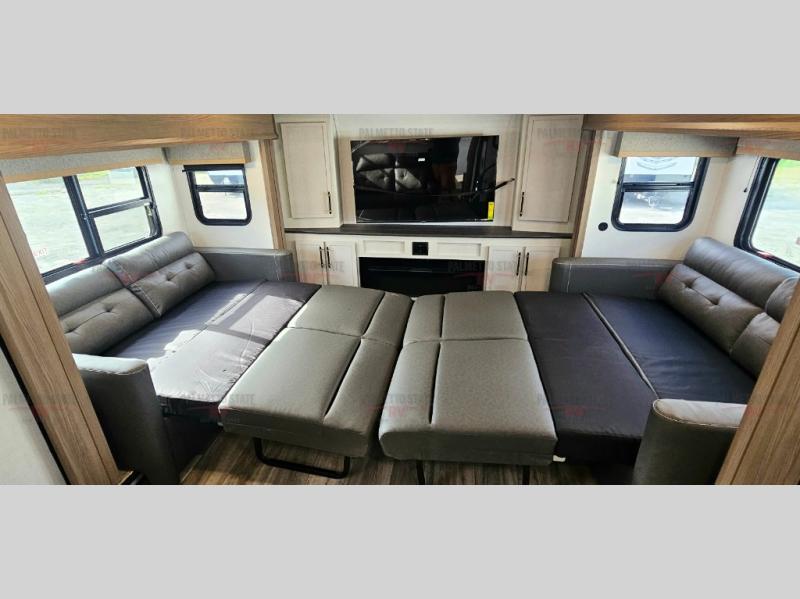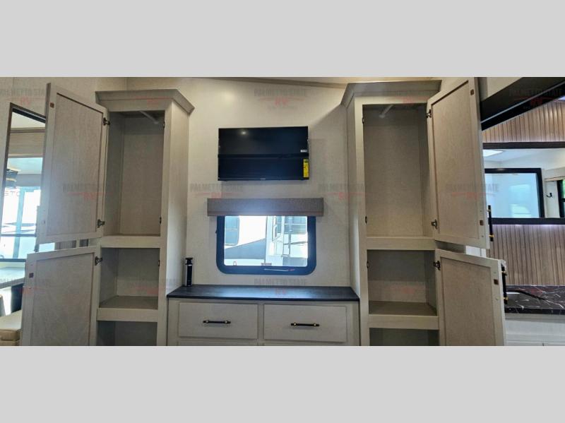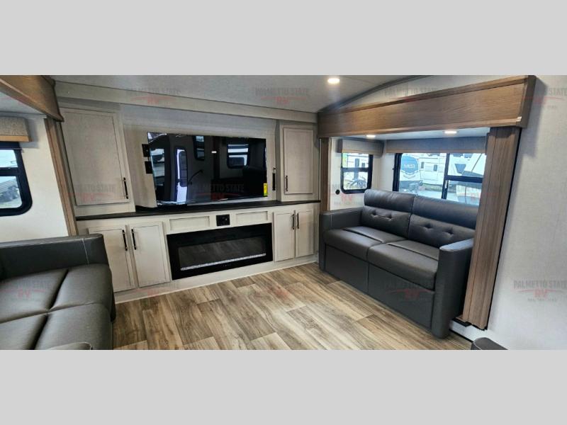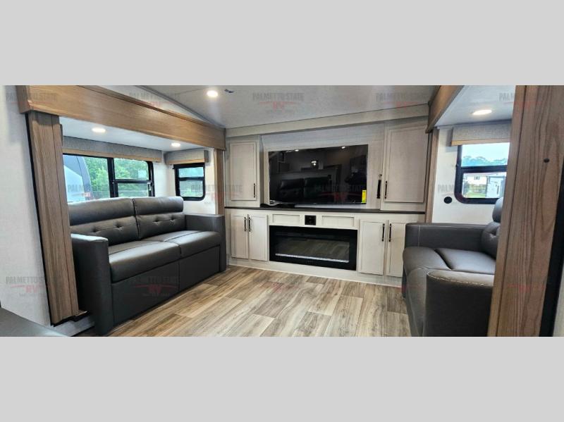 Experience a comfortable camping trip with this fifth wheel! The front living area not only has opposing sofa slides, but also theater seating across from an entertainment center with a 40" fireplace and a HD LED TV. The separate kitchen has everything you will need to prepare delicious home cooked meals including a glass top three burner cooktop with an oven and a kitchen island with a large sink that has a high rise faucet with a sprayer for an easy clean up. There is even a half bathroom by the kitchen so you can use it and quickly get back to cooking. The master suite has a king bed slide for more interior space, an entertainment center for a comfortable movie night, and access to the spacious full rear bathroom with a dual sink vanity, storage and washer/dryer prep!