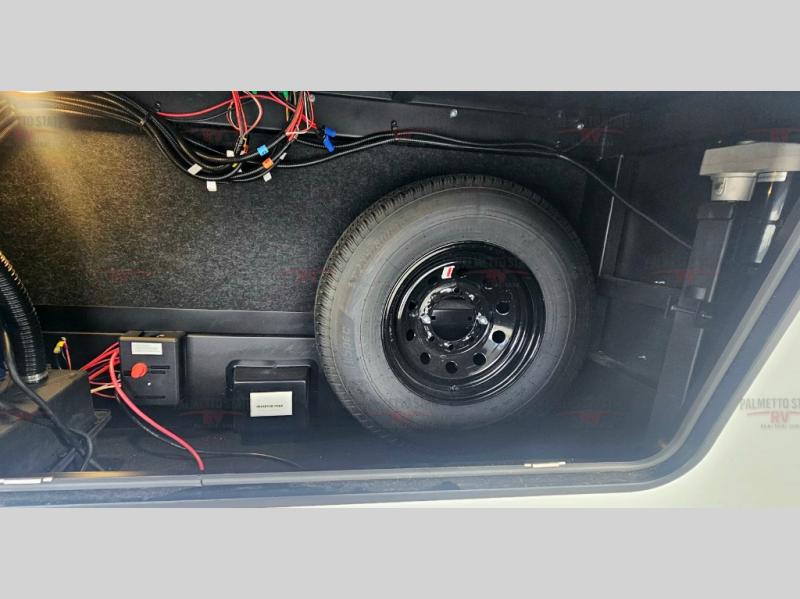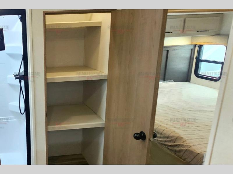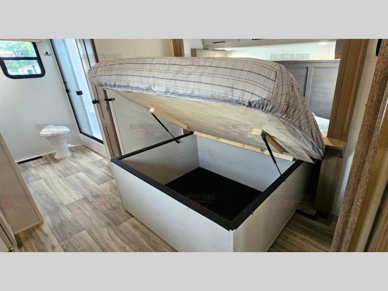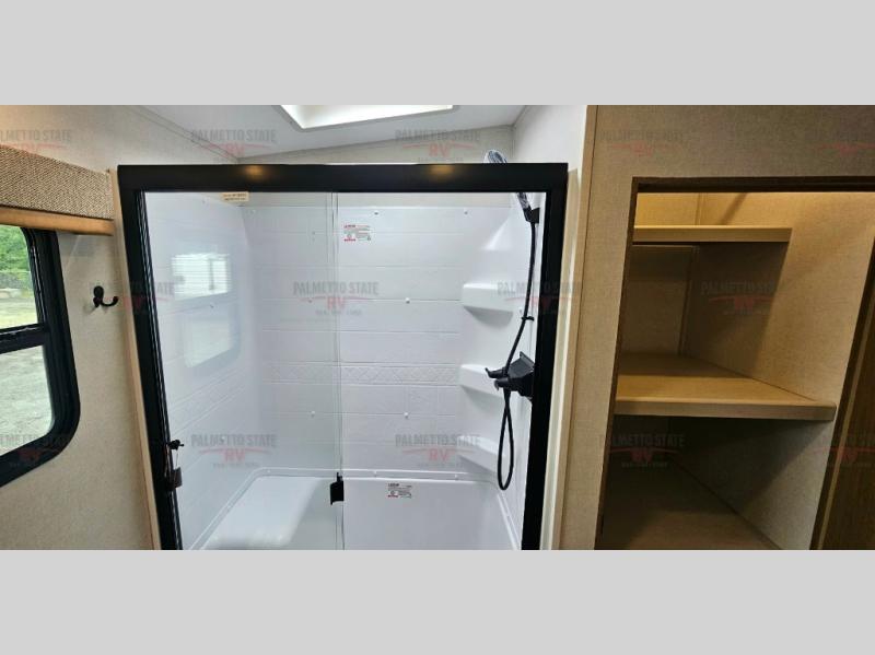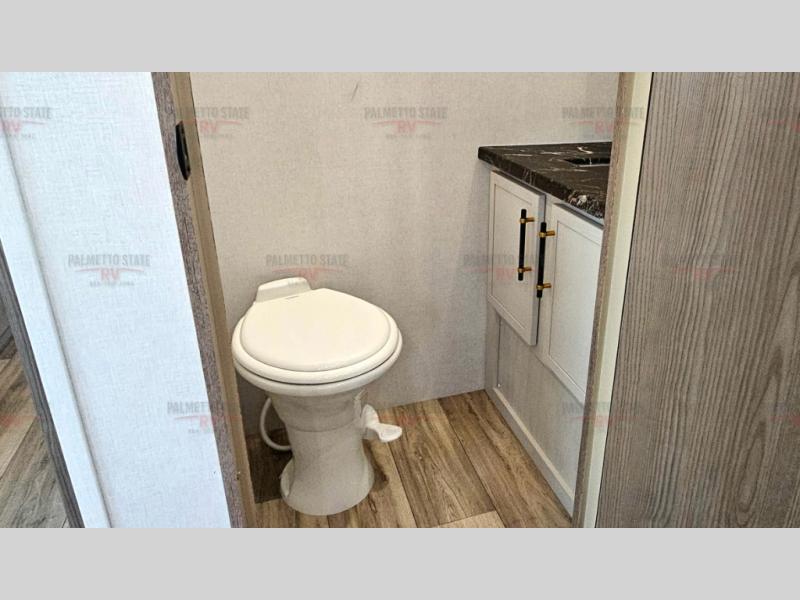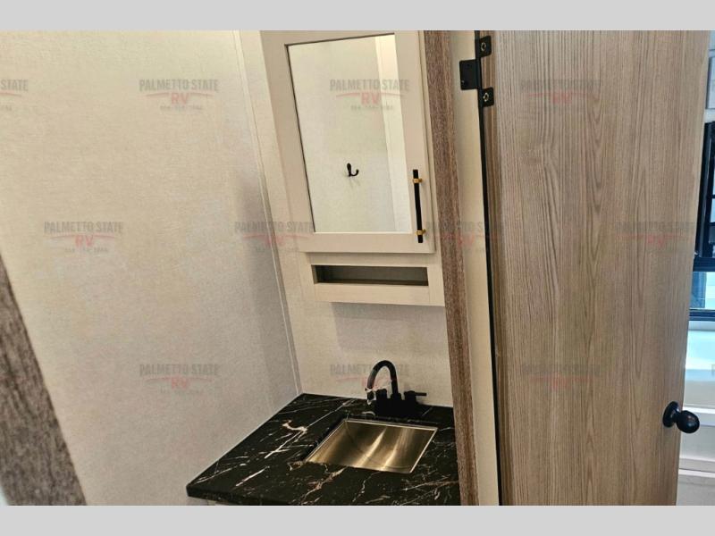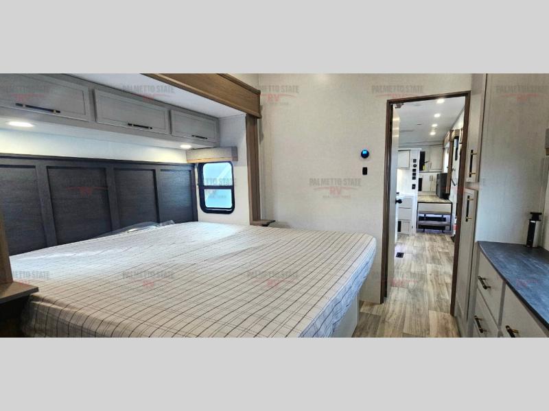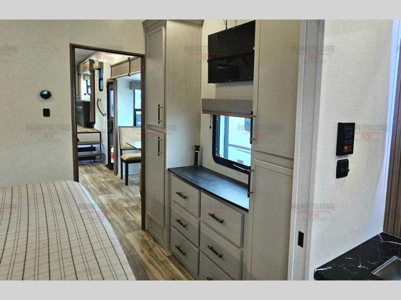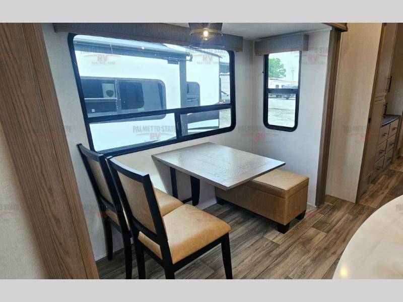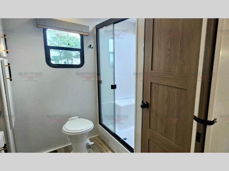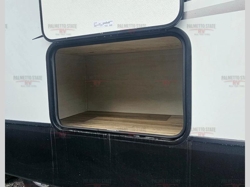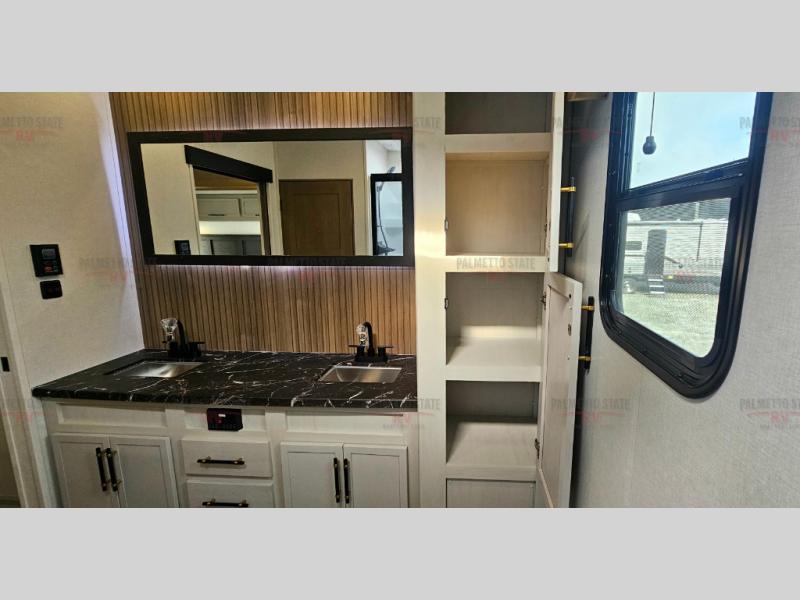 Experience a comfortable camping trip with this fifth wheel! The front living area not only has opposing sofa slides, but also theater seating across from an entertainment center with a 40" fireplace and a HD LED TV. The separate kitchen has everything you will need to prepare delicious home cooked meals including a glass top three burner cooktop with an oven and a kitchen island with a large sink that has a high rise faucet with a sprayer for an easy clean up. There is even a half bathroom by the kitchen so you can use it and quickly get back to cooking. The master suite has a king bed slide for more interior space, an entertainment center for a comfortable movie night, and access to the spacious full rear bathroom with a dual sink vanity, storage and washer/dryer prep!
