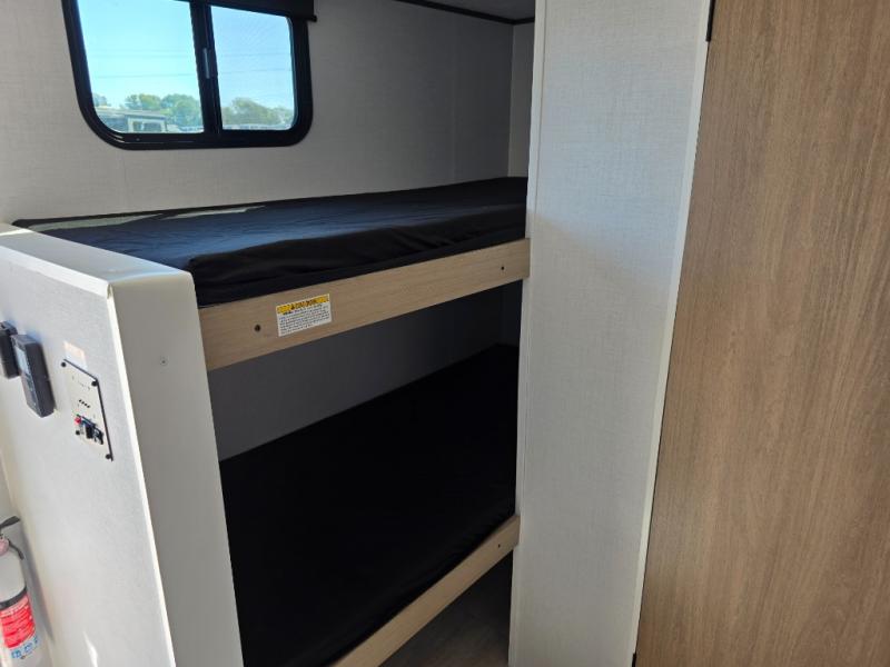 A perfect trailer for your family of three to five featuring a set of bunk beds for the kids or guests, a queen bed up front for you, and the booth dinette can be converted to sleep one or two more depending on size. This unit is cozy and convenient providing you just what you need to enjoy a little adventure away from home. For meals, there is a cooktop and sink, plus a refrigerator for your perishables. You will all appreciate the convenience of having your own private bath so that you don't need to use the campground facilities at night. You will also enjoy spending time outside with an 8' awning to provide even more living space outdoors!