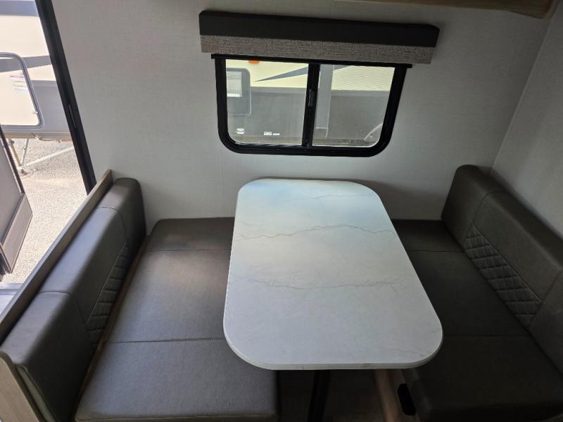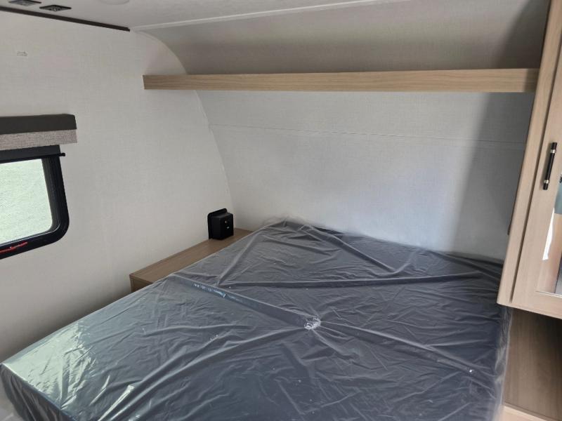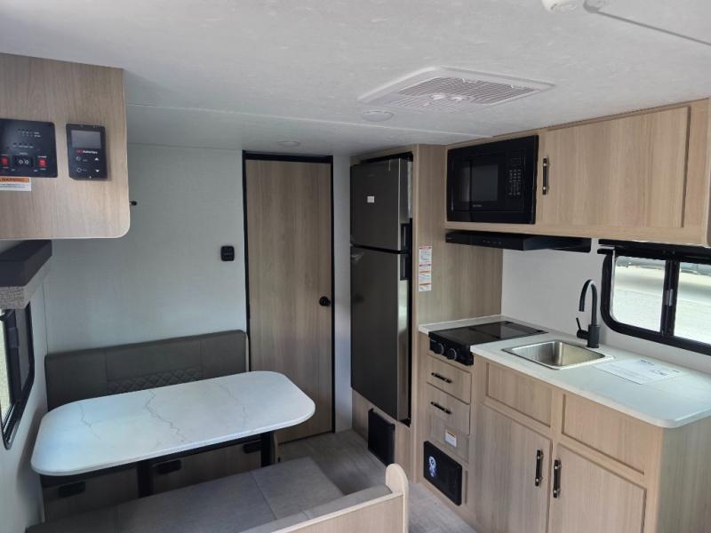 This single axle travel trailer is the perfect couple's trailer with space for an overnight guest on the booth dinette. The queen bed up front will provide a great night's rest instead of sleeping on an air mattress, and the full rear bath means you won't have to use the camp's facilities at night. You'll also find a 3.3 cu. ft. 12V refrigerator for food storage, a two burner cooktop, plus a microwave oven for all your cooking needs!