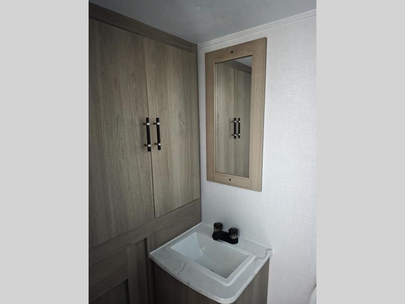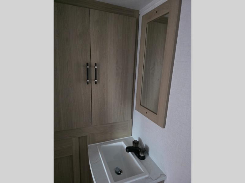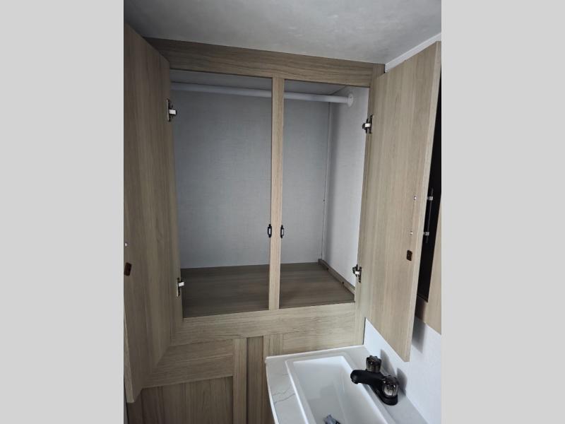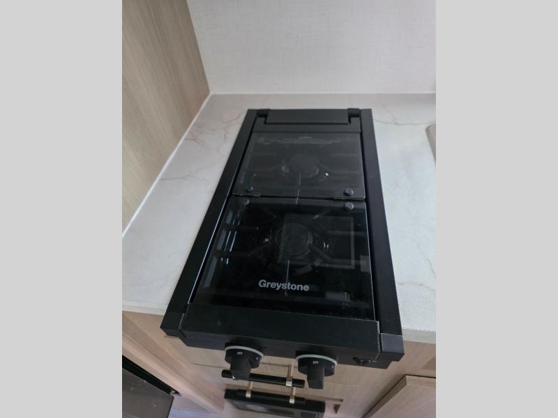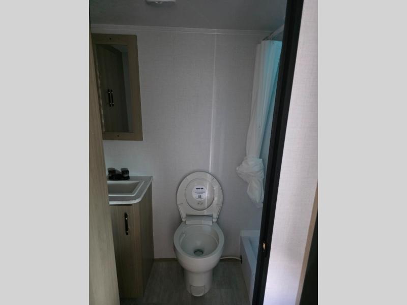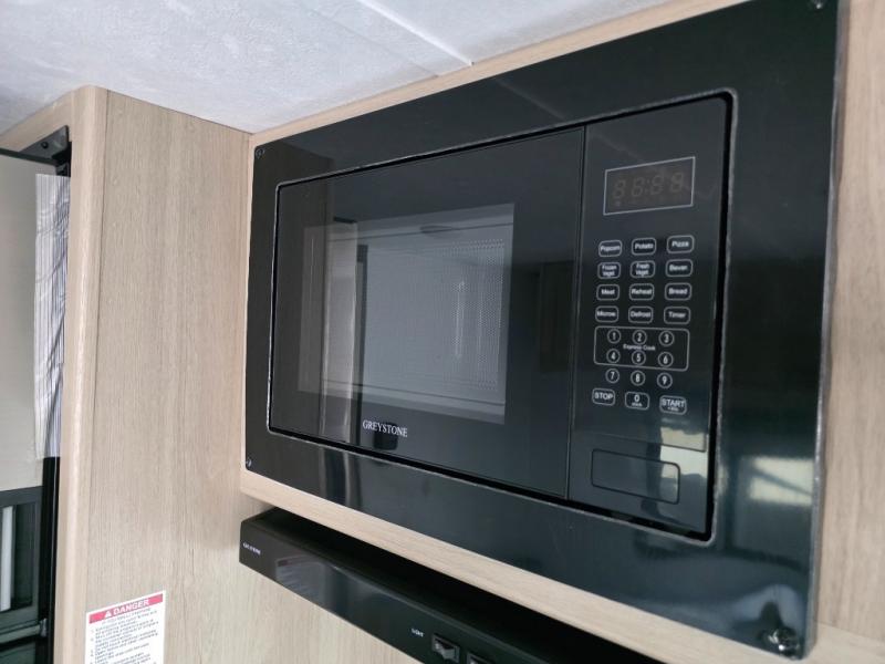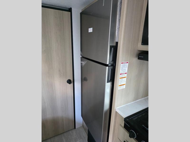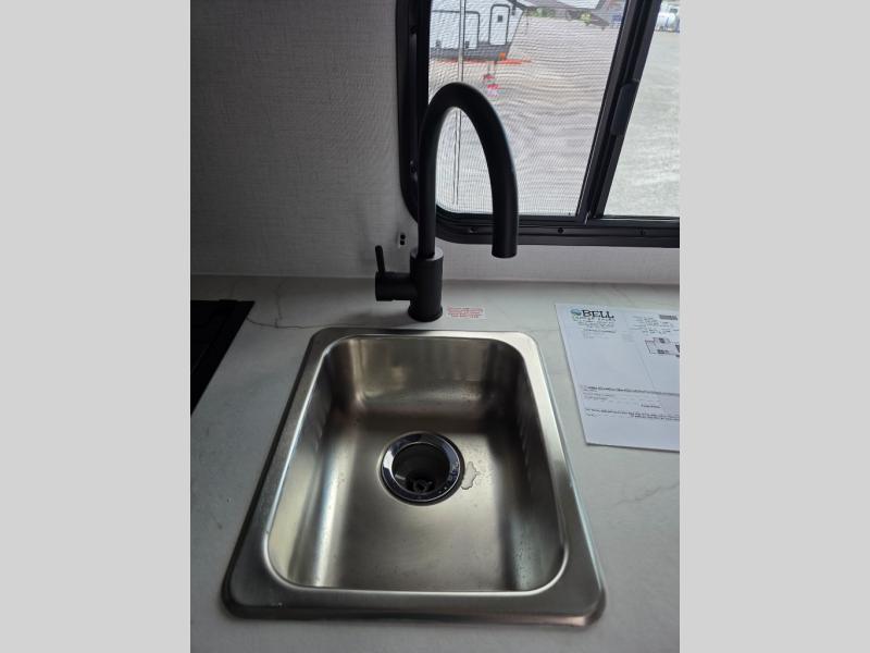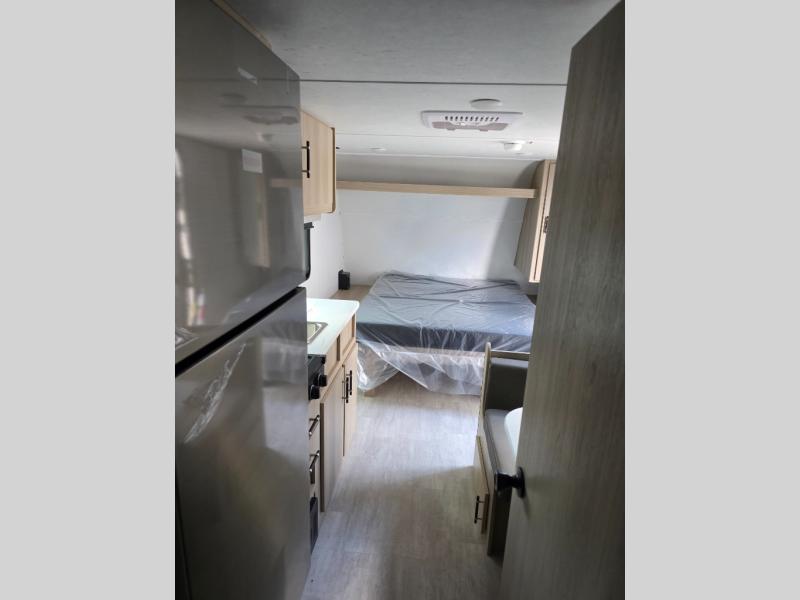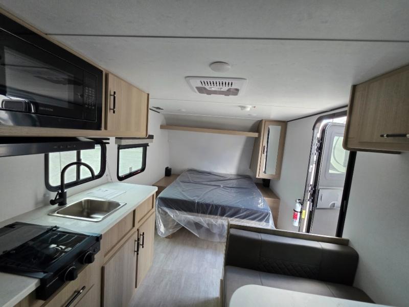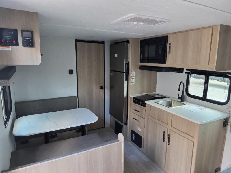 This single axle travel trailer is the perfect couple's trailer with space for an overnight guest on the booth dinette. The queen bed up front will provide a great night's rest instead of sleeping on an air mattress, and the full rear bath means you won't have to use the camp's facilities at night. You'll also find a 3.3 cu. ft. 12V refrigerator for food storage, a two burner cooktop, plus a microwave oven for all your cooking needs!
