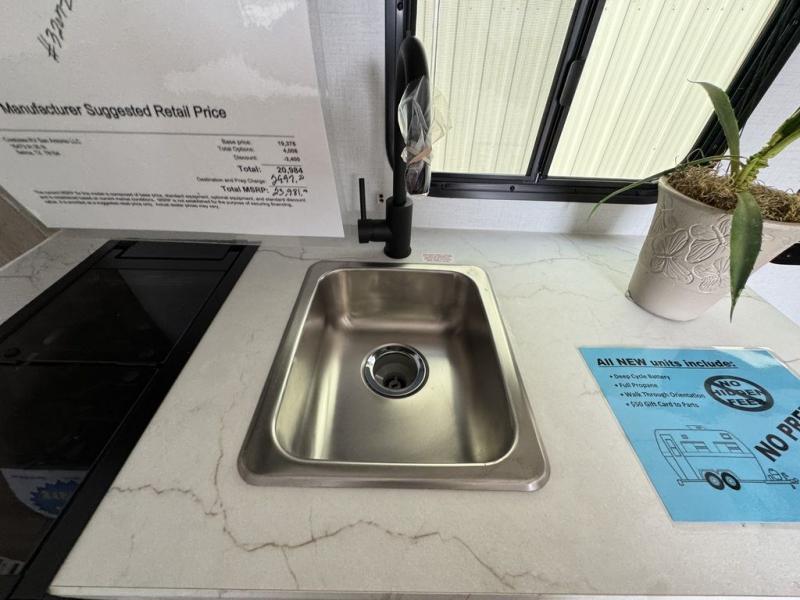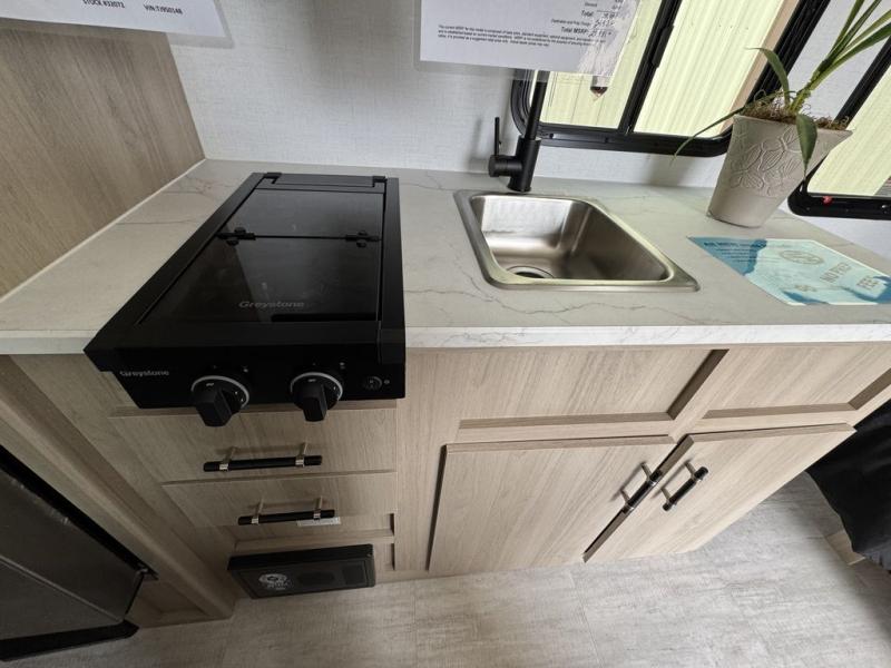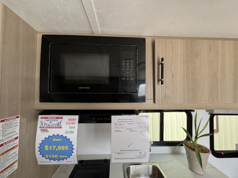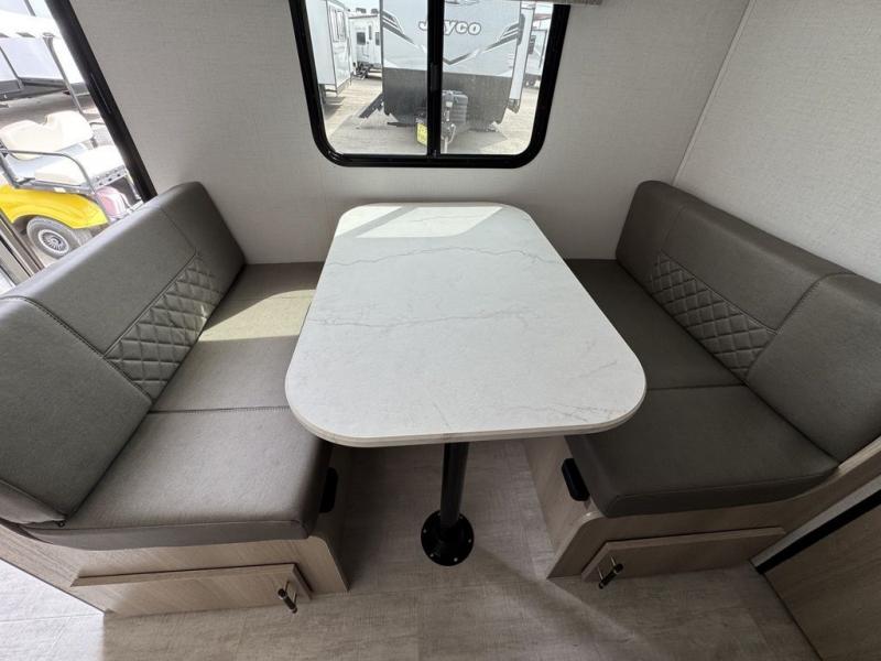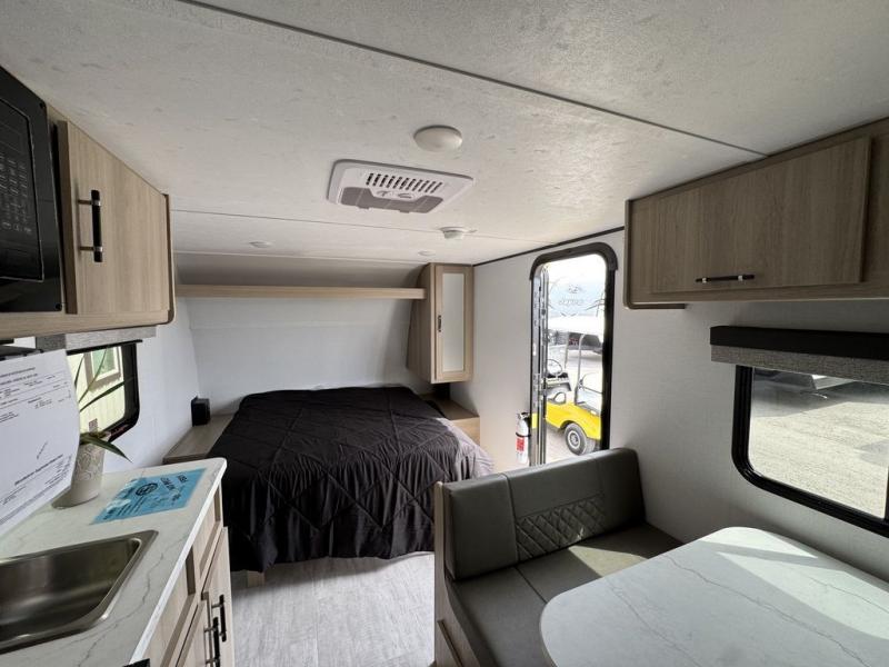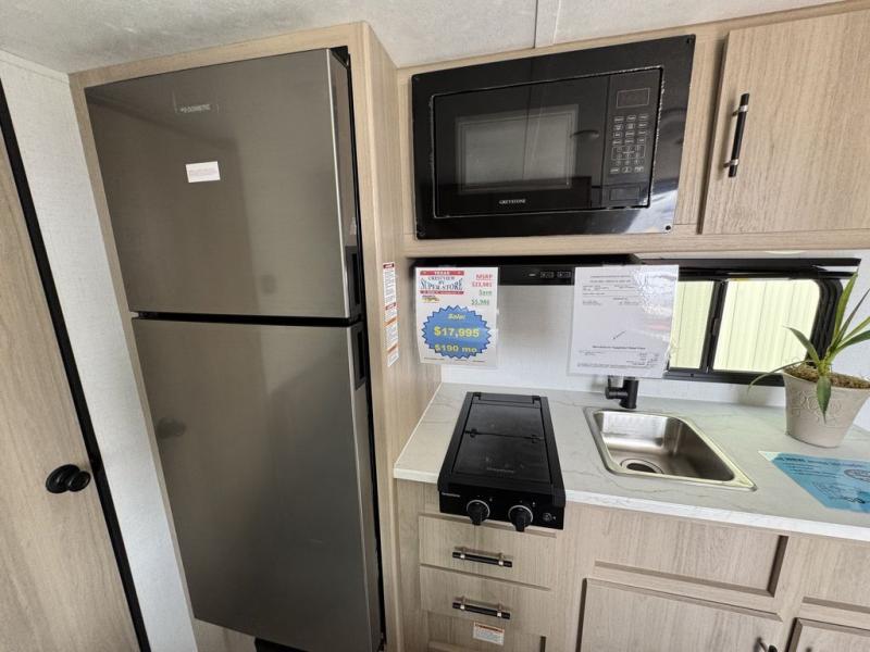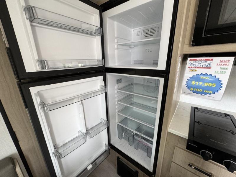 This single axle travel trailer is the perfect couple's trailer with space for an overnight guest on the booth dinette. The queen bed up front will provide a great night's rest instead of sleeping on an air mattress, and the full rear bath means you won't have to use the camp's facilities at night. You'll also find a 3.3 cu. ft. 12V refrigerator for food storage, a two burner cooktop, plus a microwave oven for all your cooking needs!