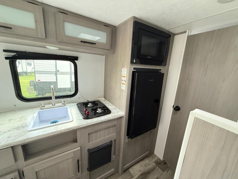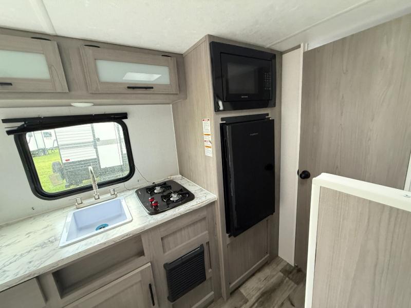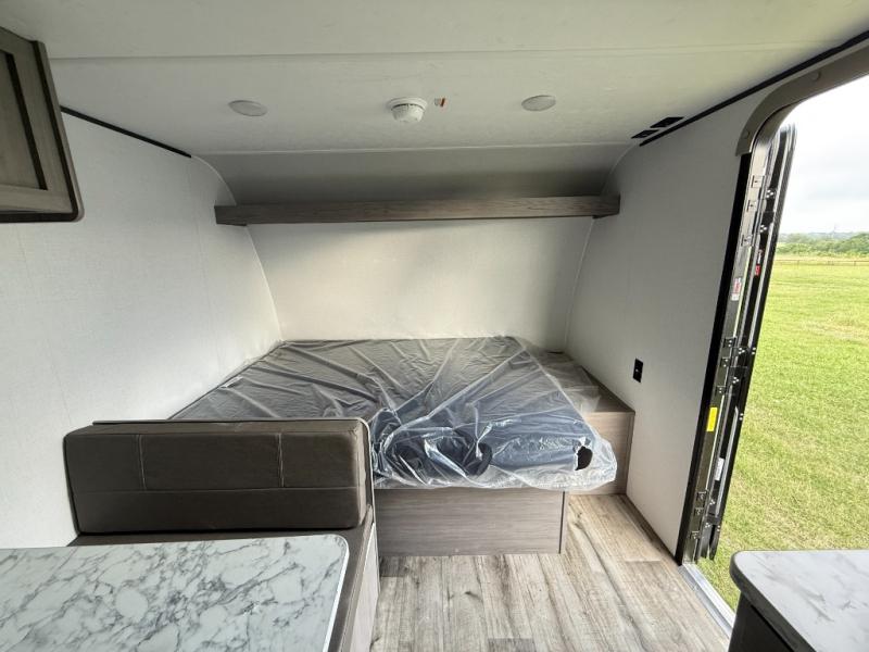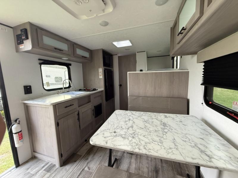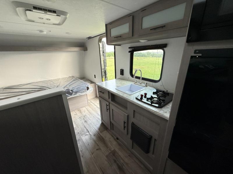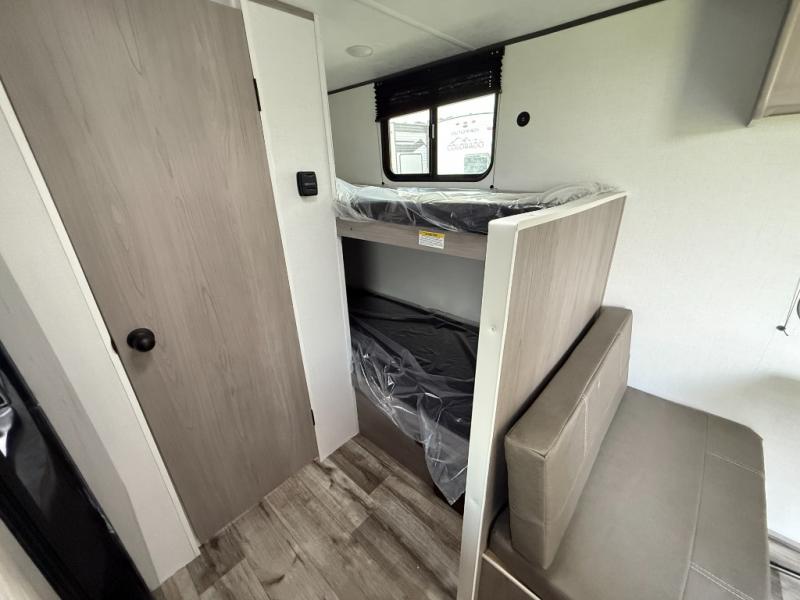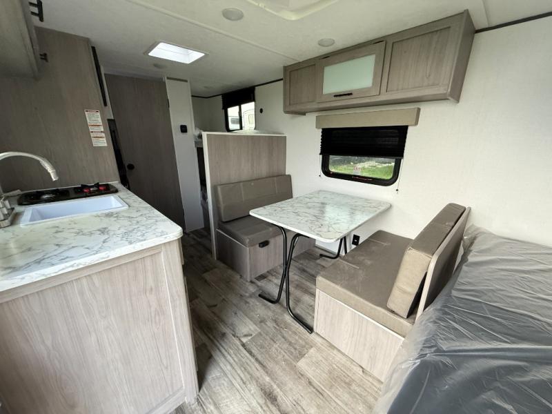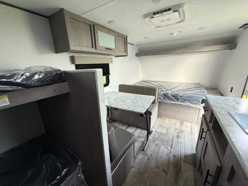 A perfect trailer for your family of three to five featuring a set of bunk beds for the kids or guests, a queen bed up front for you, and the booth dinette can be converted to sleep one or two more depending on size. This unit is cozy and convenient providing you just what you need to enjoy a little adventure away from home. For meals, there is a cooktop and sink, plus a refrigerator for your perishables. You will all appreciate the convenience of having your own private bath so that you don't need to use the campground facilities at night. You will also enjoy spending time outside with an 8' awning to provide even more living space outdoors!