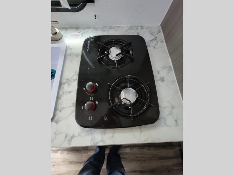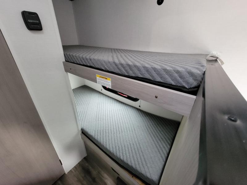 A perfect trailer for your family of three to five featuring a set of bunk beds for the kids or guests, a queen bed up front for you, and the booth dinette can be converted to sleep one or two more depending on size. This unit is cozy and convenient providing you just what you need to enjoy a little adventure away from home. For meals, there is a two burner cooktop and sink, plus a 3.3 cu. ft. 12V refrigerator for your perishables. You will all appreciate the convenience of having your own private bath so that you don't need to use the campground facilities at night. You will also enjoy spending time outside with an 8' power awning to provide even more living space outdoors!