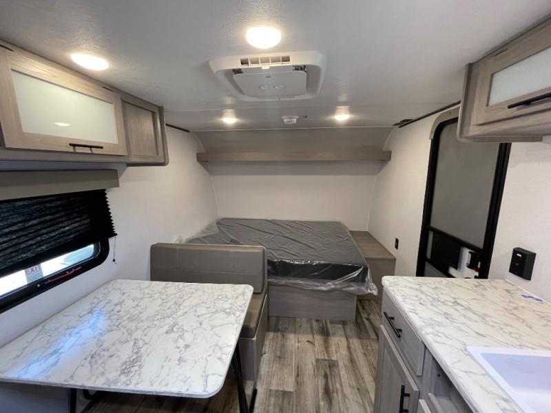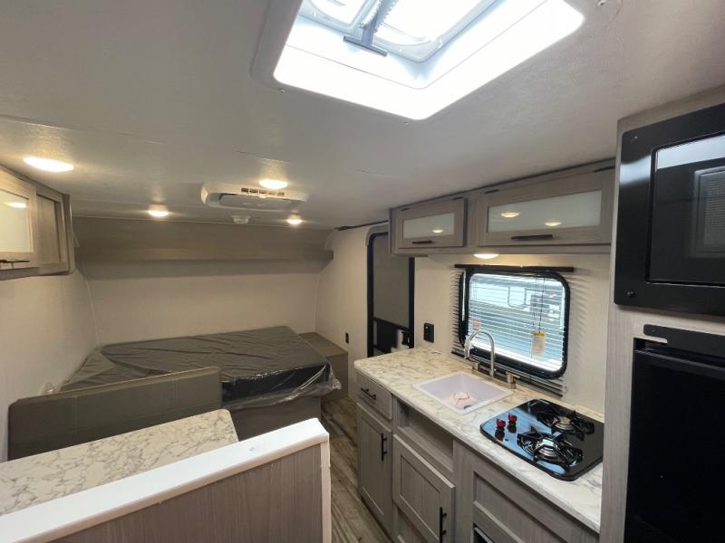 A perfect trailer for your family of three to five featuring a set of bunk beds for the kids or guests, a queen bed up front for you, and the booth dinette can be converted to sleep one or two more depending on size. This unit is cozy and convenient providing you just what you need to enjoy a little adventure away from home. For meals, there is a two burner cooktop and sink, plus a 3.3 cu. ft. 12V refrigerator for your perishables. You will all appreciate the convenience of having your own private bath so that you don't need to use the campground facilities at night. You will also enjoy spending time outside with an 8' power awning to provide even more living space outdoors!