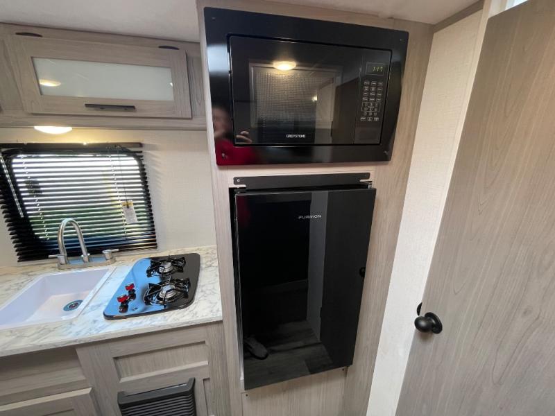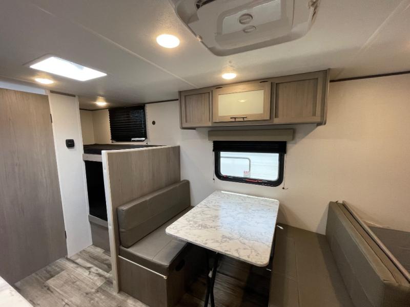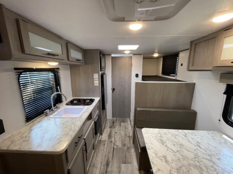 A perfect trailer for your family of three to five featuring a set of bunk beds for the kids or guests, a queen bed up front for you, and the booth dinette can be converted to sleep one or two more depending on size. This unit is cozy and convenient providing you just what you need to enjoy a little adventure away from home. For meals, there is a two burner cooktop and sink, plus a 3.3 cu. ft. 12V refrigerator for your perishables. You will all appreciate the convenience of having your own private bath so that you don't need to use the campground facilities at night. You will also enjoy spending time outside with an 8' power awning to provide even more living space outdoors!