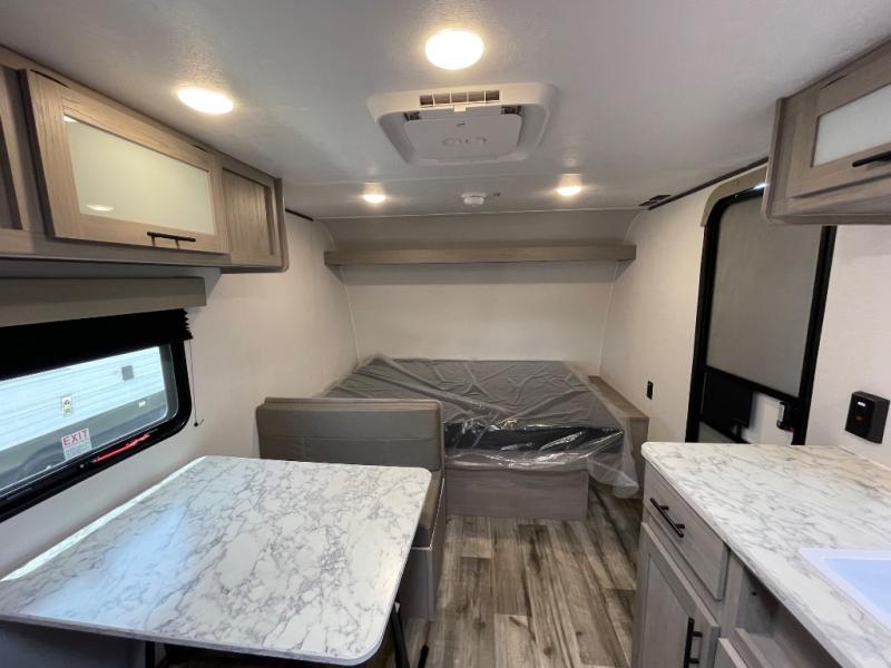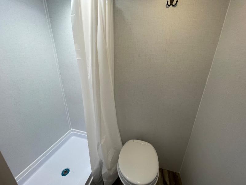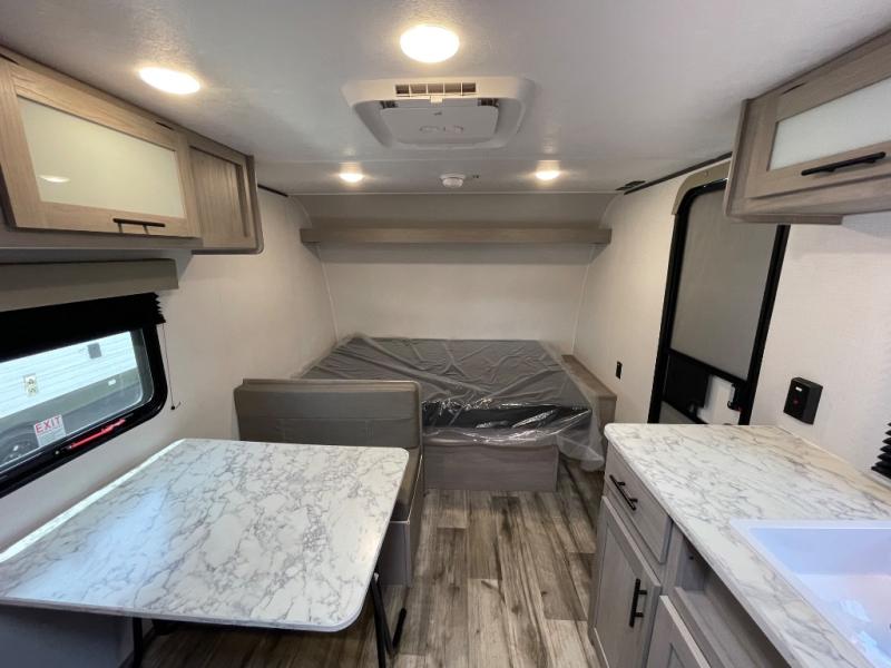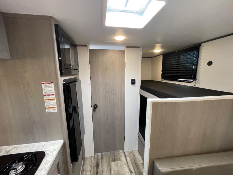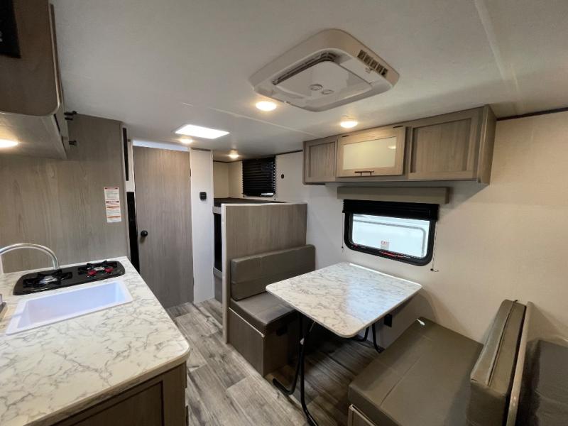 A perfect trailer for your family of three to five featuring a set of bunk beds for the kids or guests, a queen bed up front for you, and the booth dinette can be converted to sleep one or two more depending on size. This unit is cozy and convenient providing you just what you need to enjoy a little adventure away from home. For meals, there is a two burner cooktop and sink, plus a 3.3 cu. ft. 12V refrigerator for your perishables. You will all appreciate the convenience of having your own private bath so that you don't need to use the campground facilities at night. You will also enjoy spending time outside with an 8' power awning to provide even more living space outdoors!
