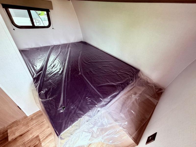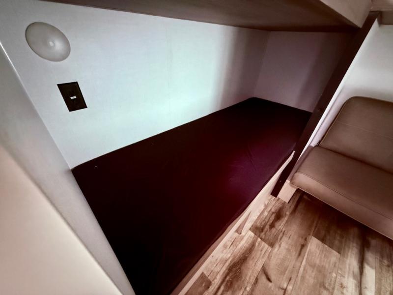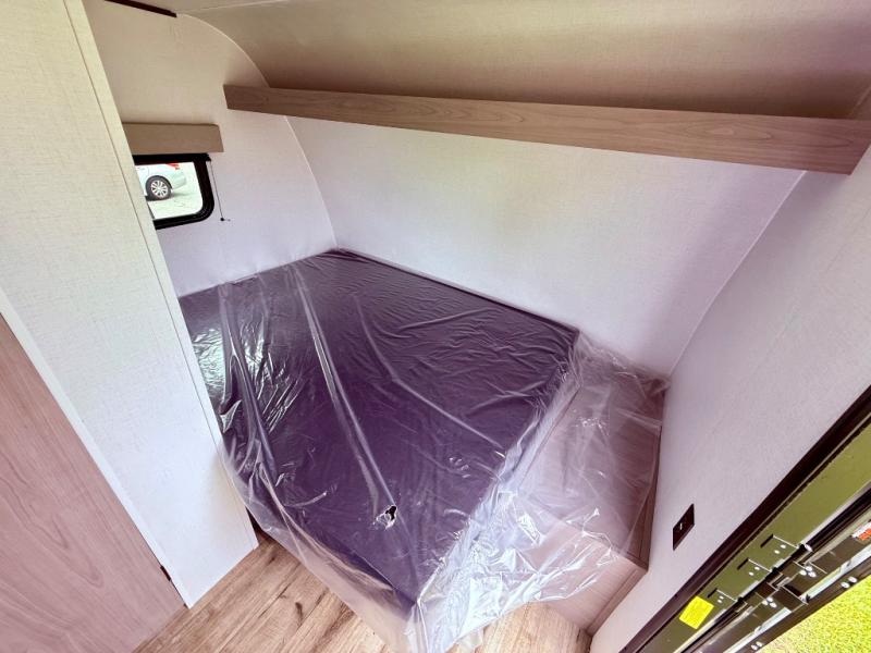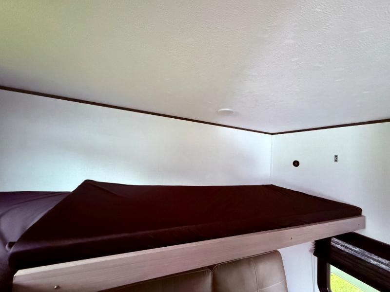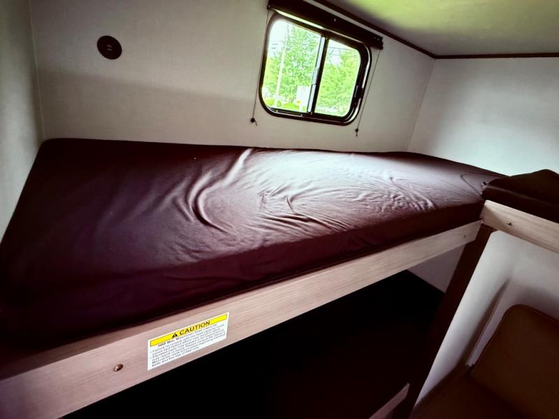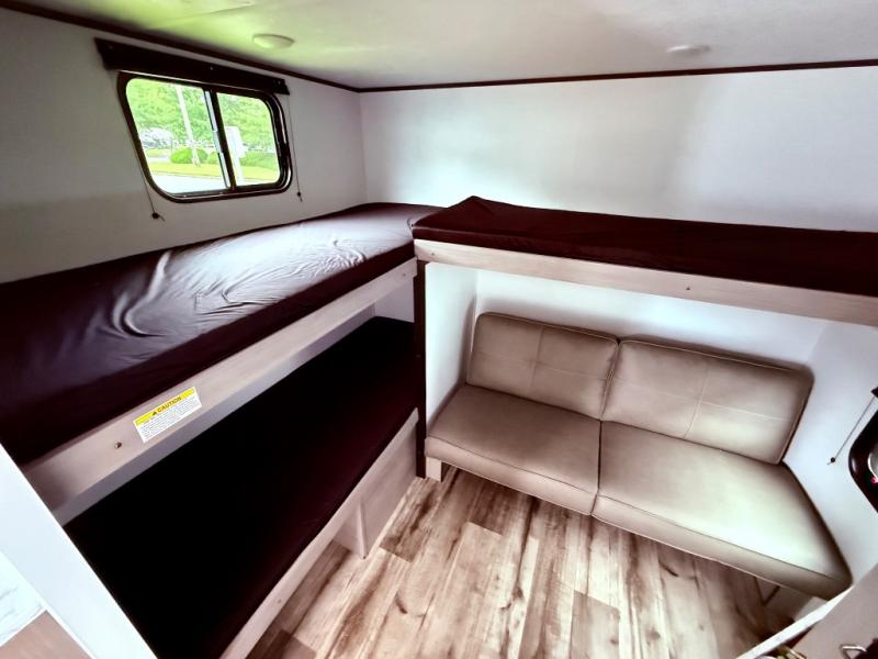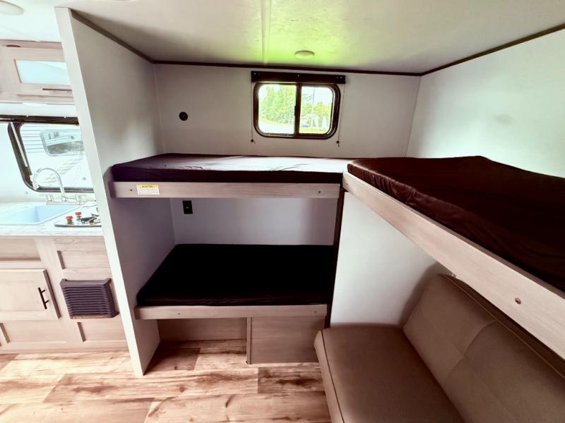 Your whole crew is sure to love this travel trailer since there are two 20" x 74" bunk beds plus a 28" x 66" bunk above a sofa in the back! You can claim the front RV queen bed to yourselves, which gives everyone their own space at night. The fully equipped kitchen will let you make your best campground meals, and there is a spacious kitchen overhead cabinet for spices or dishes. This unit also includes a full bath with a 30" x 36" shower, a toilet, plus a vanity with a medicine cabinet to keep necessities close by!