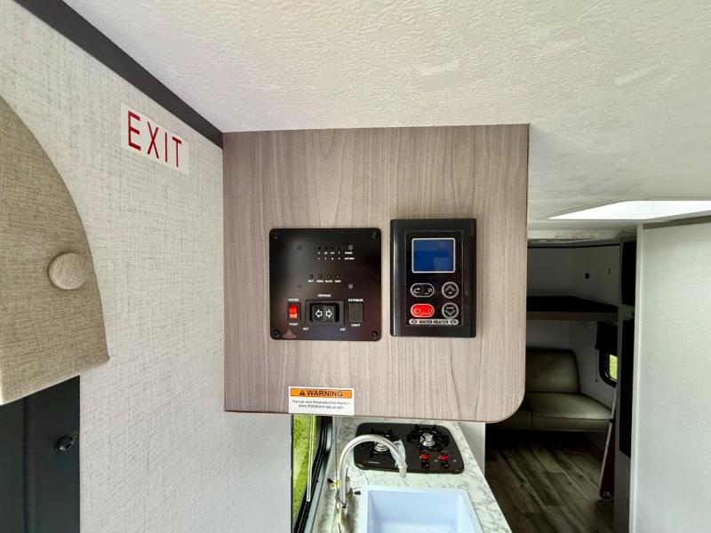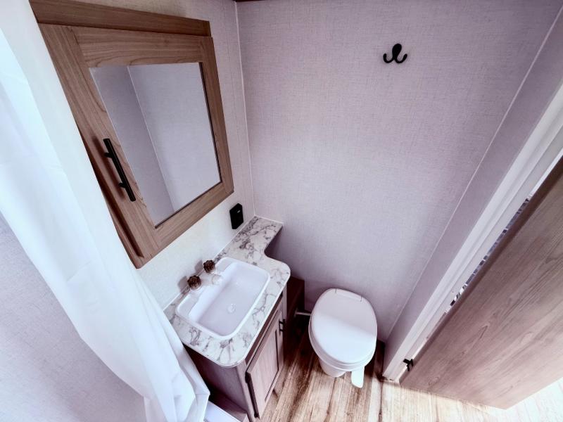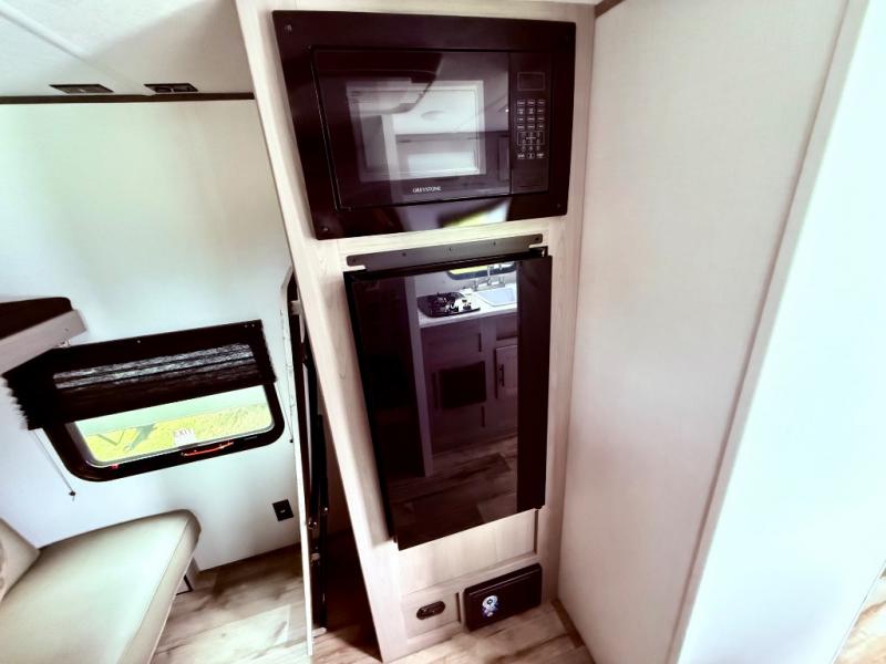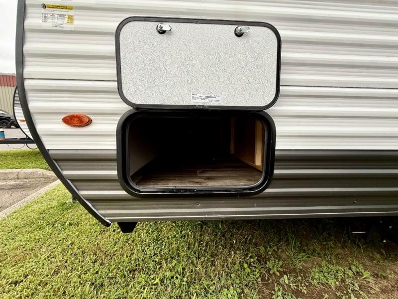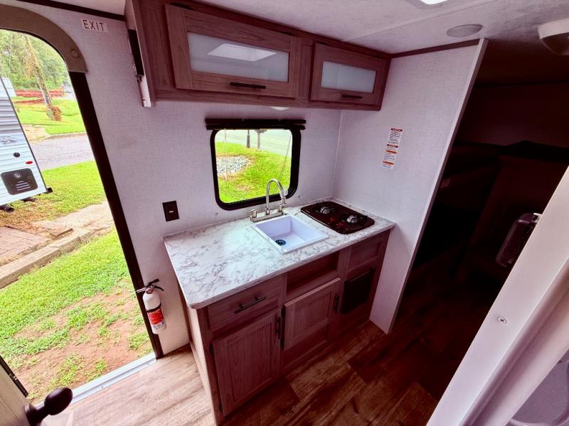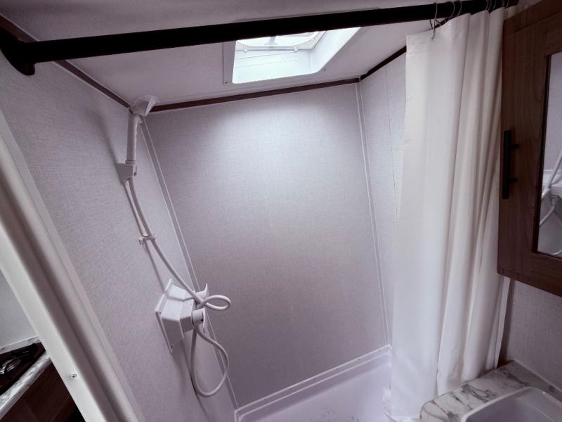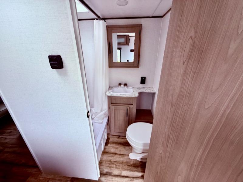 Your whole crew is sure to love this travel trailer since there are two 20" x 74" bunk beds plus a 28" x 66" bunk above a sofa in the back! You can claim the front RV queen bed to yourselves, which gives everyone their own space at night. The fully equipped kitchen will let you make your best campground meals, and there is a spacious kitchen overhead cabinet for spices or dishes. This unit also includes a full bath with a 30" x 36" shower, a toilet, plus a vanity with a medicine cabinet to keep necessities close by!